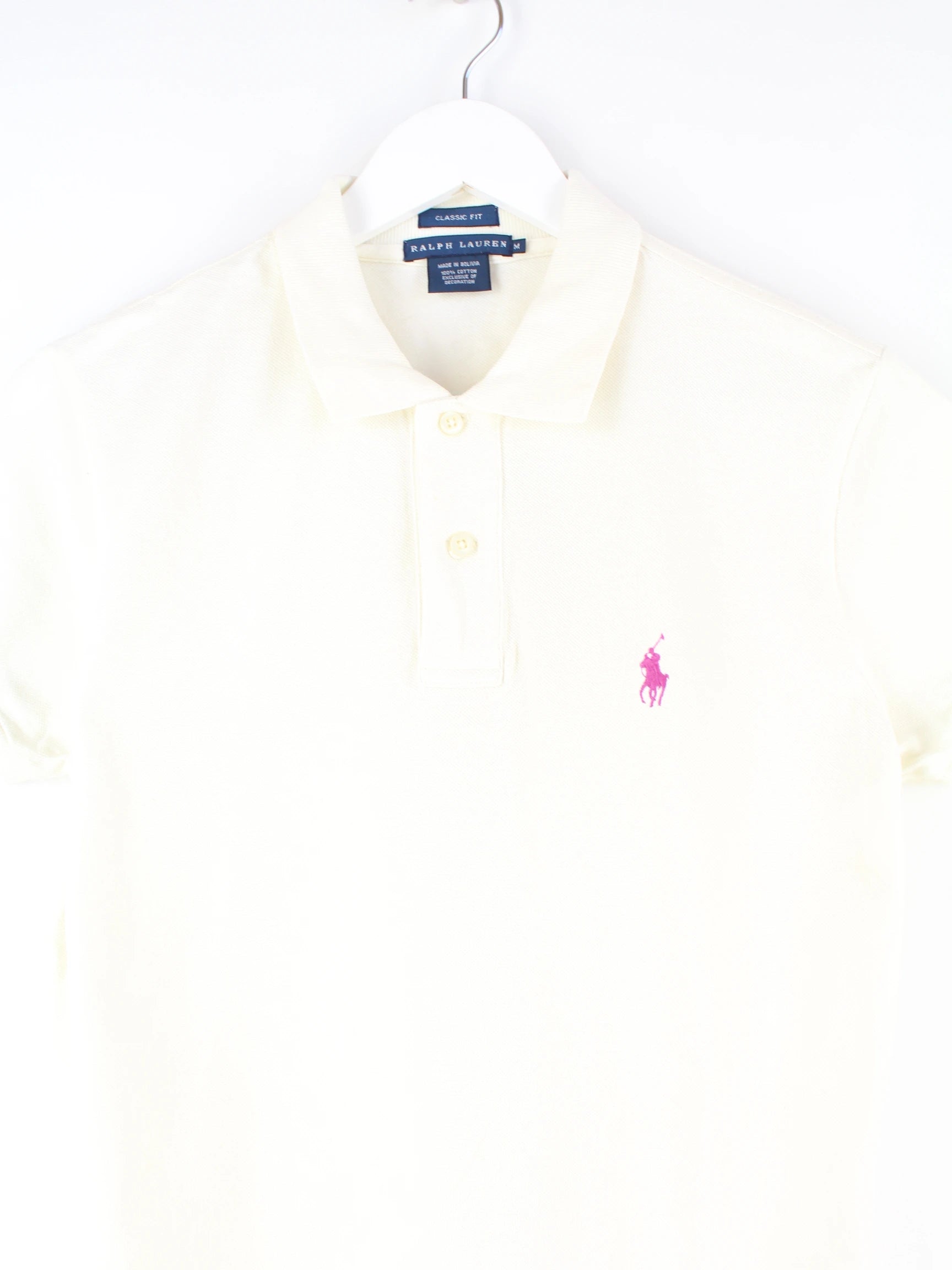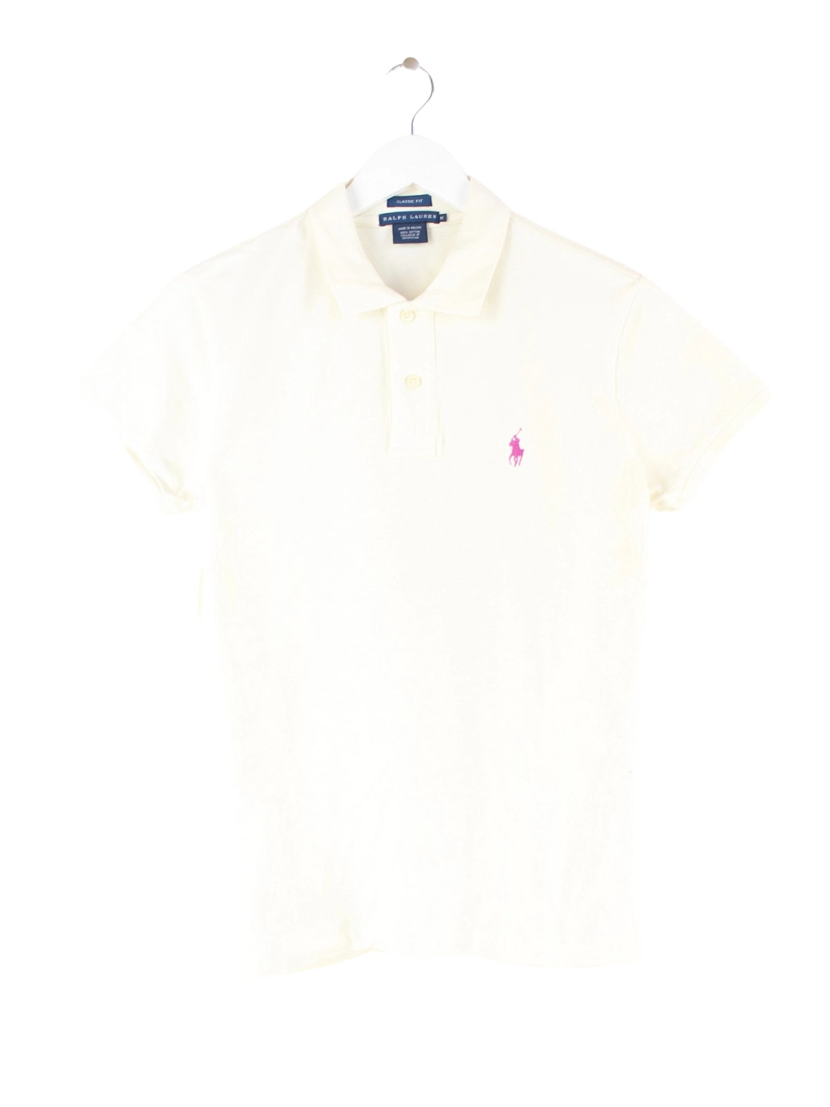 Weißes Poloshirt des Labels Ralph Lauren in Größe M. Es ist aus Baumwolle und in sehr gutem Zustand bei uns zu bekommen.