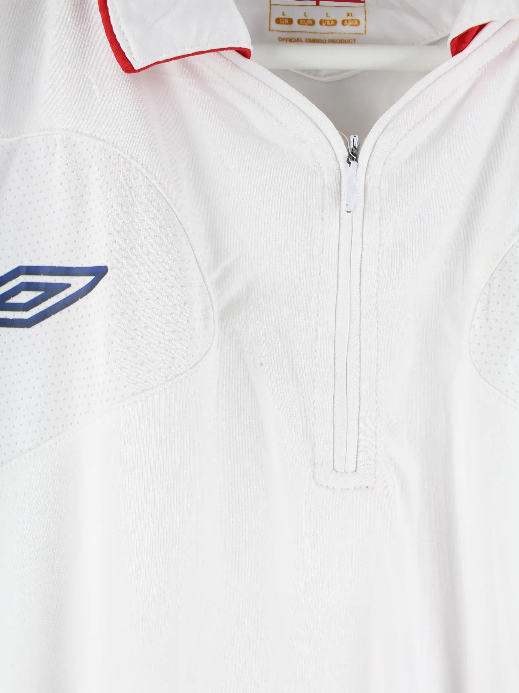 Trikot von Umbro mit halbem Reißverschluß in Größe L. Es ist aus Synthetik und in Weiß in Stock.