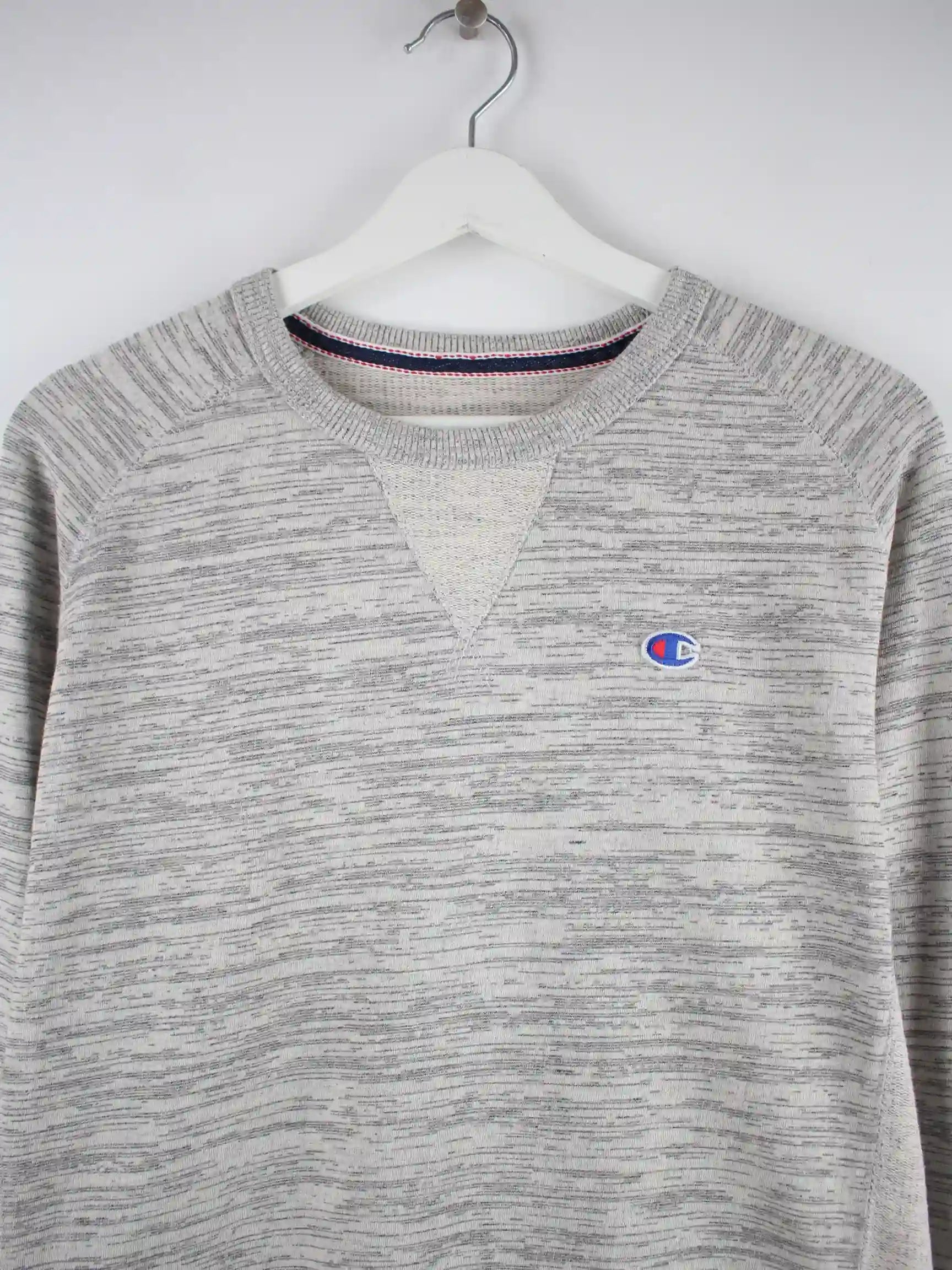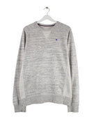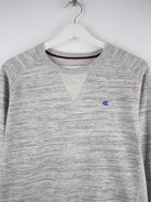 Grauer Sweater von Champion in Größe M. Er ist aus einer Baumwollmischung angefertigt und in sehr gutem Zustand bei uns vorrätig.