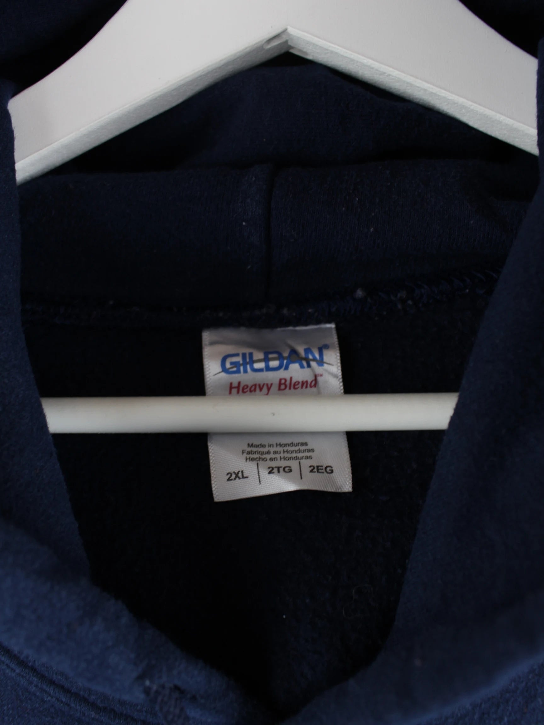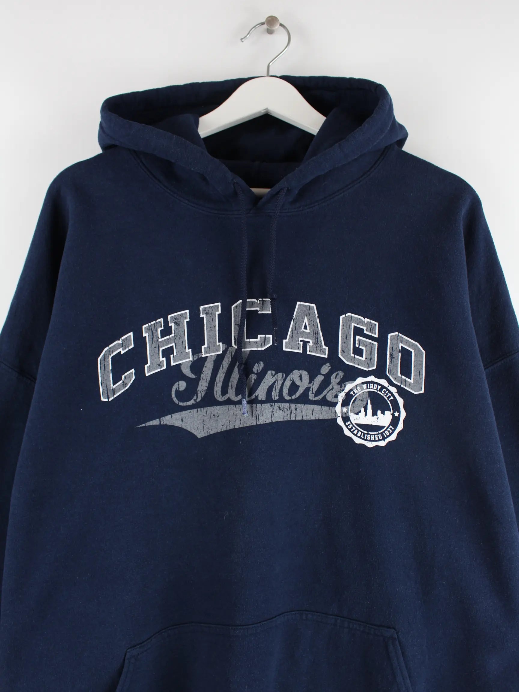 Hoodie der Marke Gildan in Größe XXL. Er ist aus einer Baumwollmischung hergestellt und in Blau auf Lager. Mit schönem Chicago Print.
