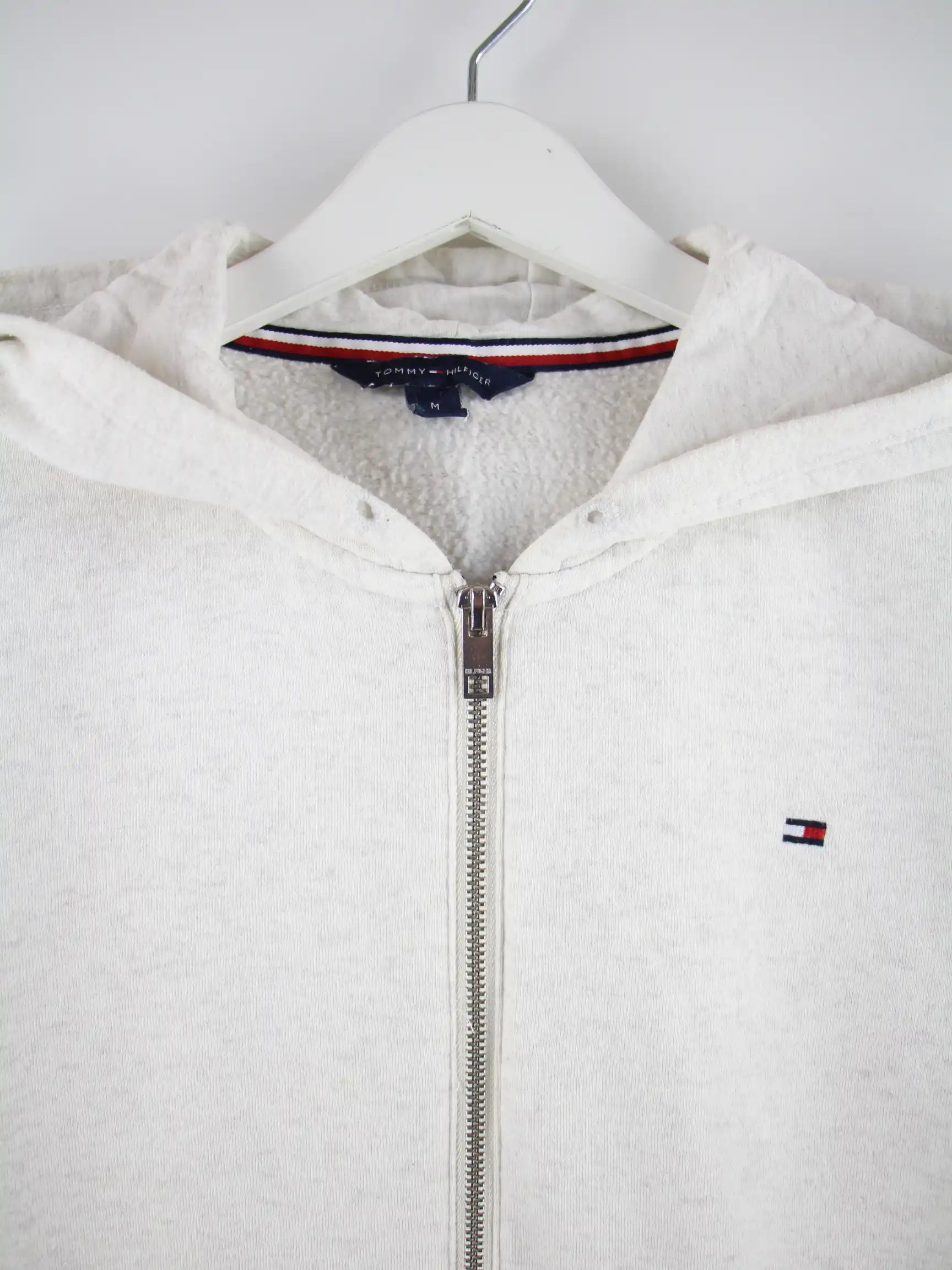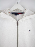 Hoodie der Marke Tommy Hilfiger mit langem Reißverschluß in Größe M. Er ist aus einer Baumwollmischung gemacht und in Grau im Bestand.
