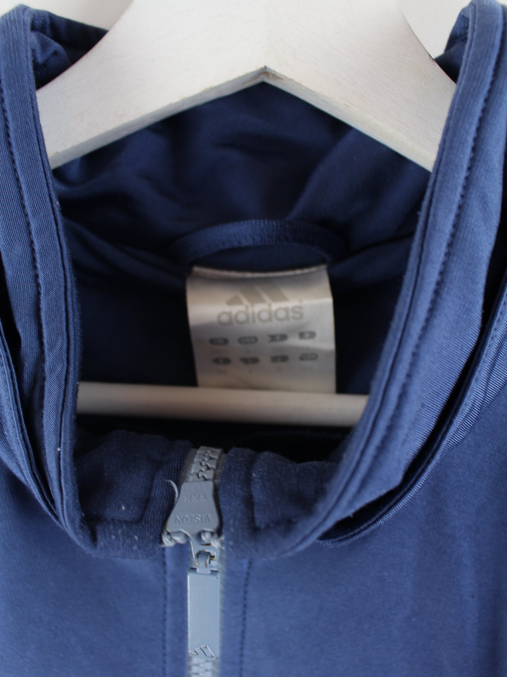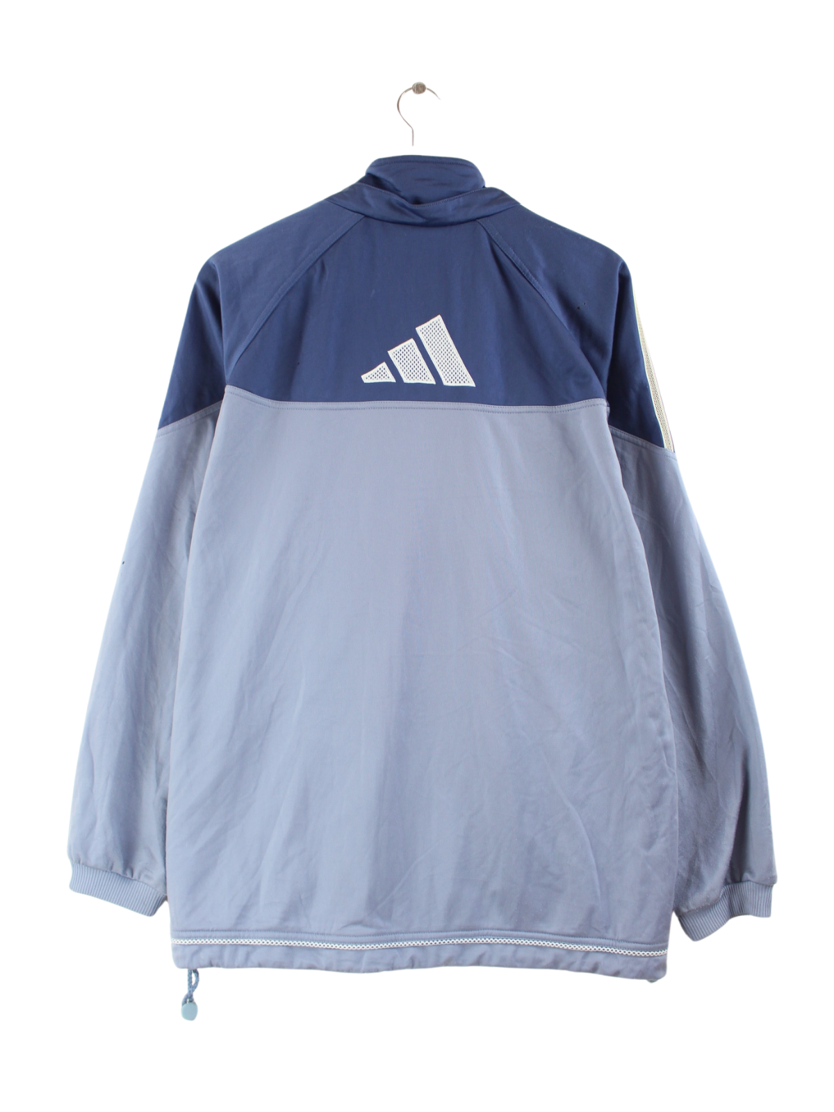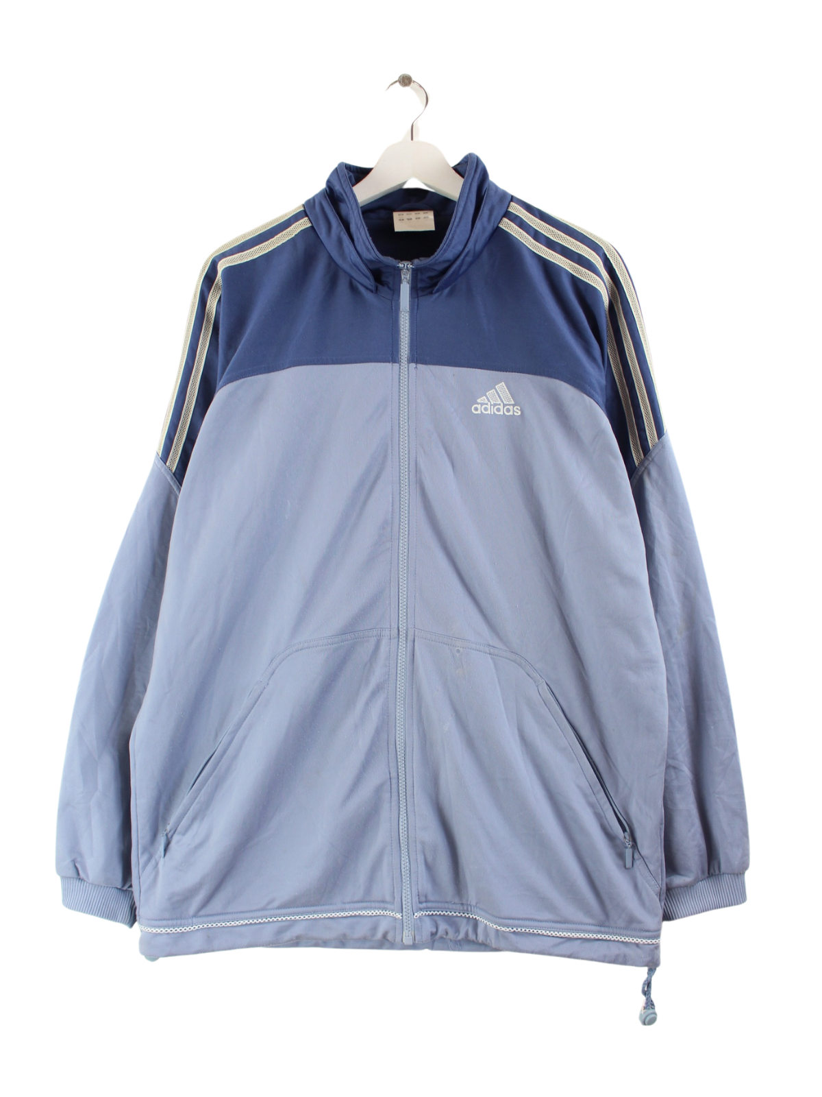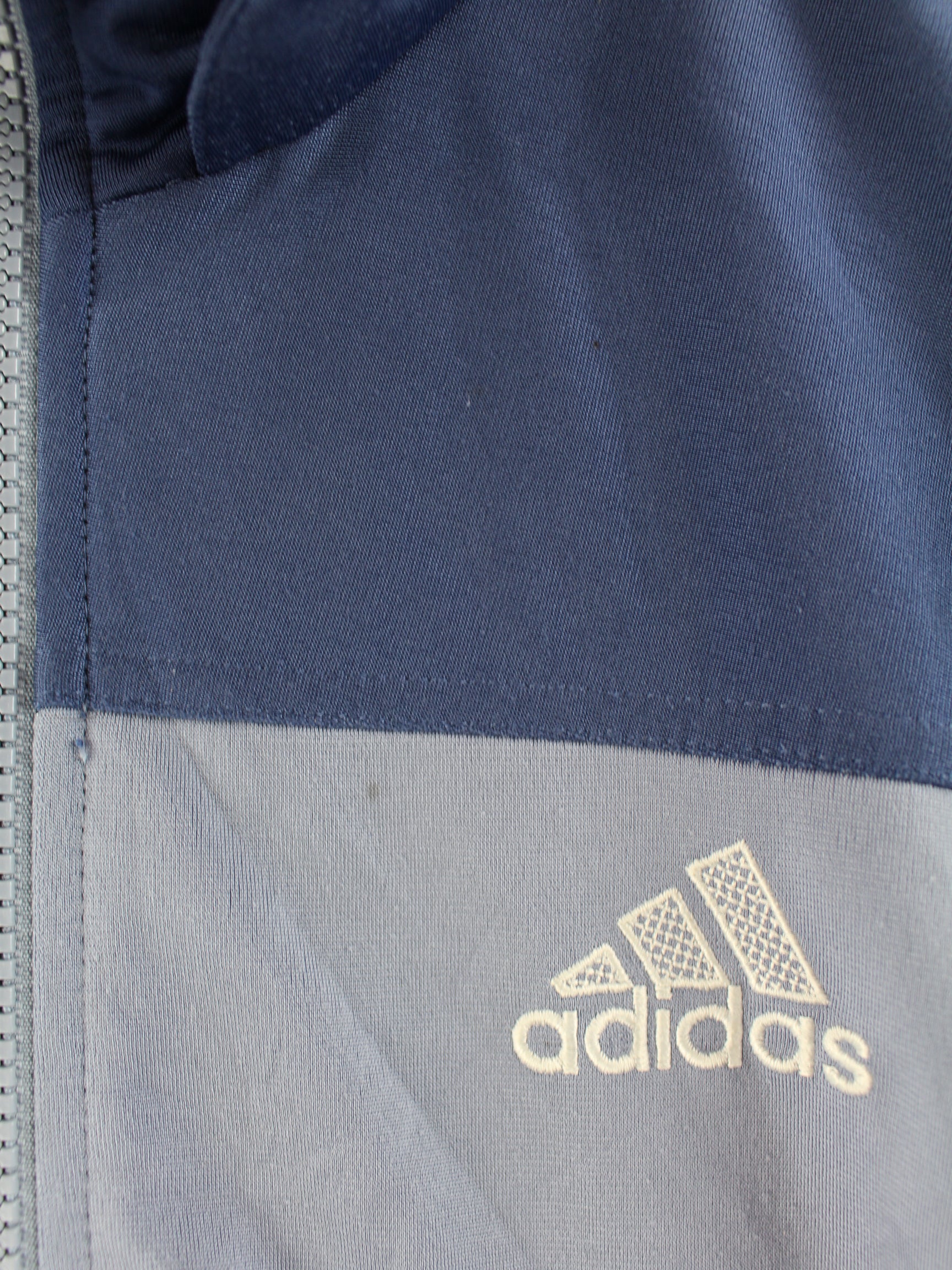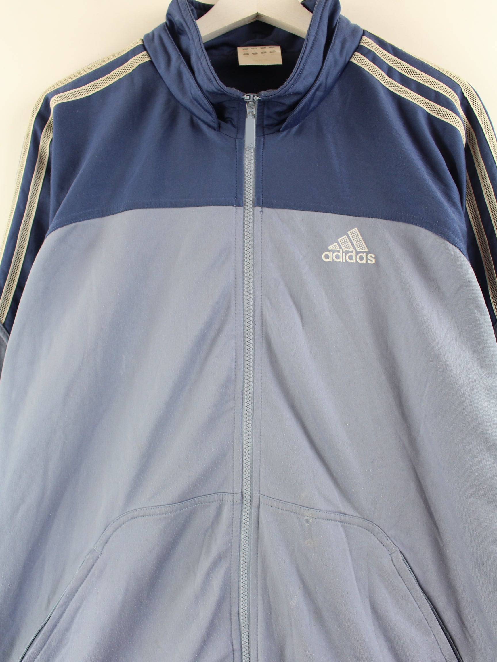 Blaue Trainingsjacke des Labels Adidas aus Anfang der 2000'er in Größe XL. Sie ist aus Synthetik hergestellt. Den Zustand würden wir als 'In Ordnung' bezeichnen (vergl. Bilder).