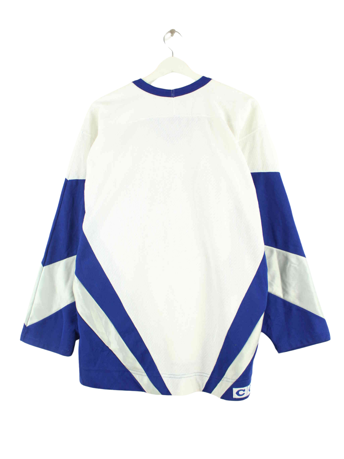 Weißer Jersey mit gesticktem Logo des Labels CCM aus Anfang der 2000'er in Größe L. Es ist aus Synthetik und in gutem Zustand bei uns vorrätig.