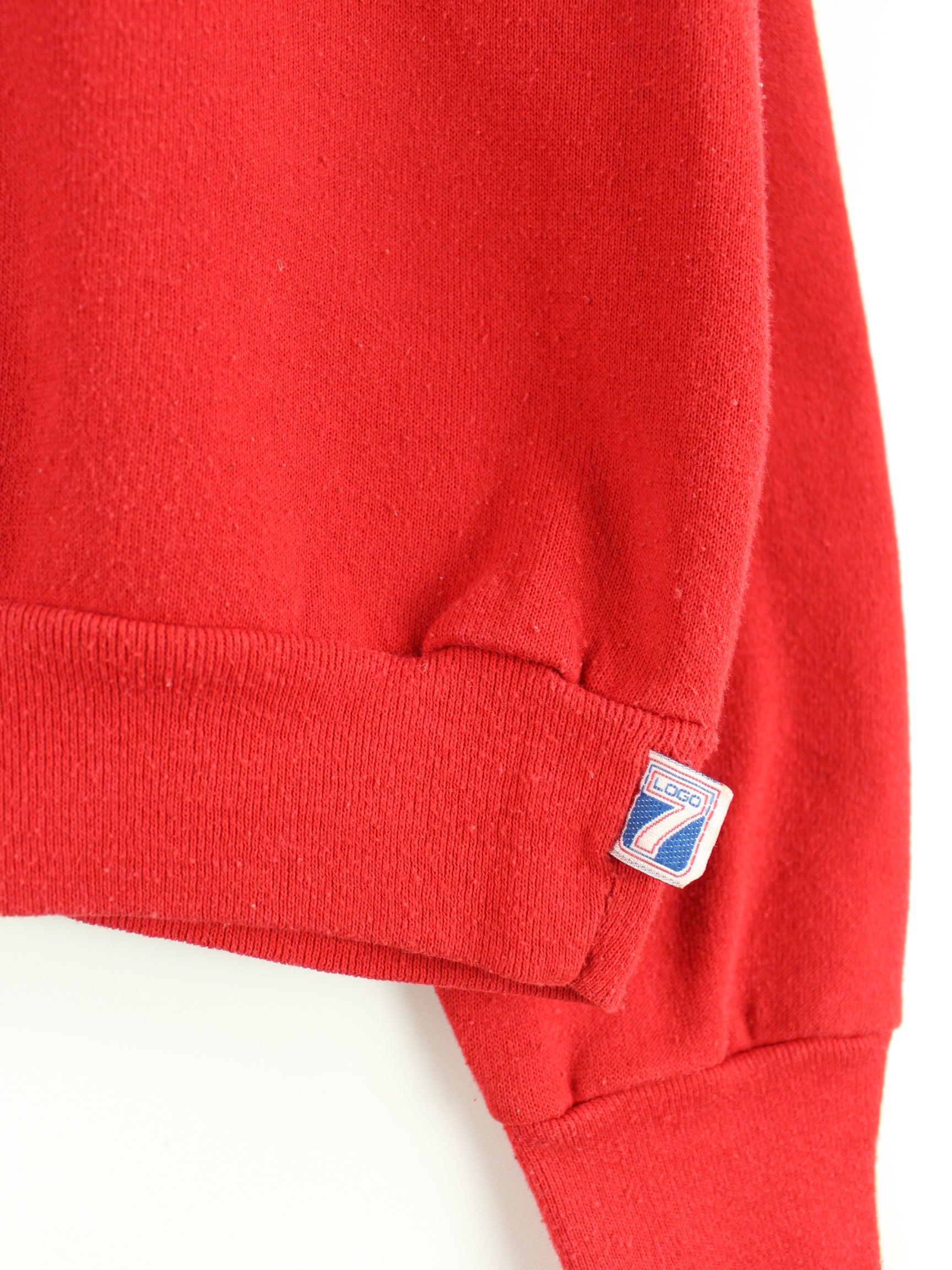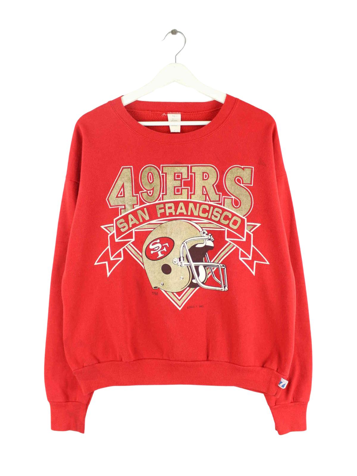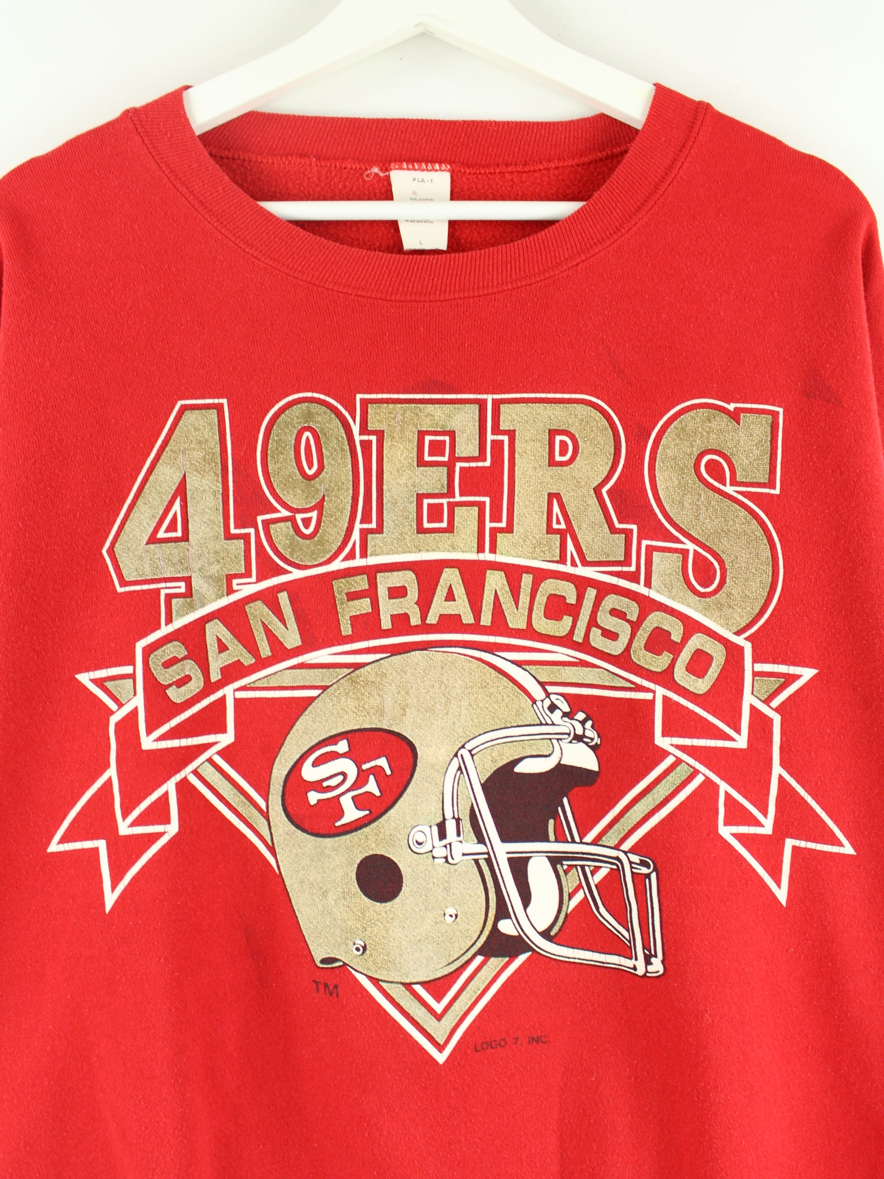 Sweater der Brand Logo 7 in Größe S aus den 90'ern. Er ist aus einer Baumwollmischung gefertigt und in Rot zu bekommen. Mit schickem 49ers Print.