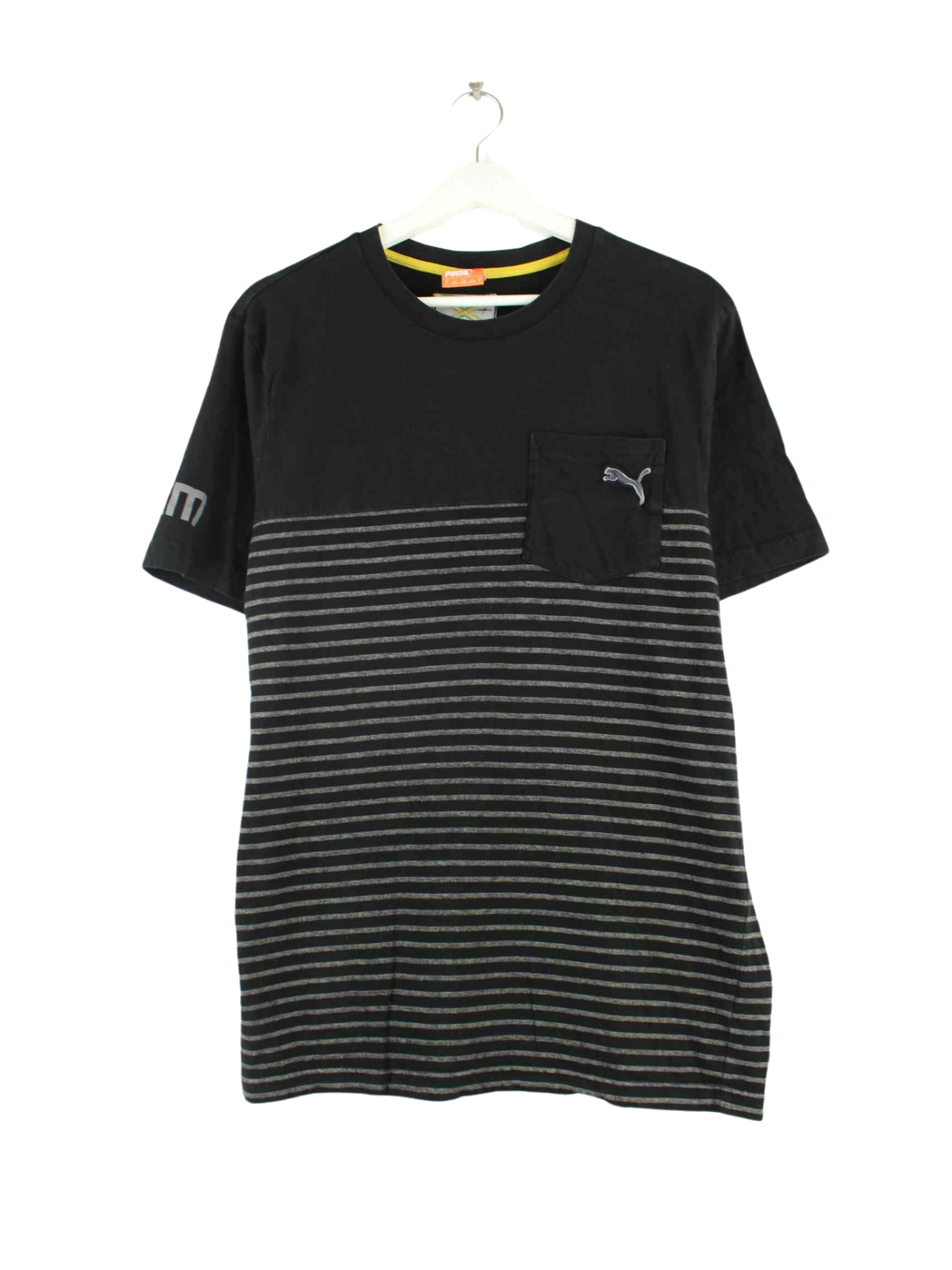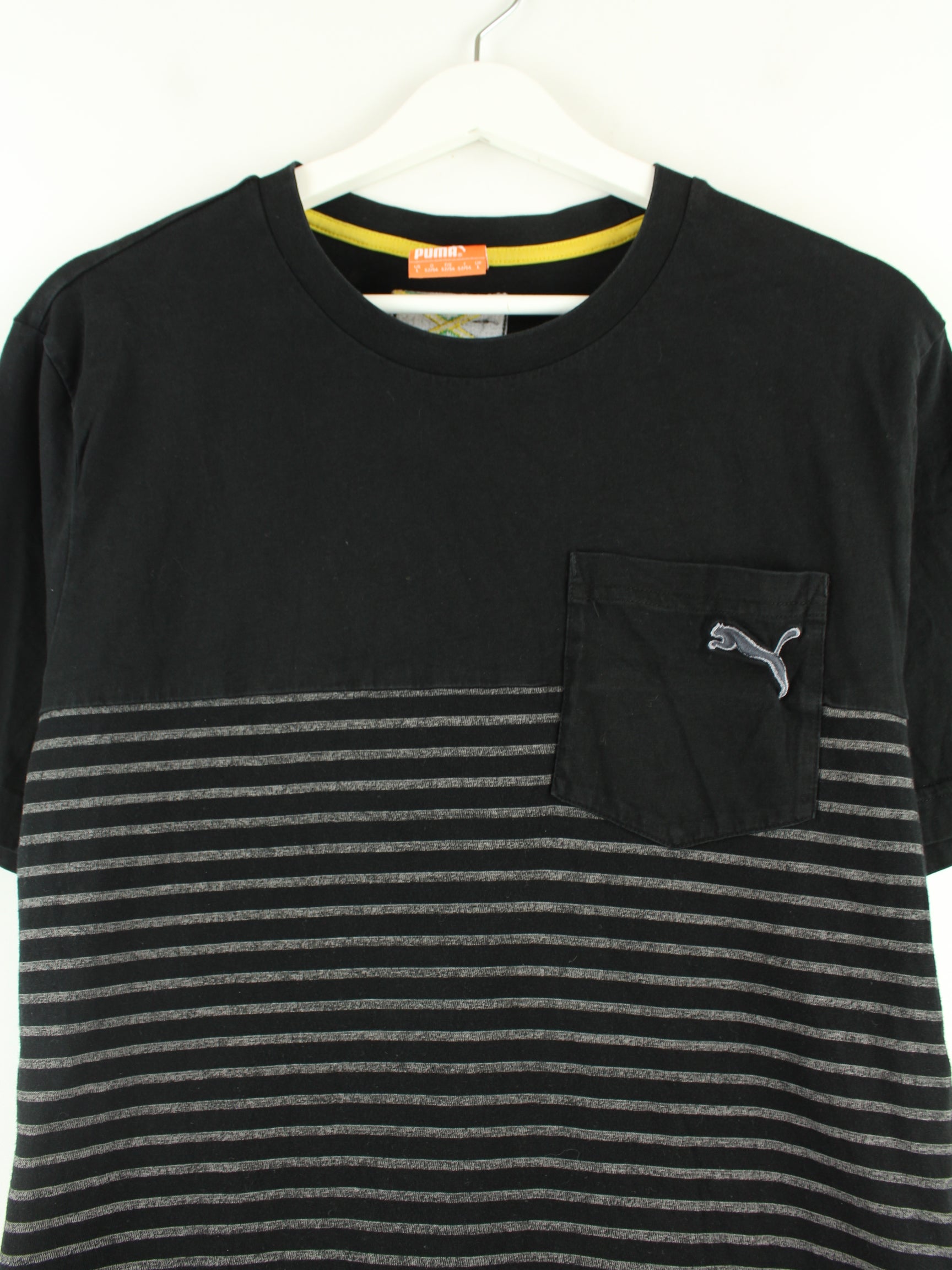 Schwarzes T-Shirt mit gesticktem Logo der Brand Puma in Größe L. Es ist aus Baumwolle hergestellt und in sehr gutem Zustand in Stock.