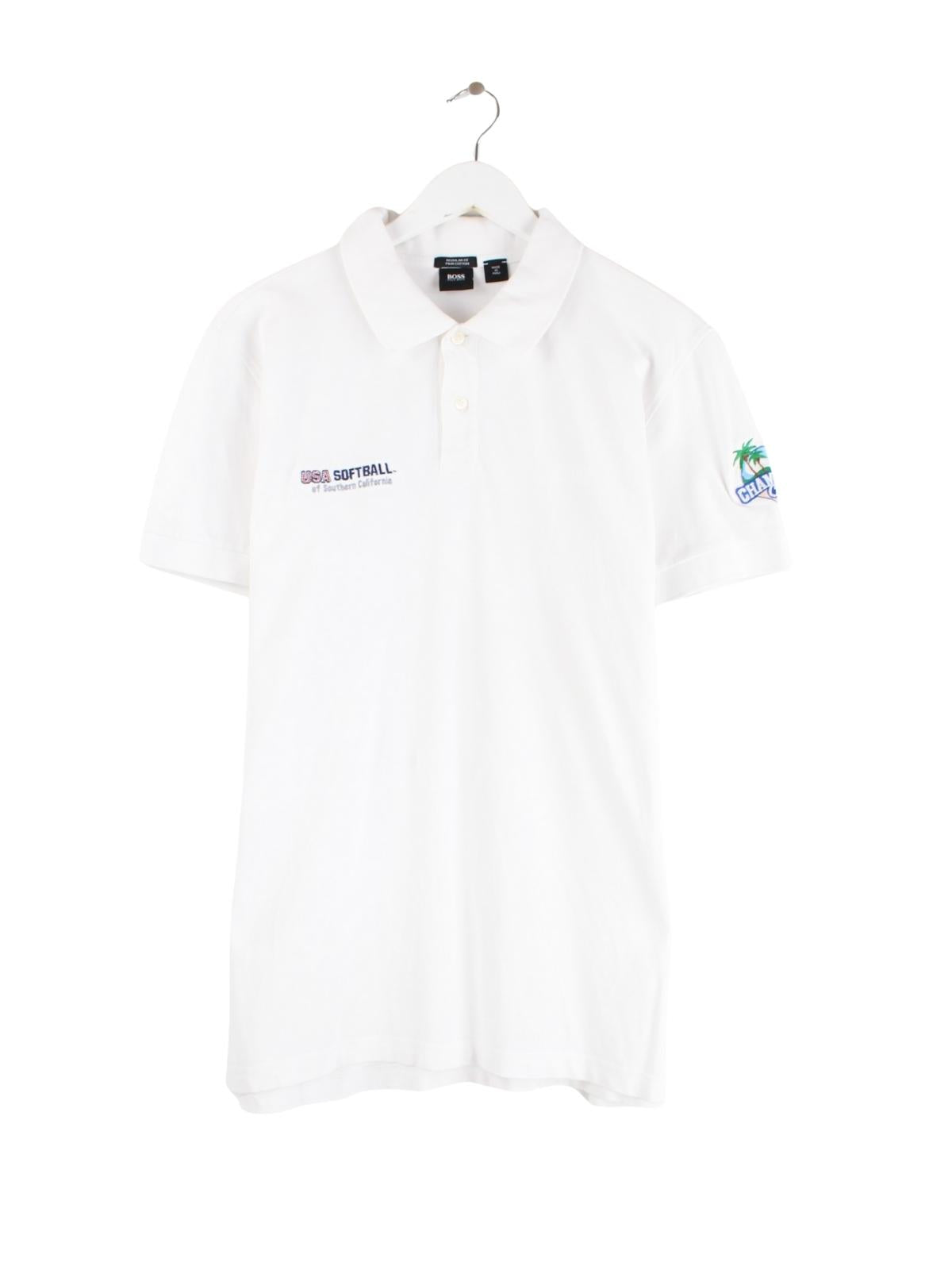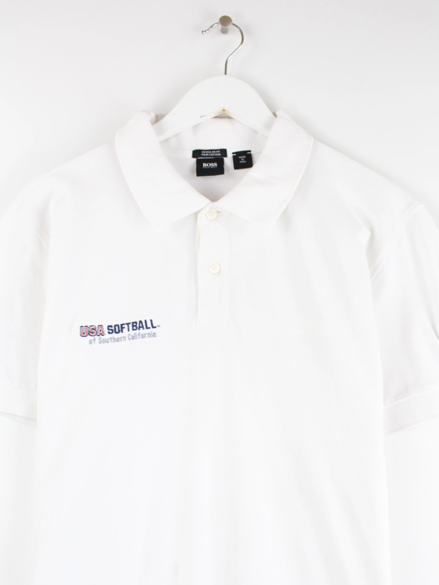 Poloshirt vom Label Hugo Boss in Größe XL. Es ist aus Baumwolle gemacht und in Weiß im Bestand.