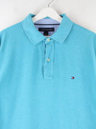 Poloshirt der Marke Tommy Hilfiger in Größe L. Es ist aus Baumwolle produziert und in Türkis in Stock.