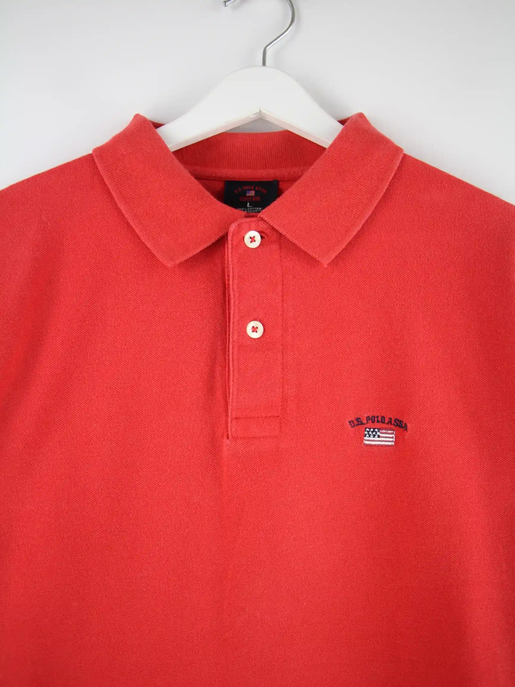 Rotes Poloshirt vom Label U.S. Polo ASSN. in Größe L. Es ist aus Baumwolle hergestellt und in sehr gutem Zustand im Bestand.
