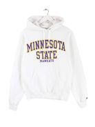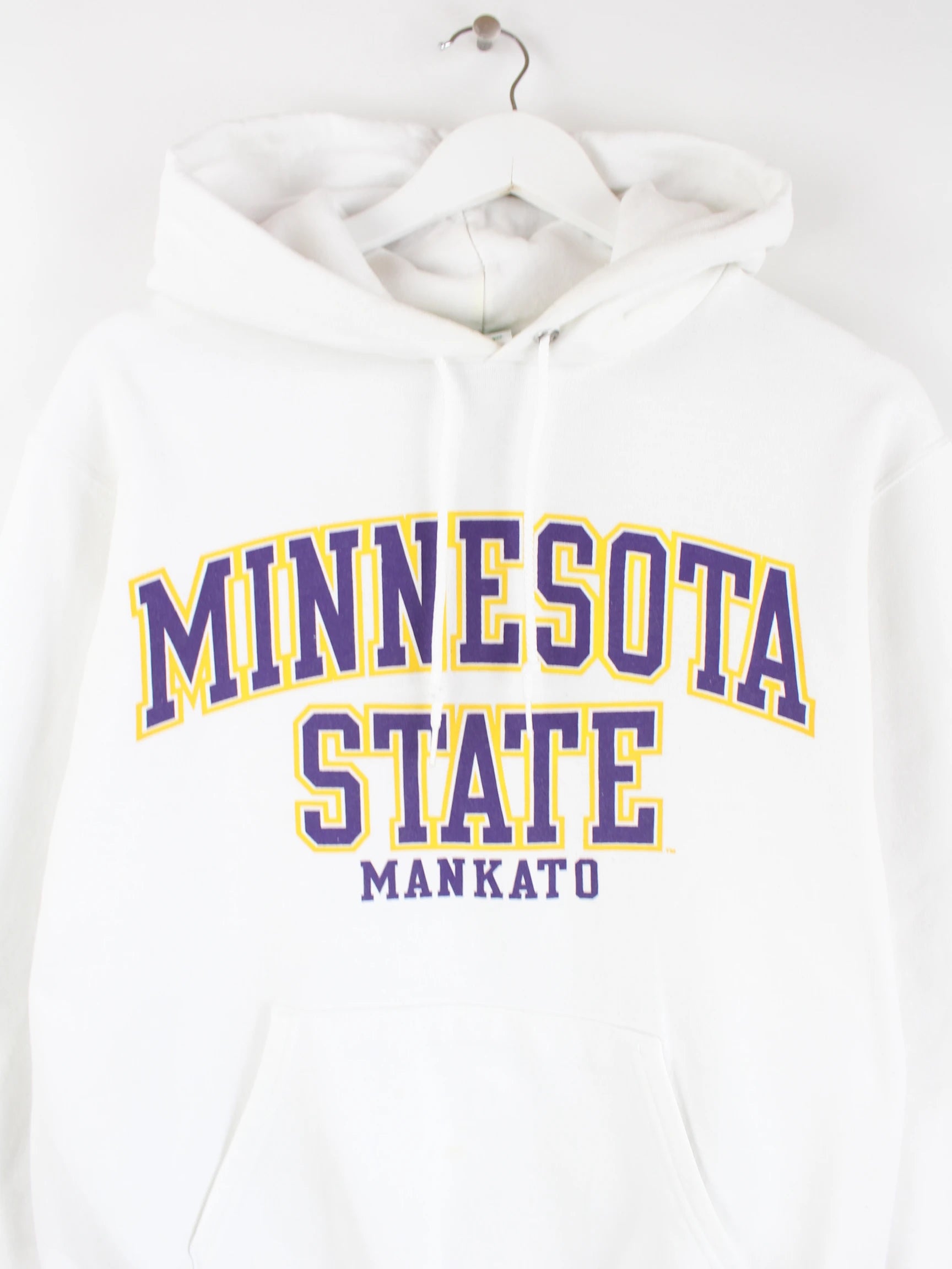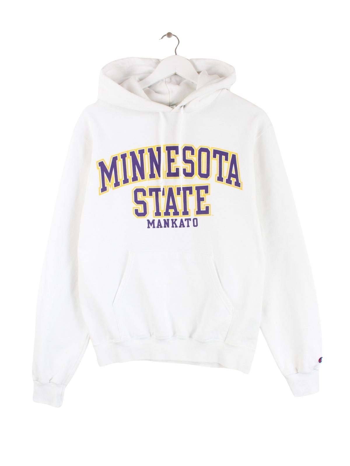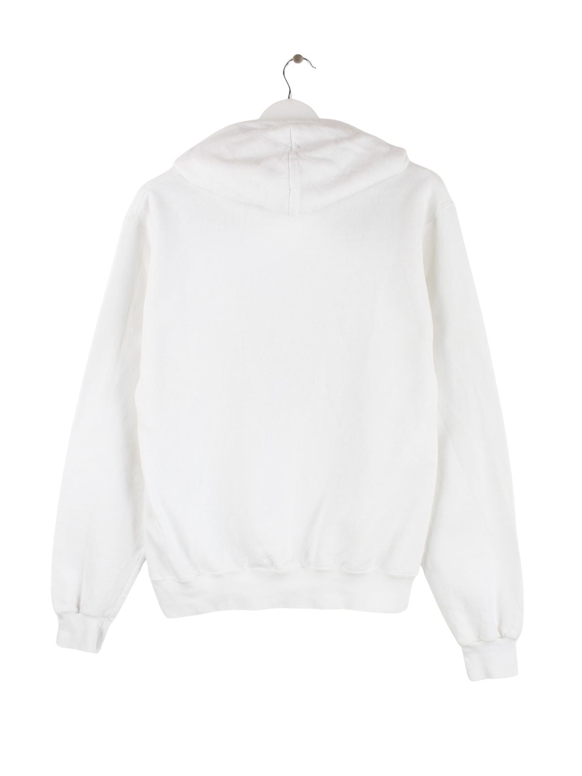 Weißer Hoodie von Champion in Größe S. Er ist aus einer Baumwollmischung hergestellt. Den Zustand würden wir als 'In Ordnung' bezeichnen (vergl. Bilder).Mit tollem State Print.