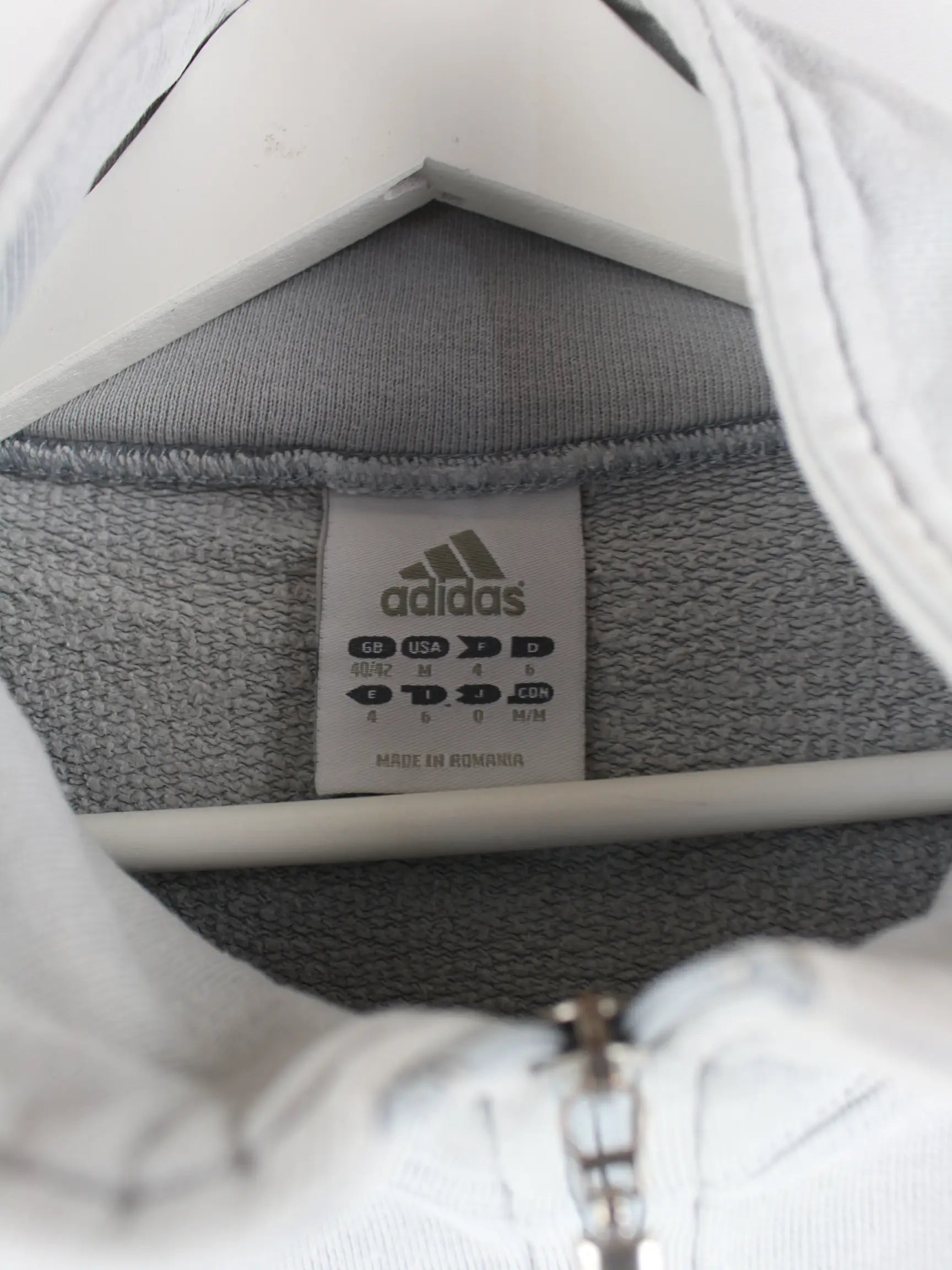 Grauer Sweater mit halbem Reißverschluß der Brand Adidas in Größe M. Er ist aus einer Baumwollmischung gemacht und in gutem Zustand bei uns zu bekommen.