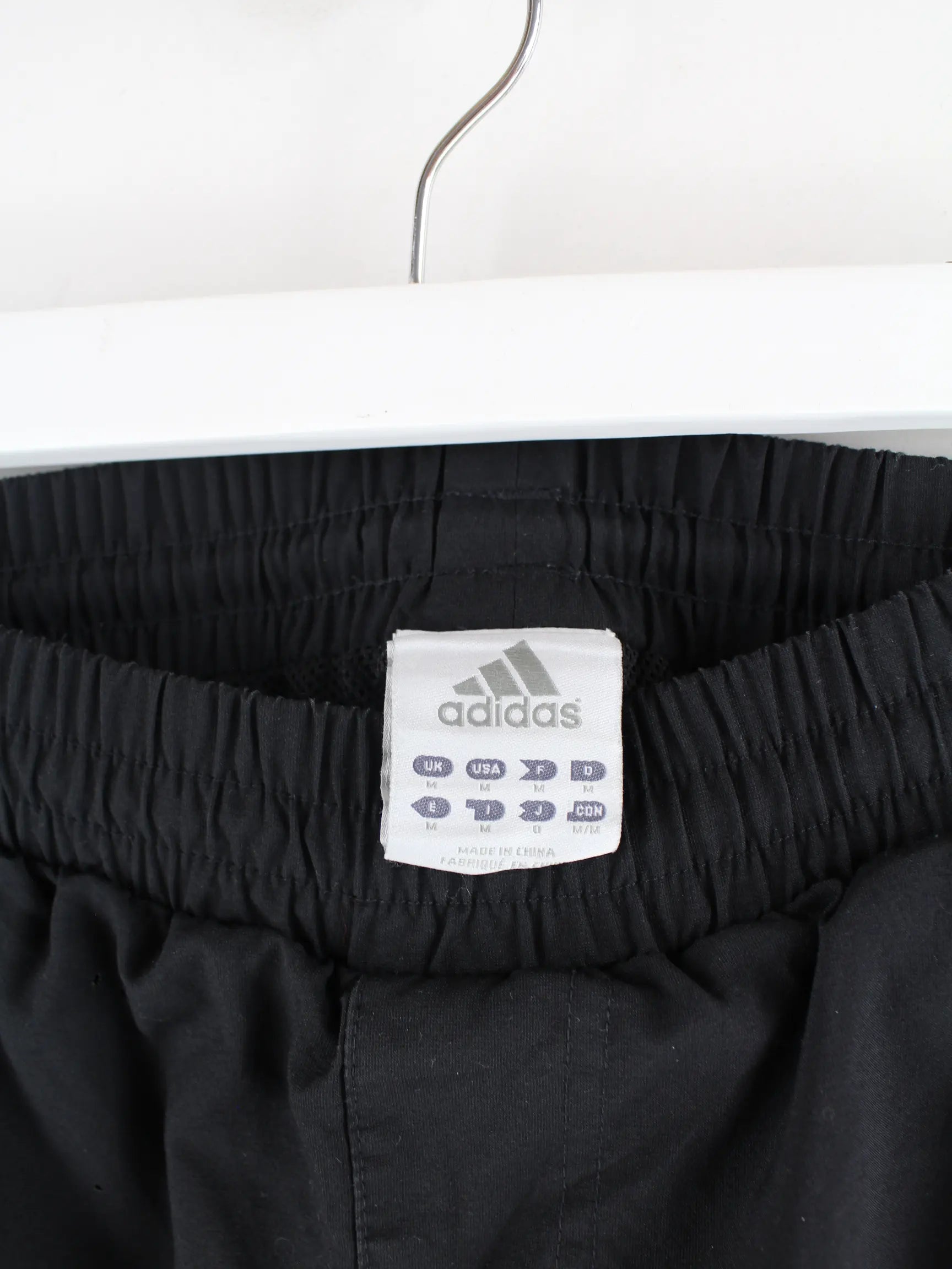 Schwarze Track Pants vom Brand Adidas in Größe M. Sie sind aus Synthetik angefertigt. Den Zustand würden wir als 'In Ordnung' bezeichnen (vergl. Bilder).