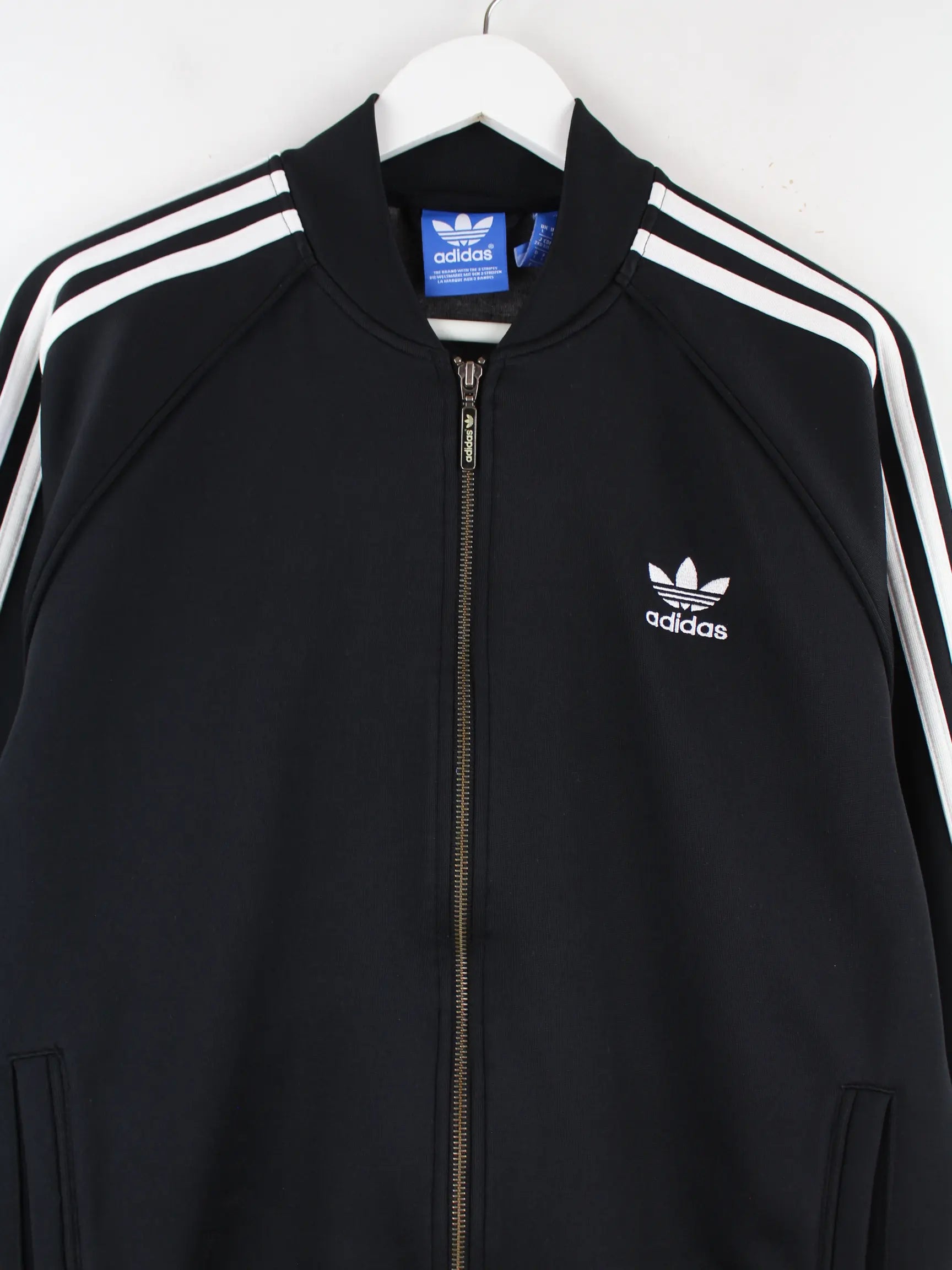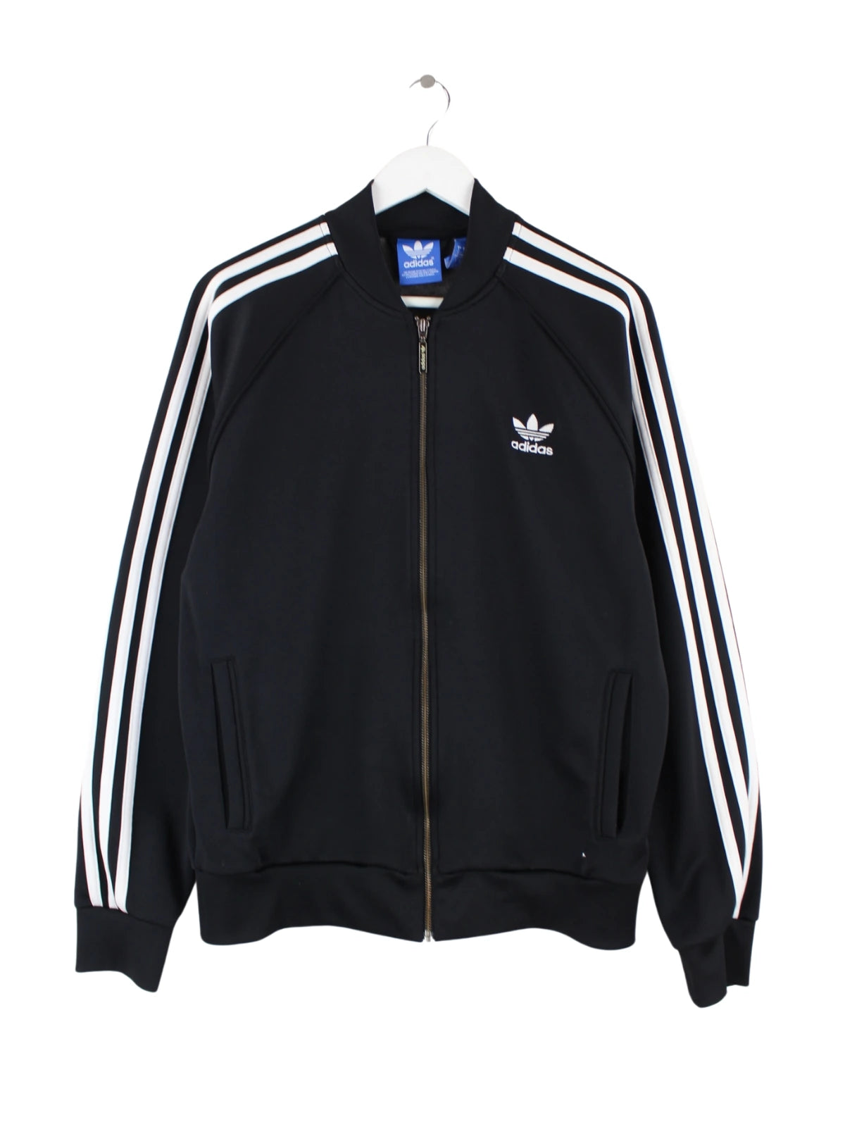 Trainingsjacke vom Label Adidas in Größe L. Sie ist aus Synthetik angefertigt und in Schwarz zu haben.
