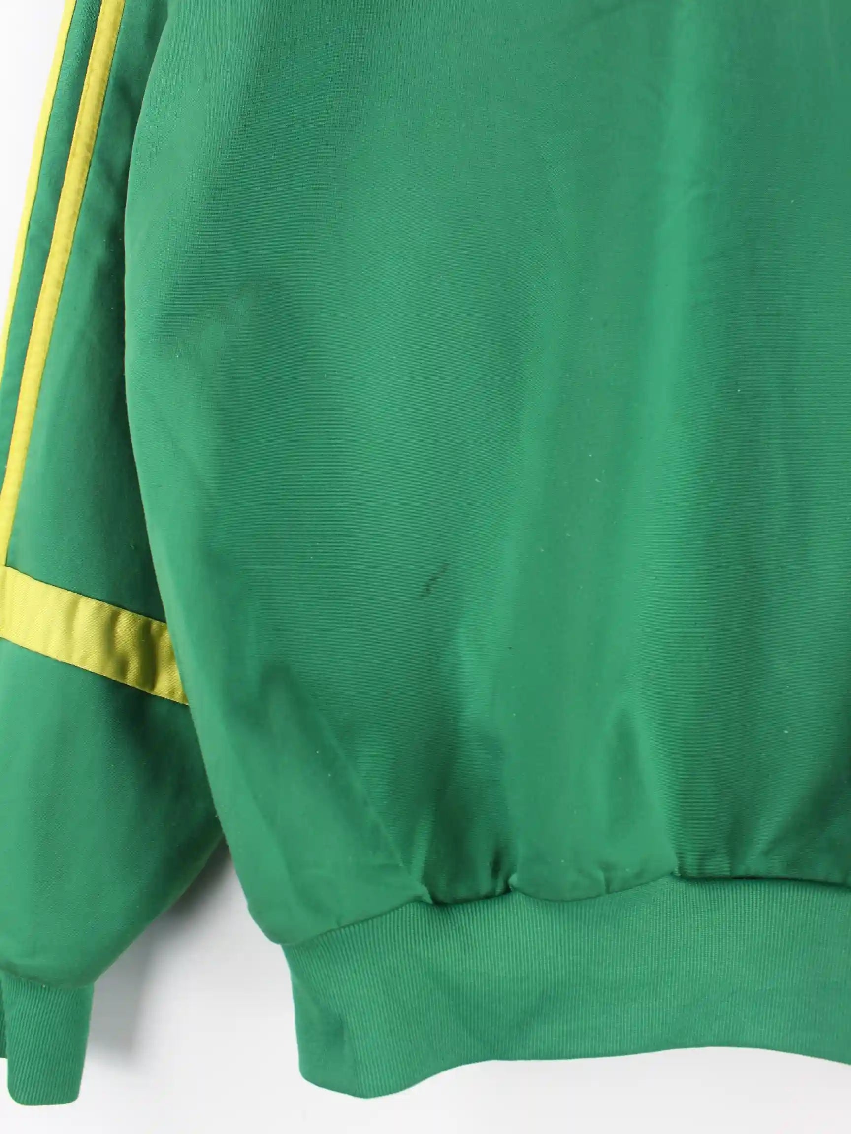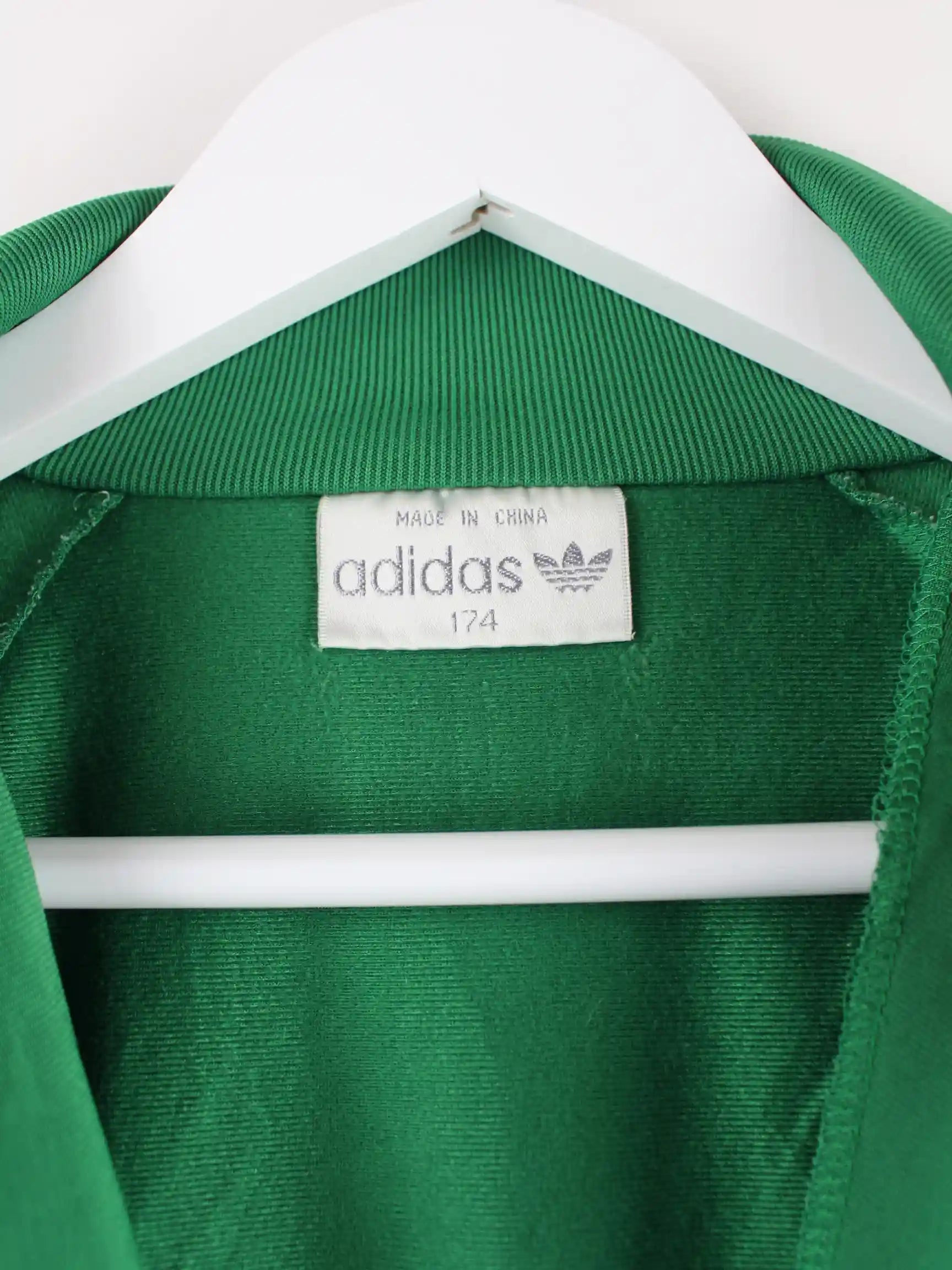 Grüne Trainingsjacke von Adidas aus den 80'ern in Größe M. Sie ist aus Synthetik produziert. Den Zustand würden wir als 'In Ordnung' bezeichnen (vergl. Bilder).