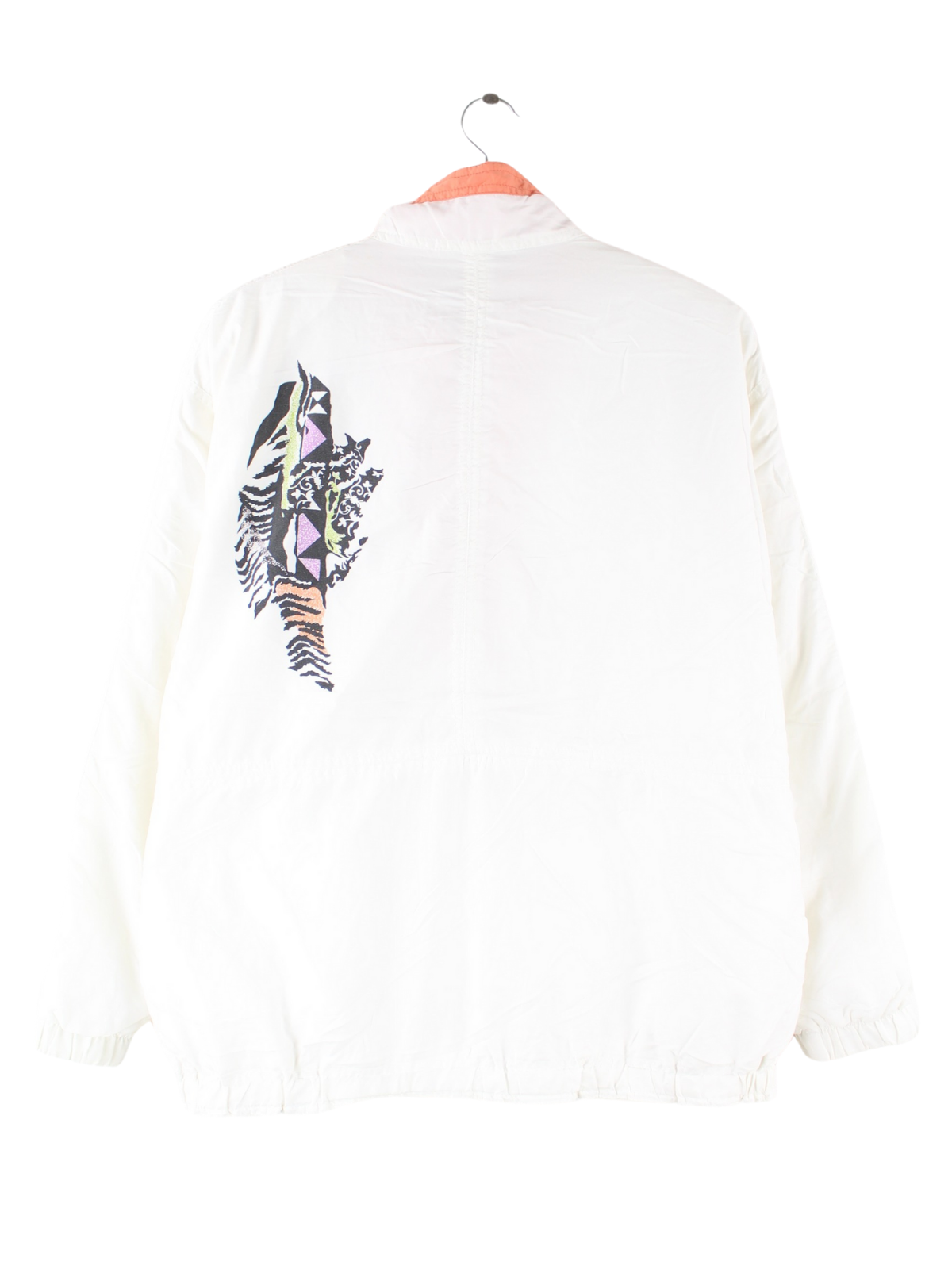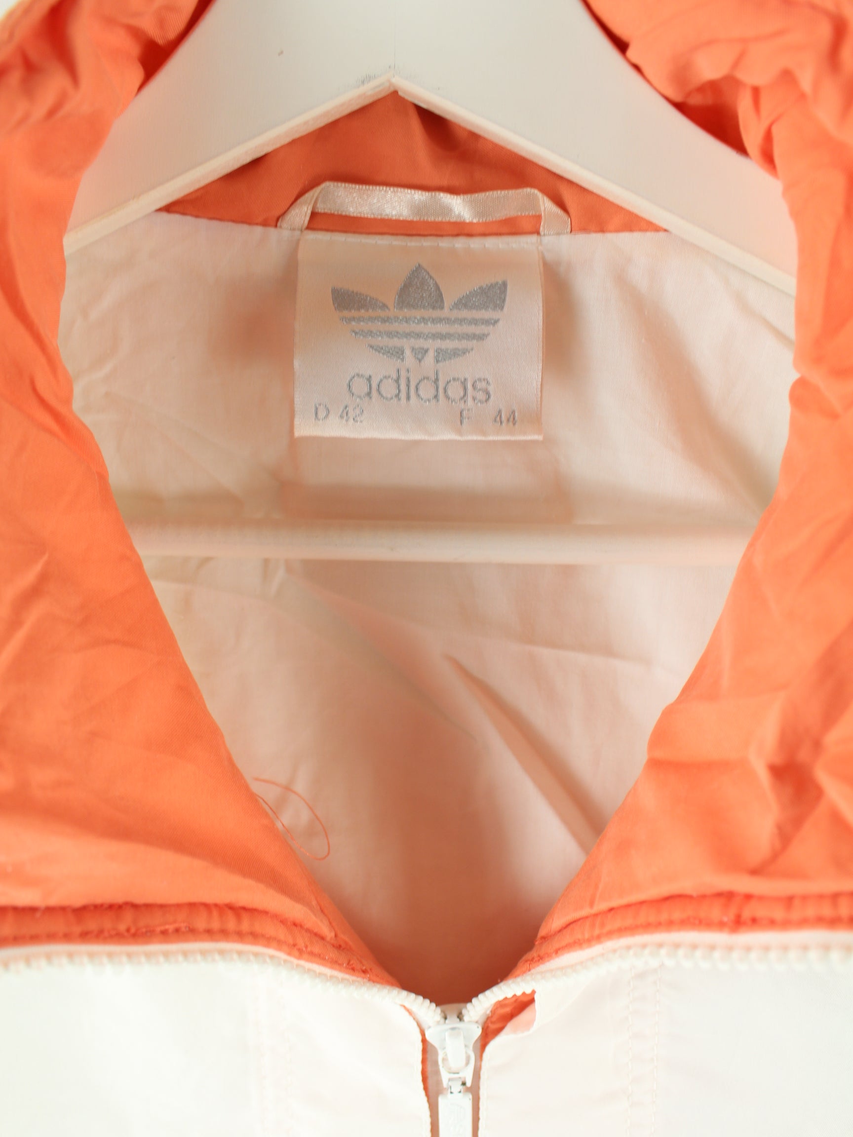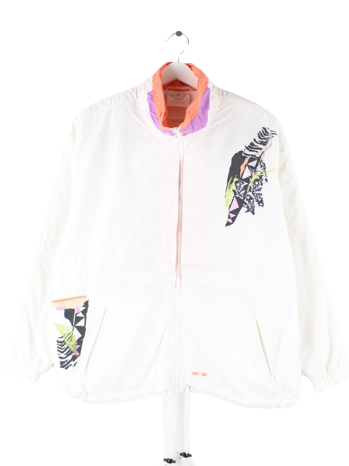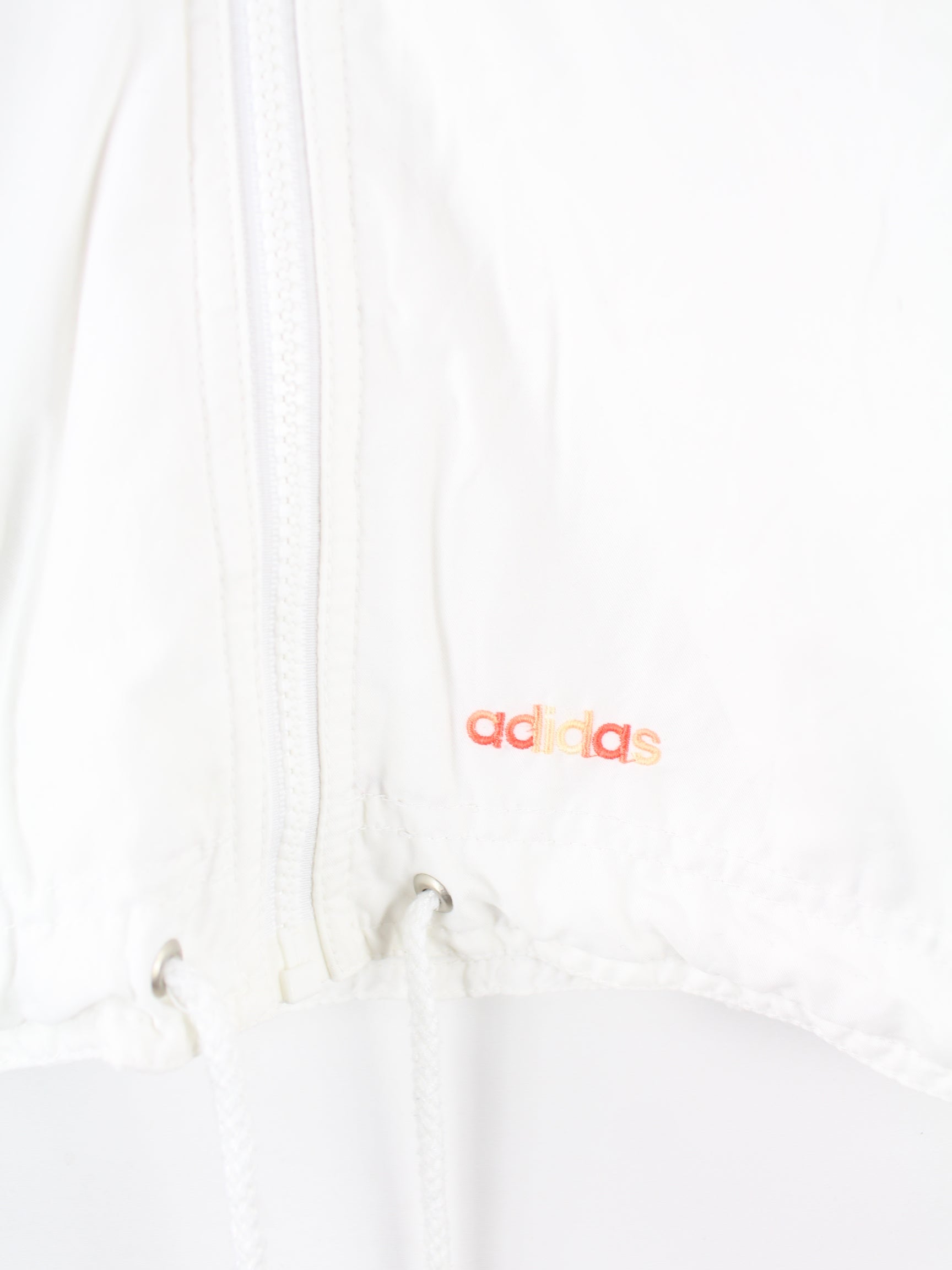 Weiße Trainingsjacke von Adidas aus den 80'ern in Größe M. Sie ist aus Synthetik produziert und in sehr gutem Zustand lieferbar. Mit tollem Vintage Print.