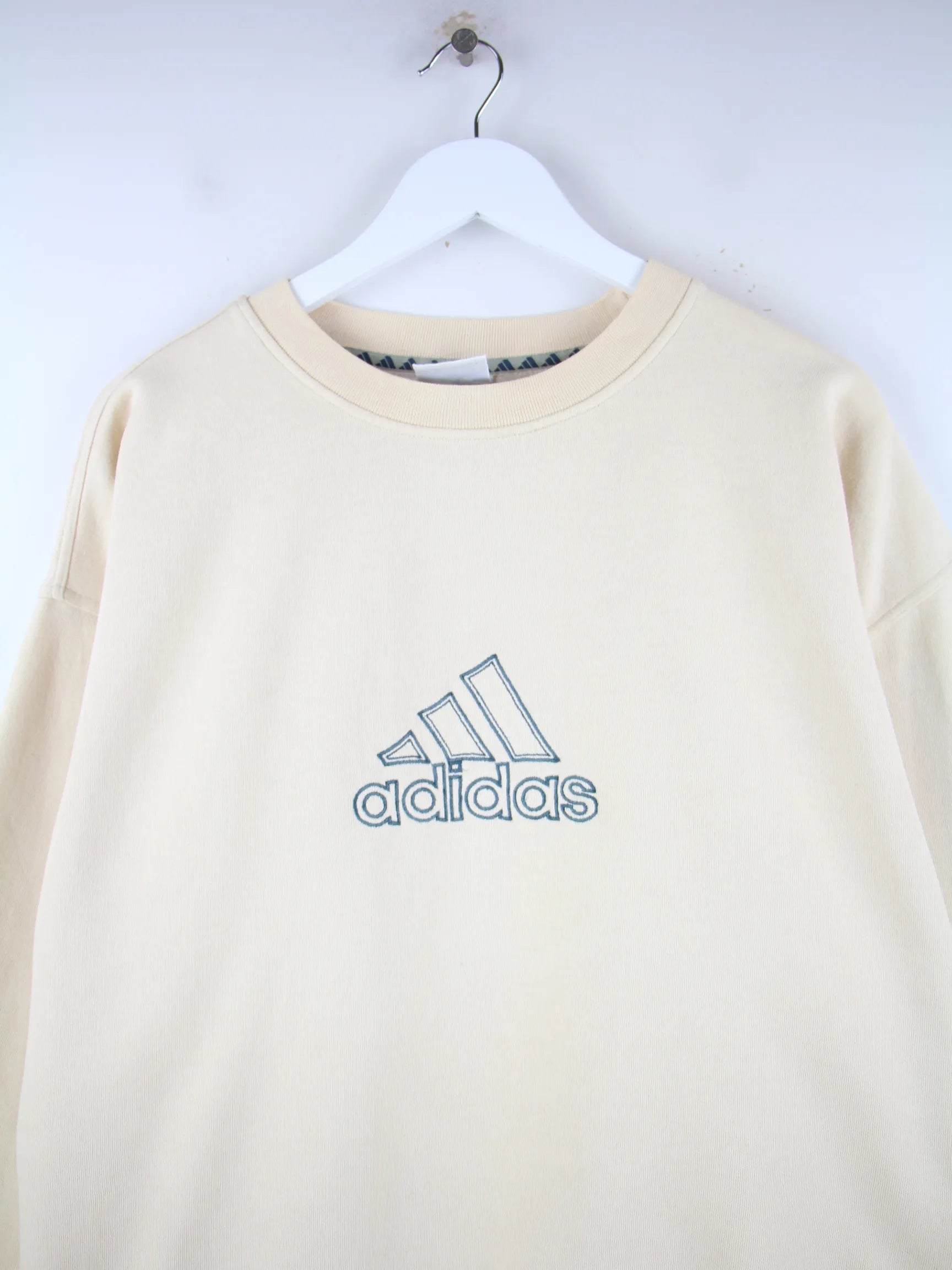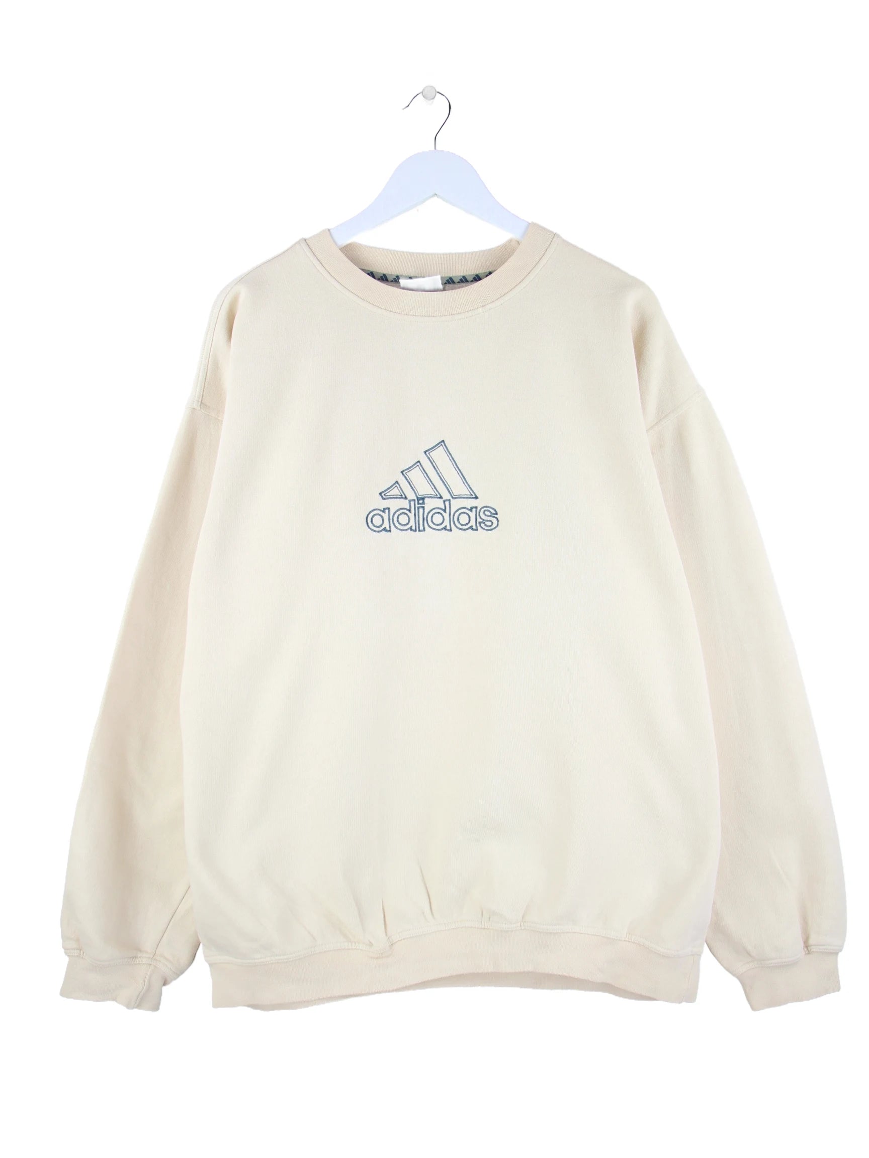 Beigefarbener Sweater aus dem Hause Adidas aus den 90'ern in Größe XXL. Er ist aus einer Baumwollmischung produziert und in sehr gutem Zustand vorrätig.