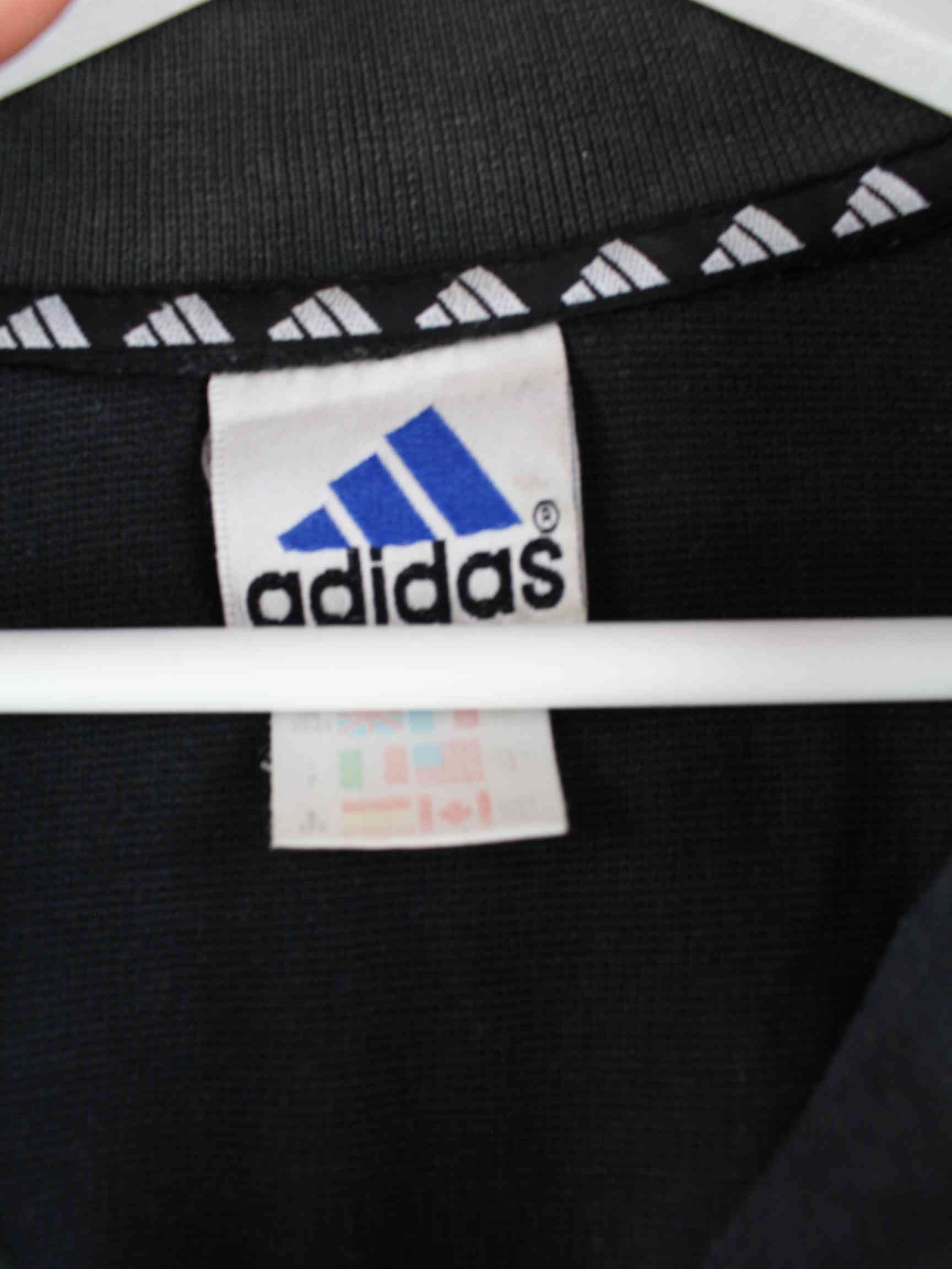 Sweater vom Brand Adidas mit halbem Reißverschluß in Größe L aus den 90'ern. Er ist aus einer Baumwollmischung gefertigt und in Schwarz im Bestand.