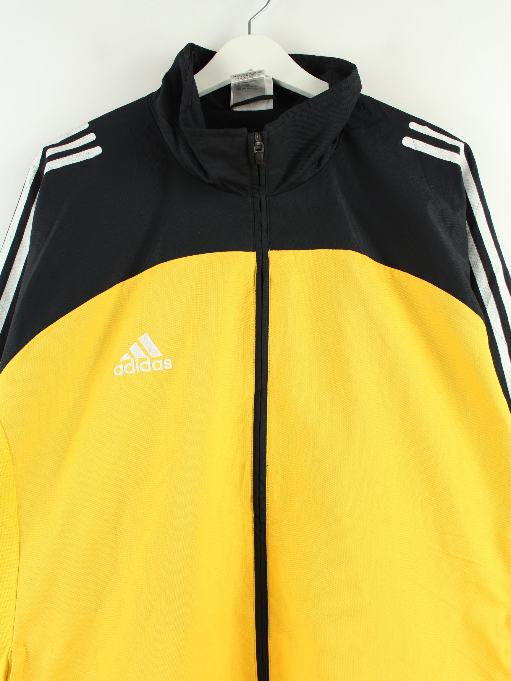 Gelbe Trainingsjacke aus dem Hause Adidas aus den 90'ern in Größe 3XL. Sie ist aus Synthetik gemacht und in gutem Zustand im Bestand.