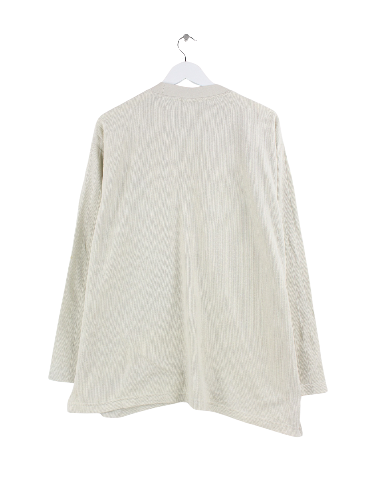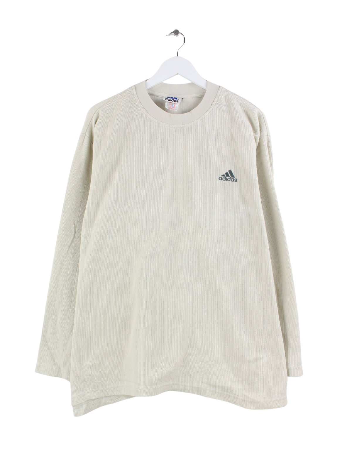 Beigefarbener Sweater mit Stick des Labels Adidas aus den 90'ern in Größe L. Er ist aus einer Baumwollmischung und in gutem Zustand bei uns zu bekommen.
