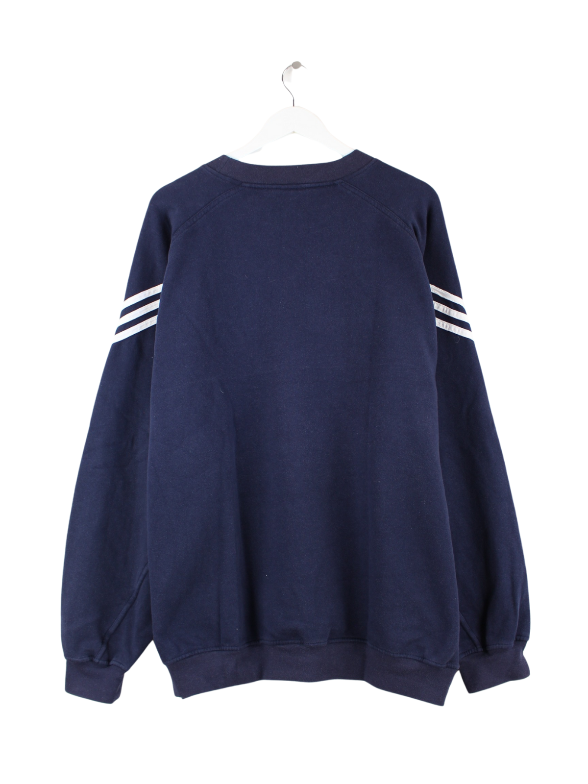 Sweater vom Brand Adidas in Größe XL aus den 90'ern. Er ist aus einer Baumwollmischung gemacht und in Blau zu haben.