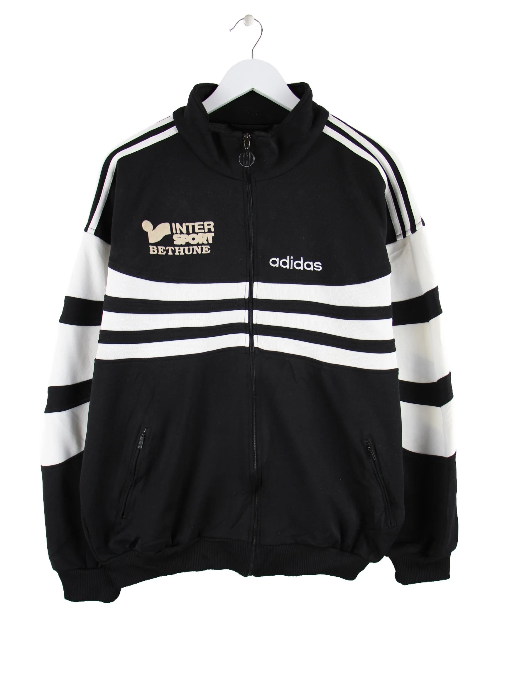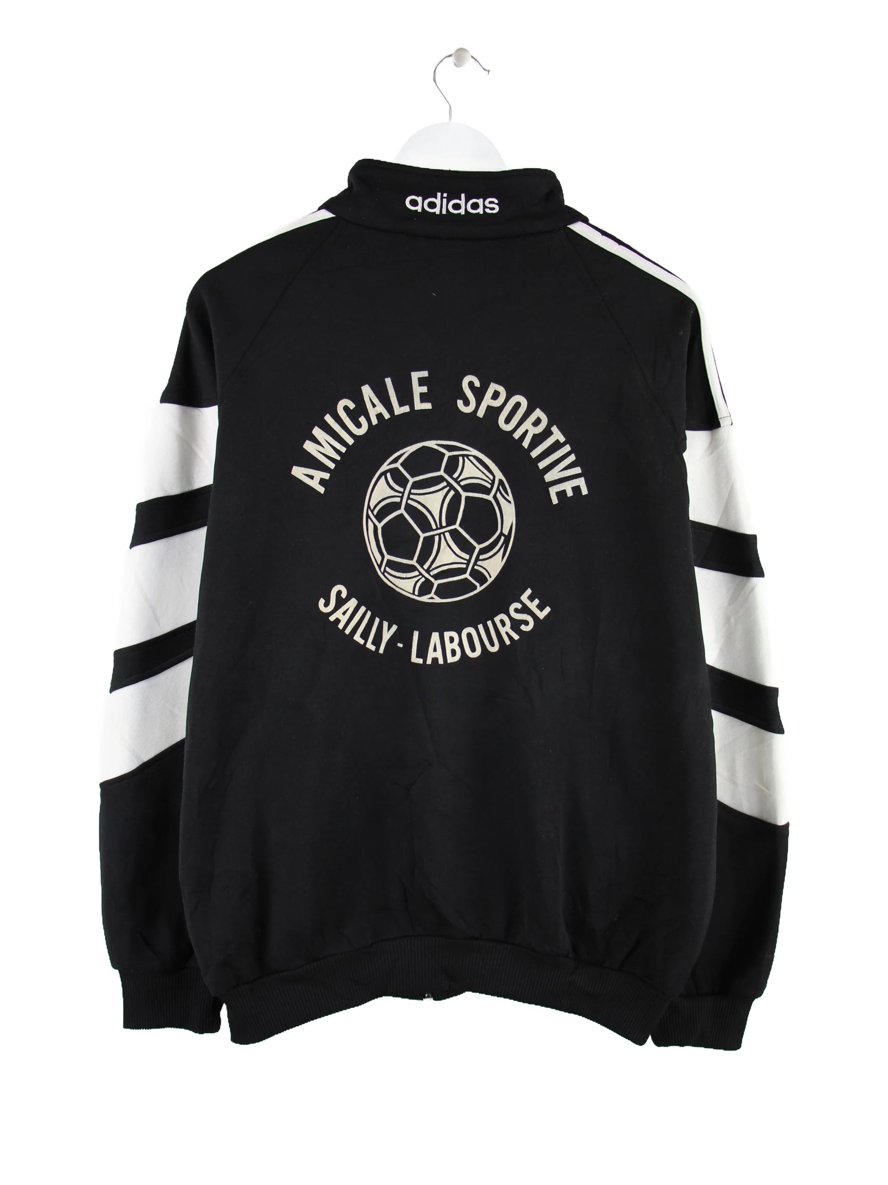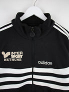 Trainingsjacke vom Label Adidas in Größe M aus den 90'ern. Sie ist aus Synthetik gemacht und in Schwarz zu haben. Mit tollem Vintage Print.