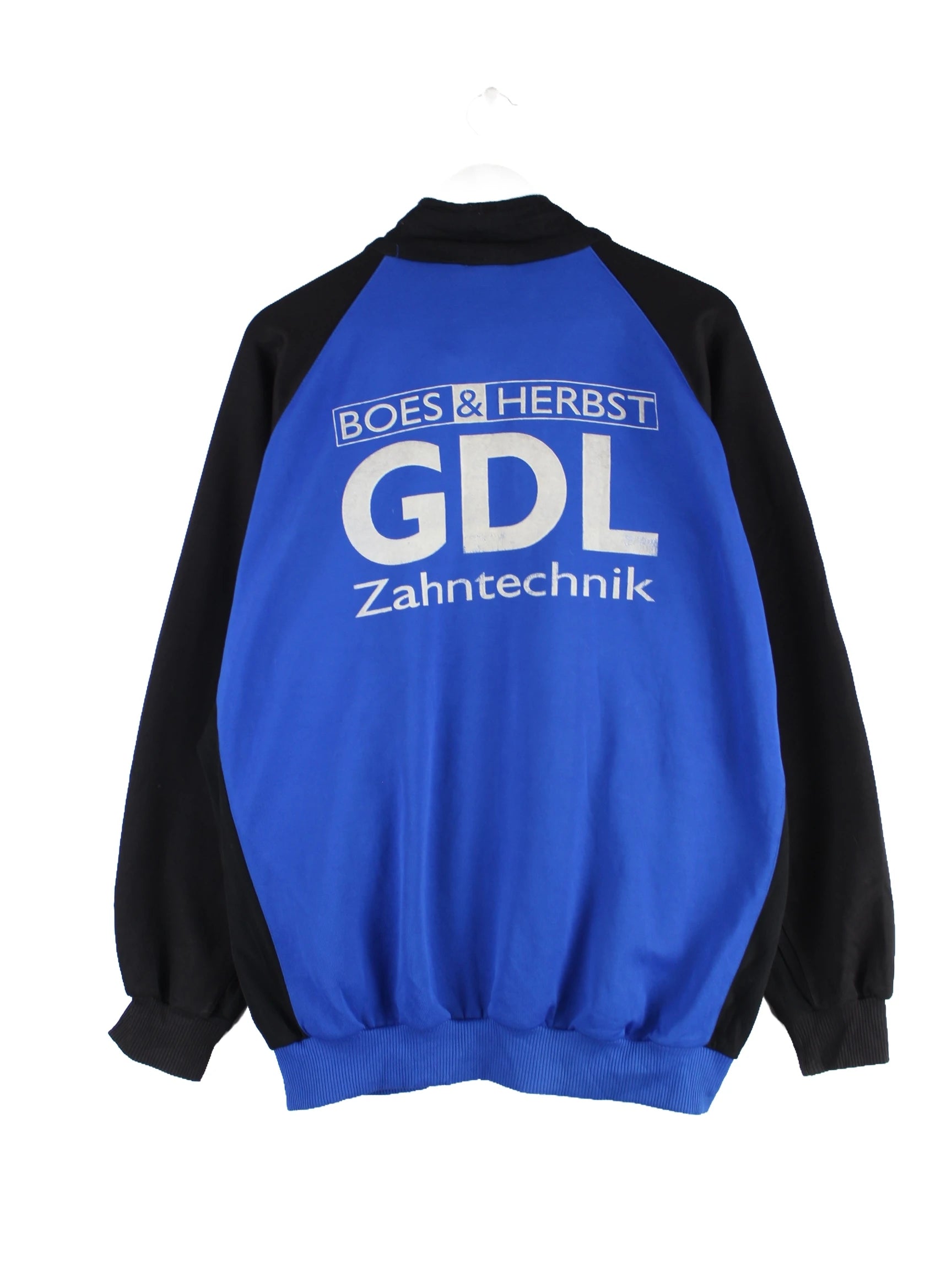 Trainingsjacke der Marke Adidas in Größe L aus den 90'ern. Sie ist aus Synthetik gemacht und in Blau im Angebot. Mit chiquem Vintage Print.