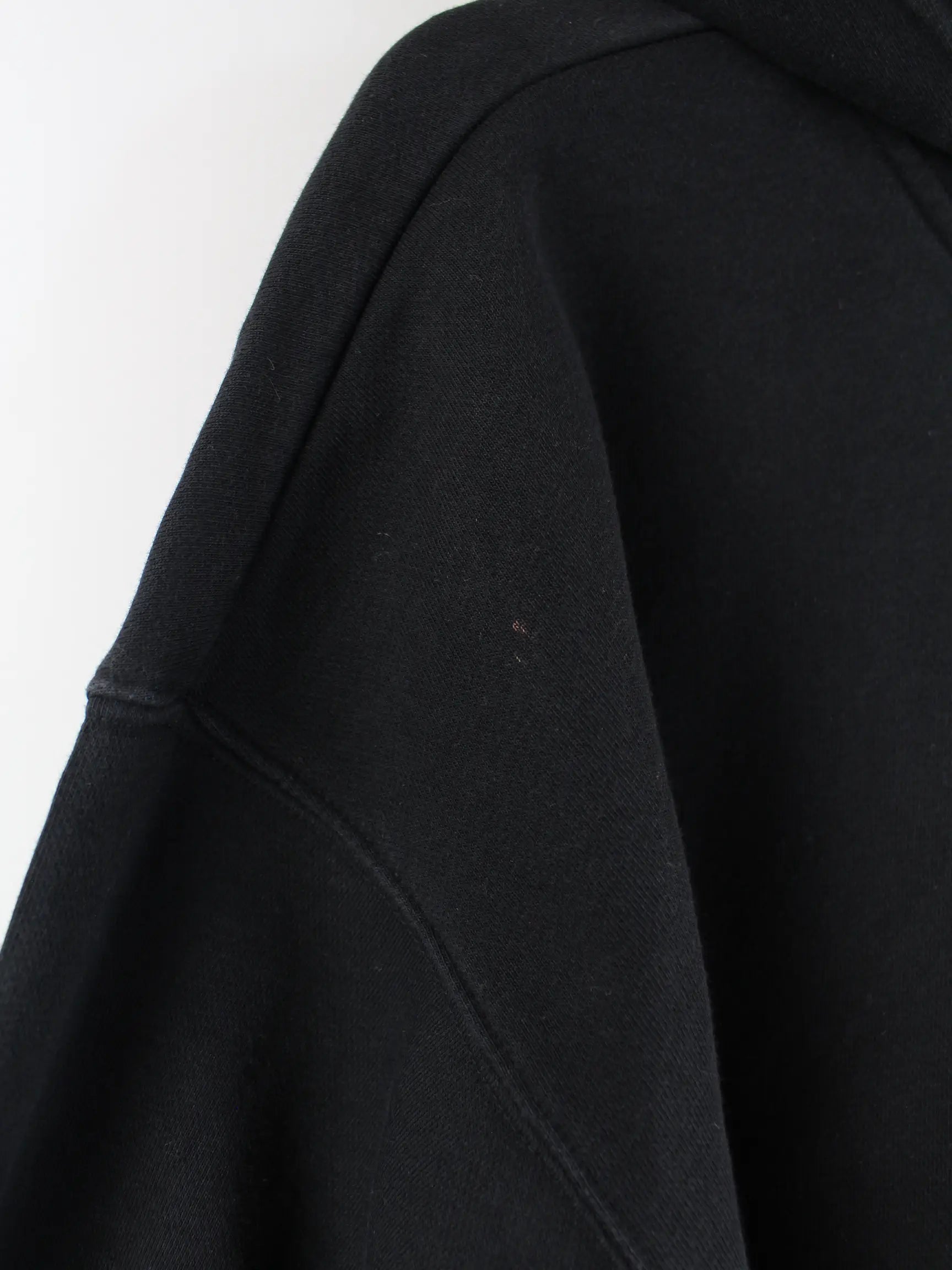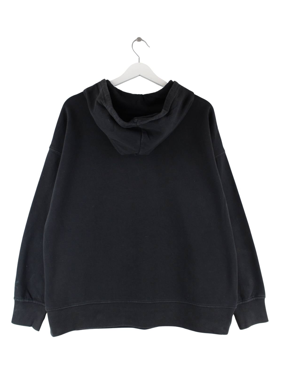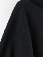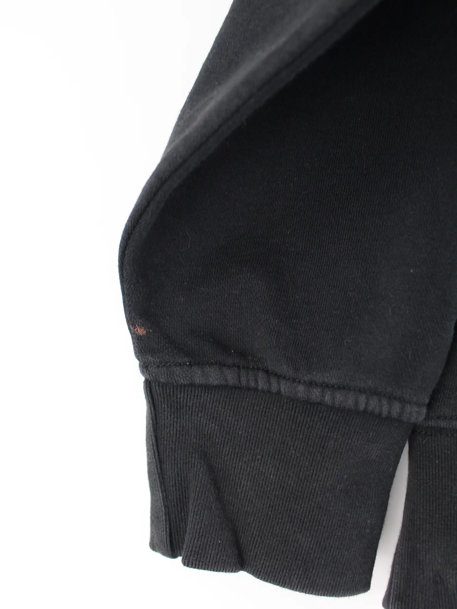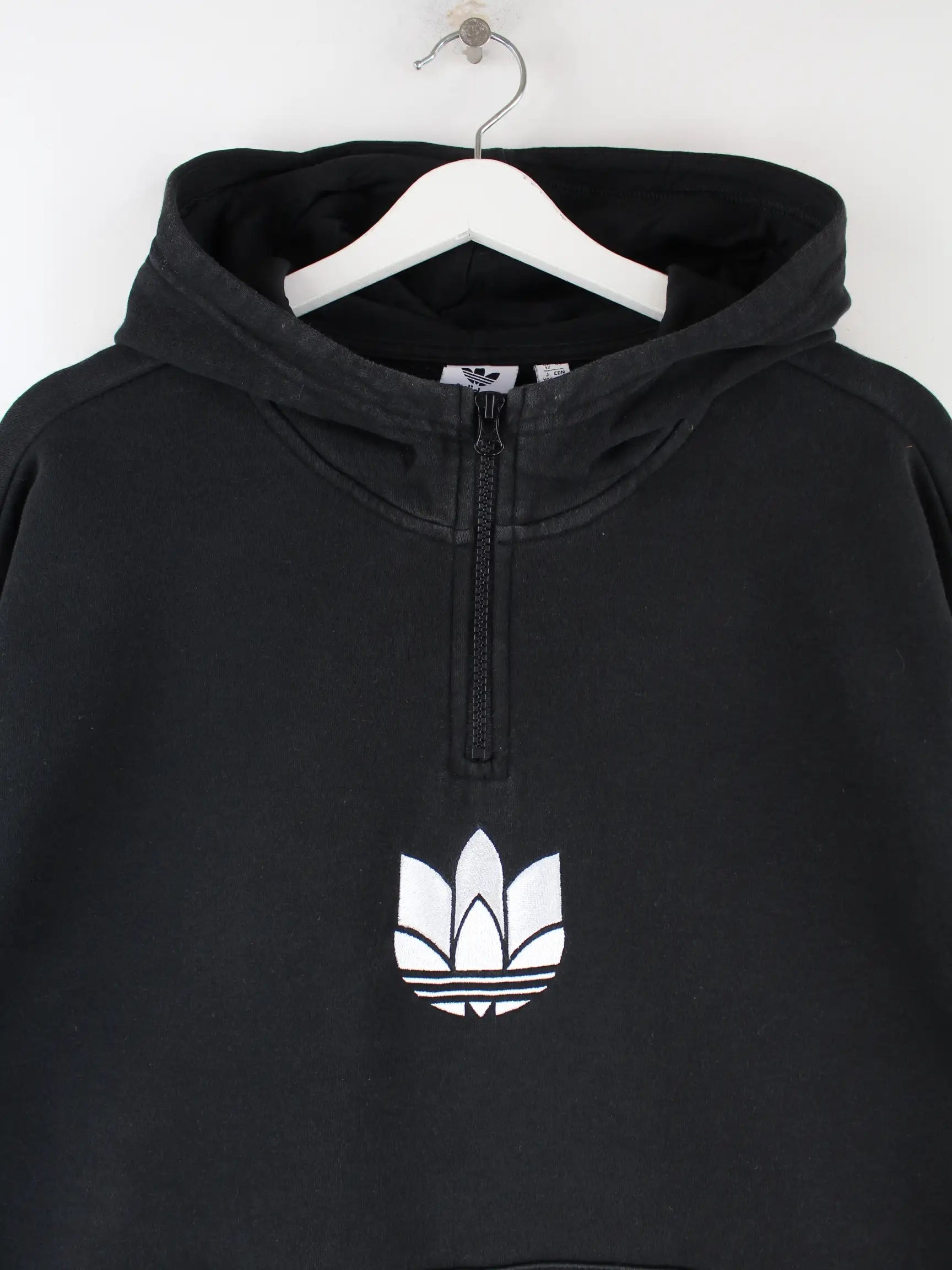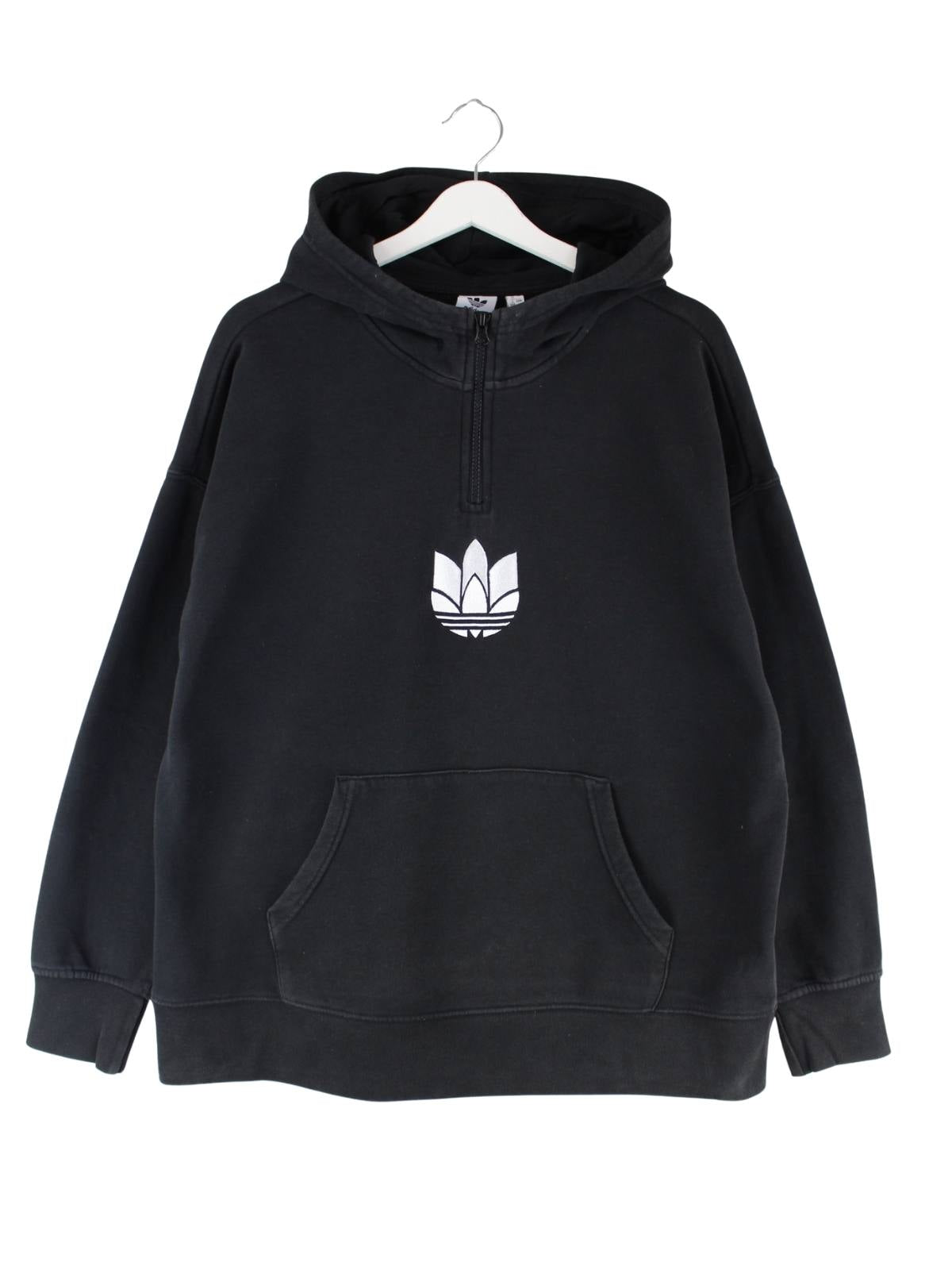 Schwarzer Hoodie mit Stickereien und half Zip von Adidas in Größe M. Er ist aus einer Baumwollmischung produziert und in gutem Zustand zu haben.