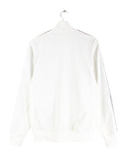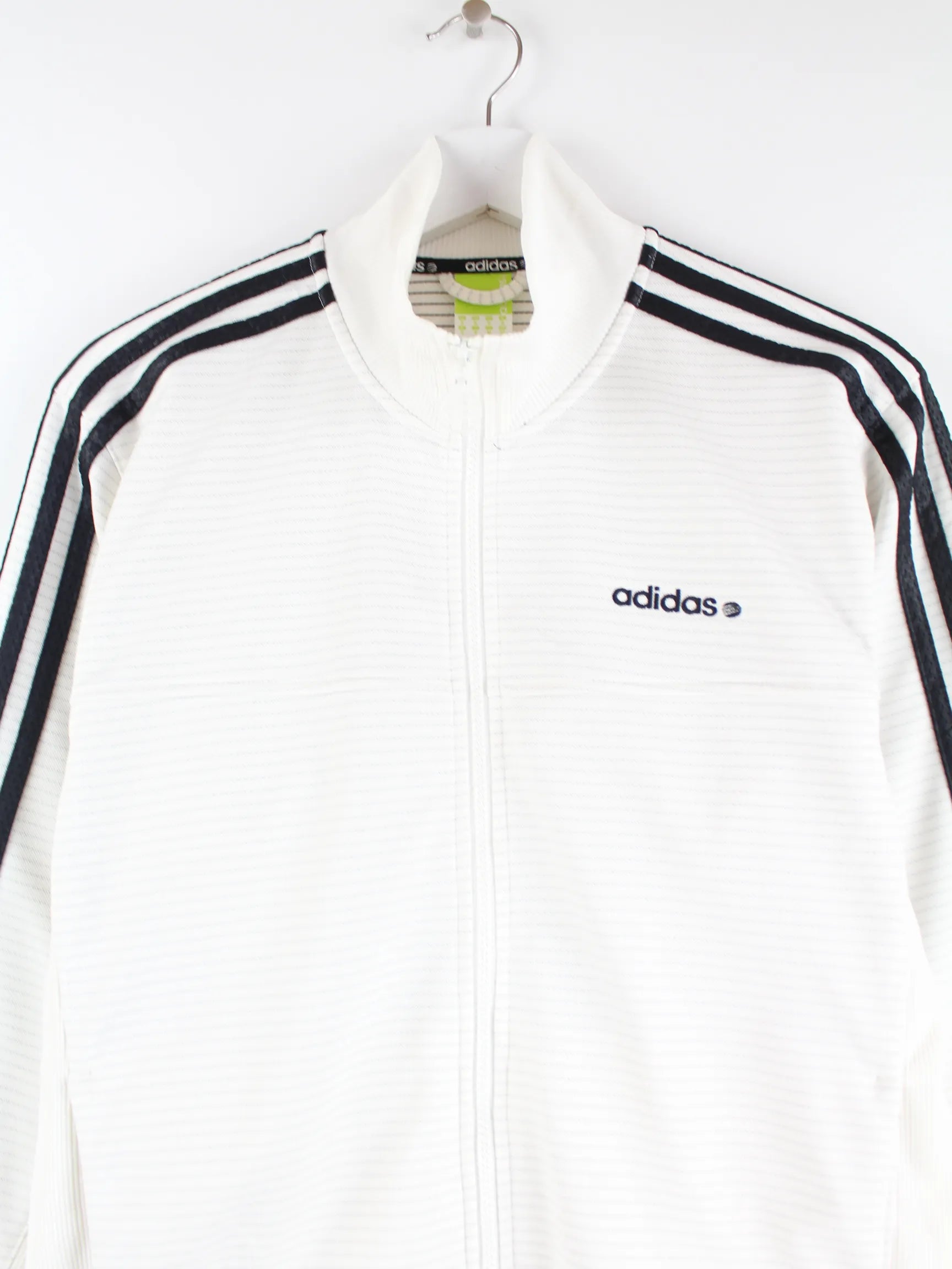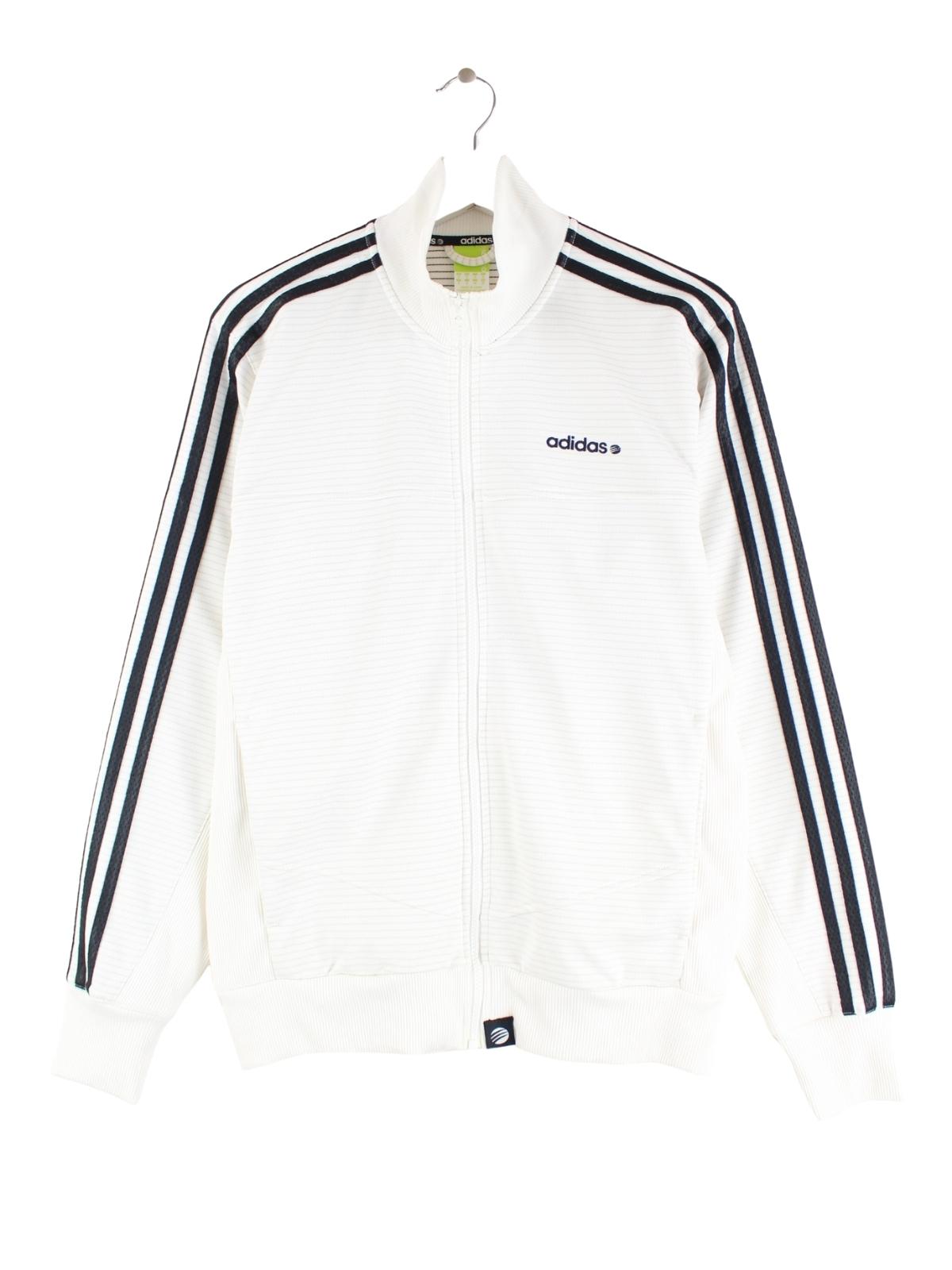 Weiße Trainingsjacke des Labels Adidas in Größe S. Sie ist aus Synthetik gefertigt und in gutem Zustand bei uns zu bekommen.