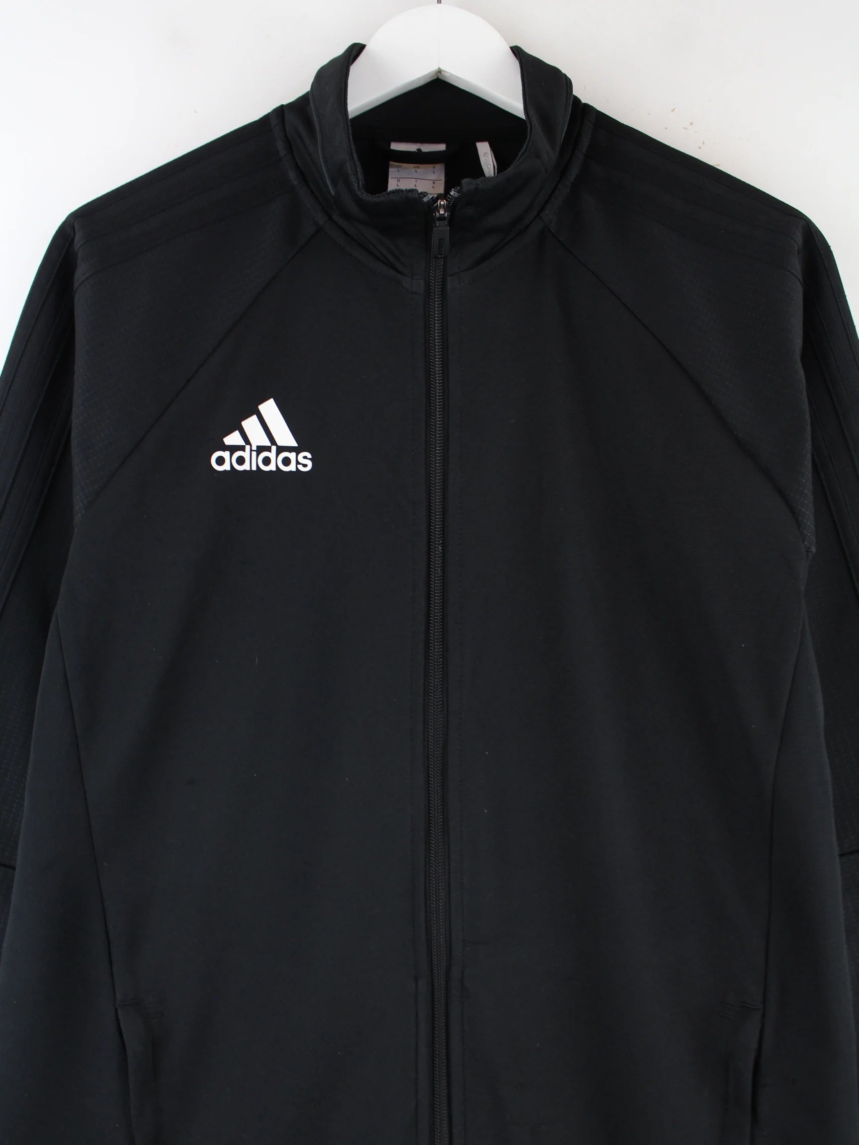 Schwarze Trainingsjacke vom Brand Adidas in Größe L. Sie ist aus Synthetik angefertigt und in gutem Zustand vorrätig.