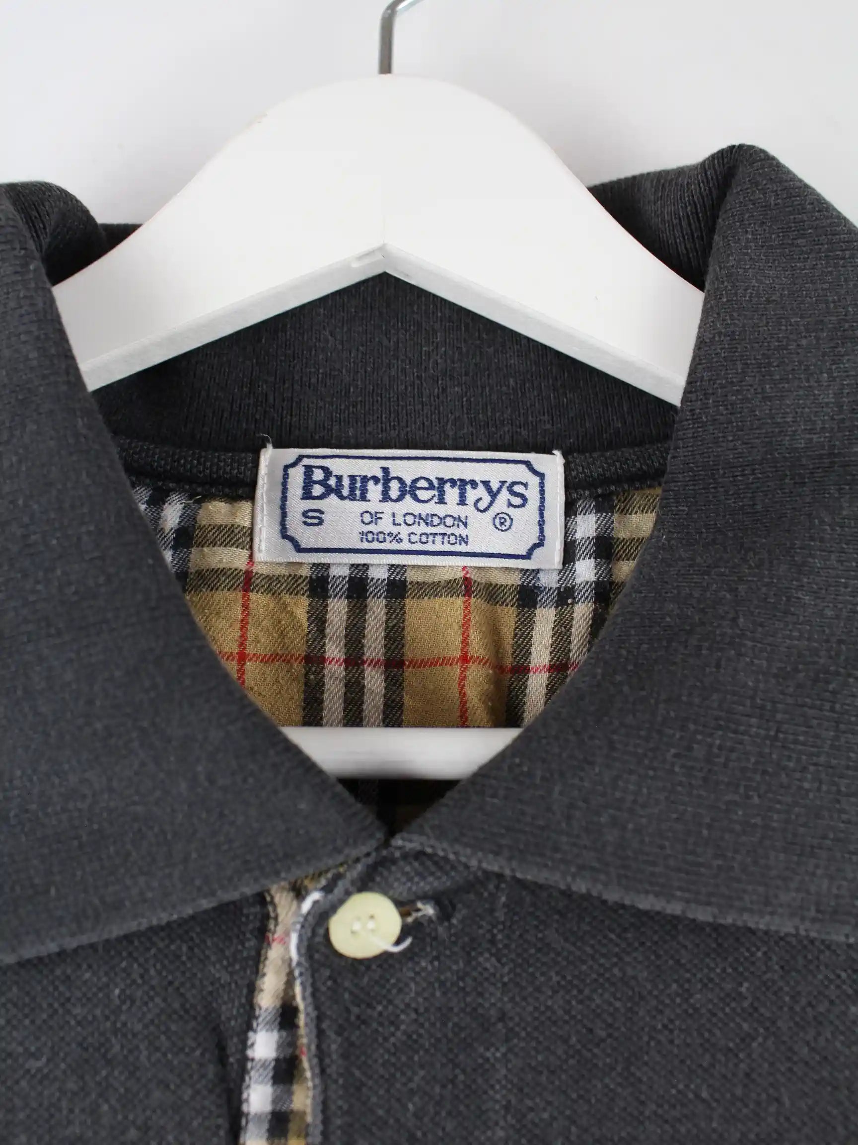Graues Poloshirt vom Brand Burberry aus den 80'ern in Größe S. Es ist aus Baumwolle hergestellt und in gutem Zustand zu bekommen.