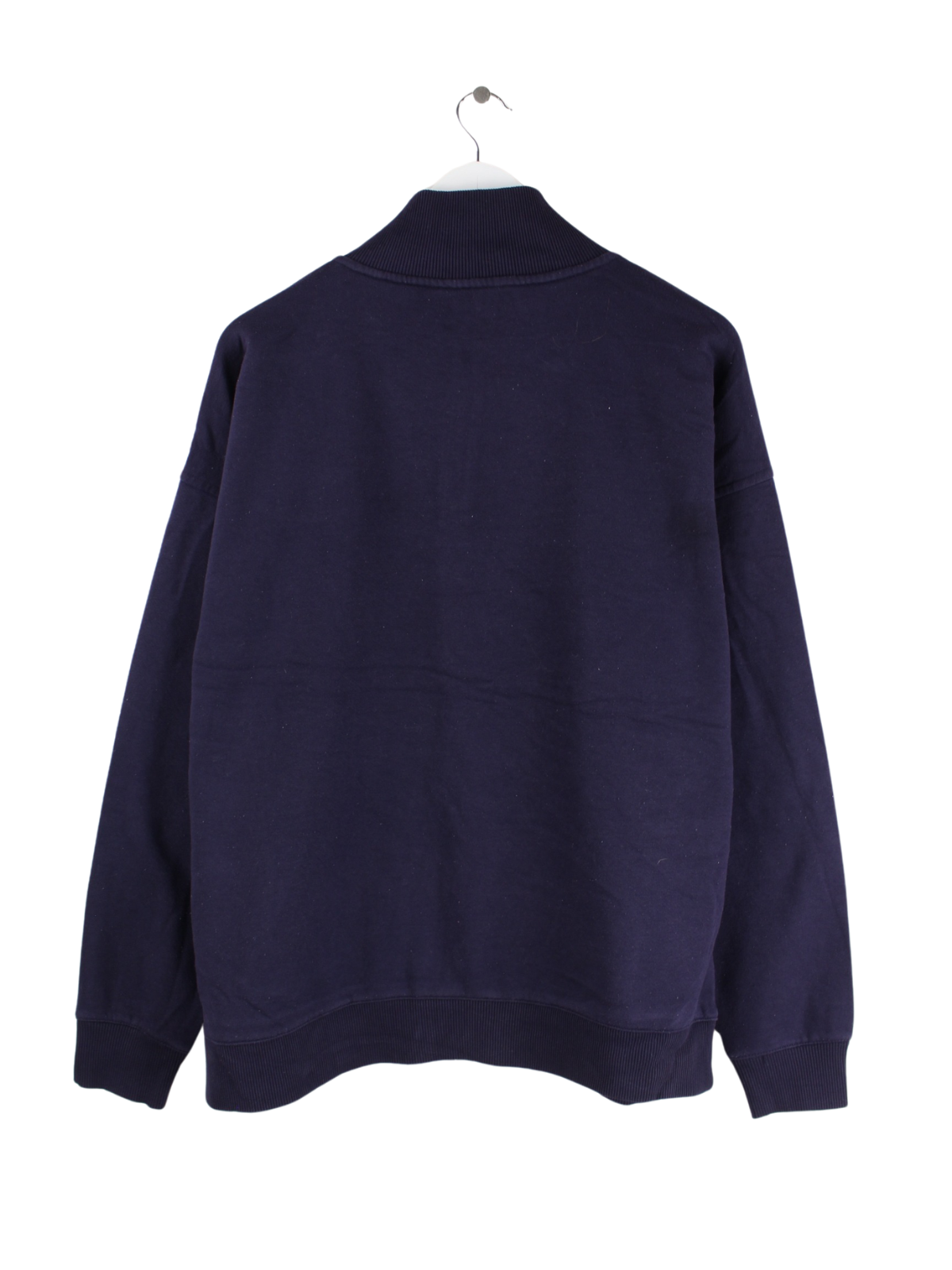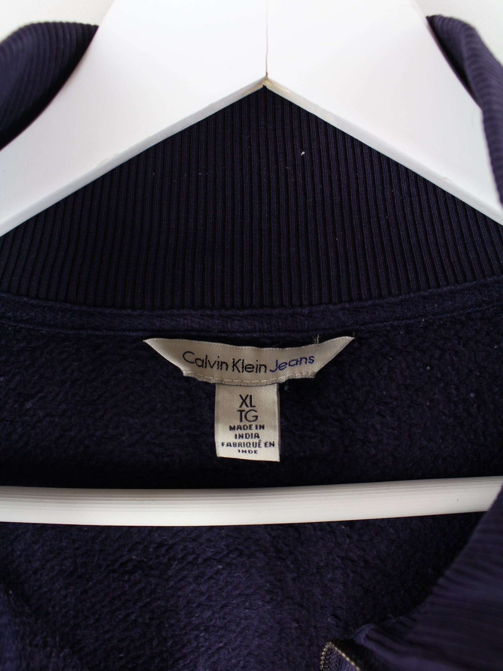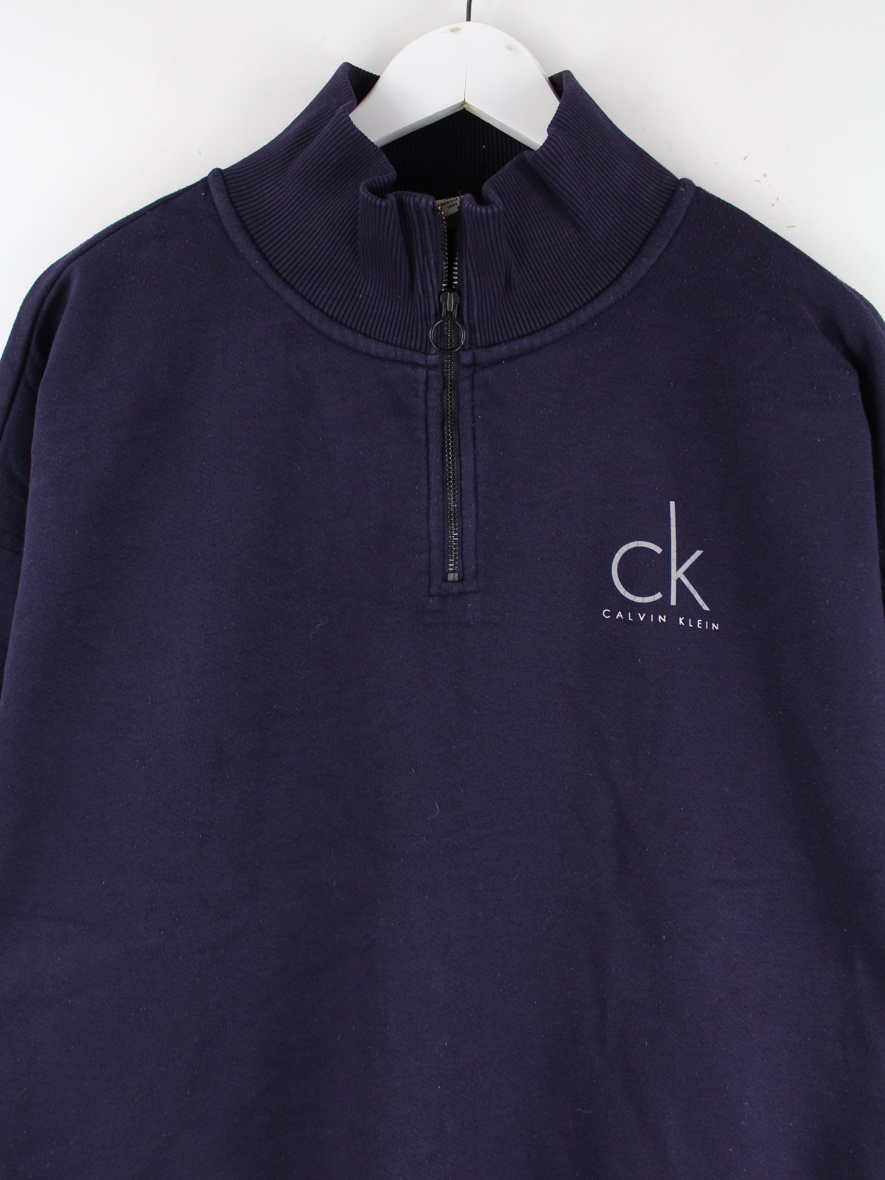 Blauer Sweater mit halbem Reißverschluß der Marke Calvin Klein in Größe XL. Er ist aus einer Baumwollmischung angefertigt und in gutem Zustand zu bekommen. Mit schickem 00s Print.