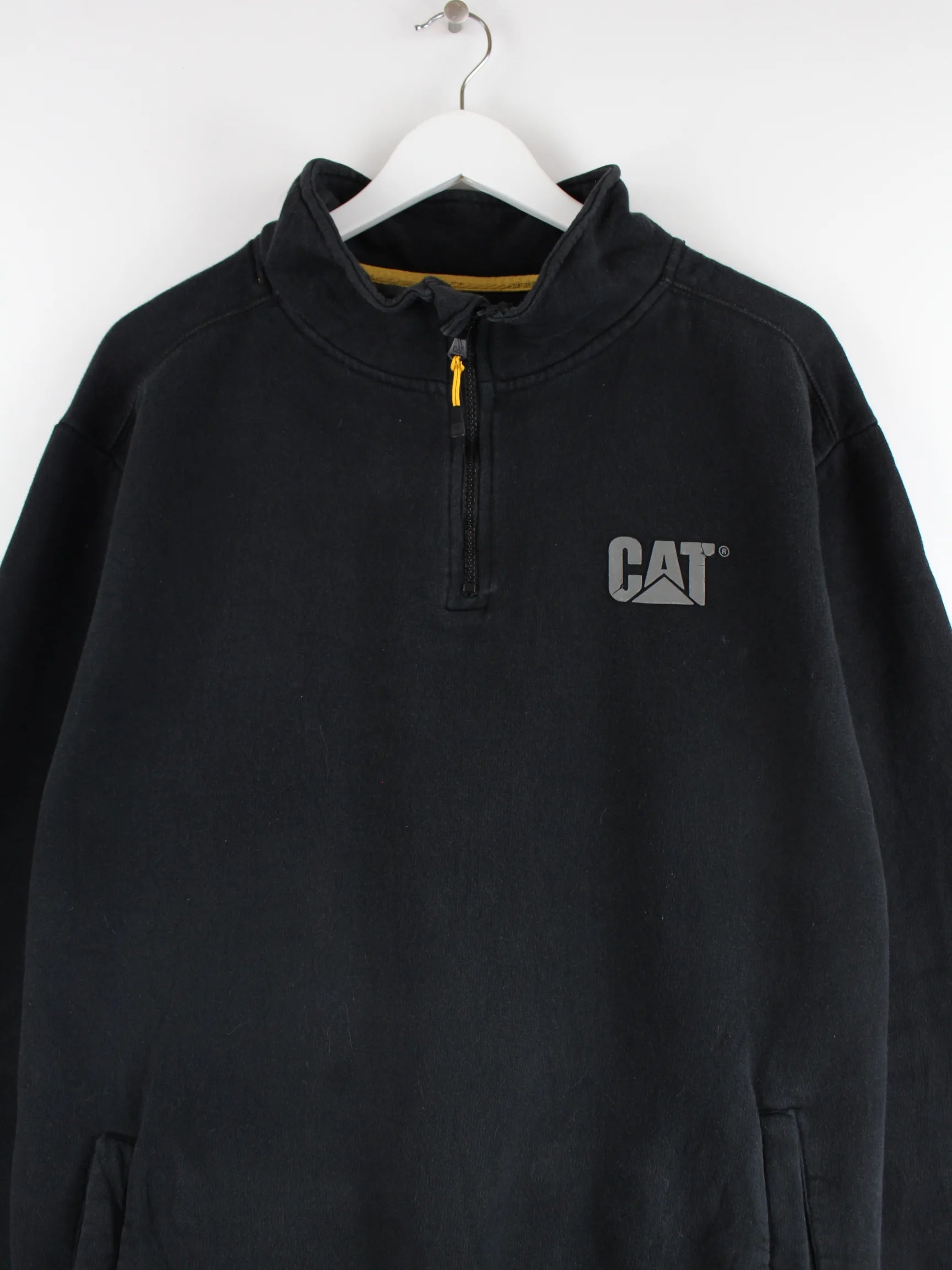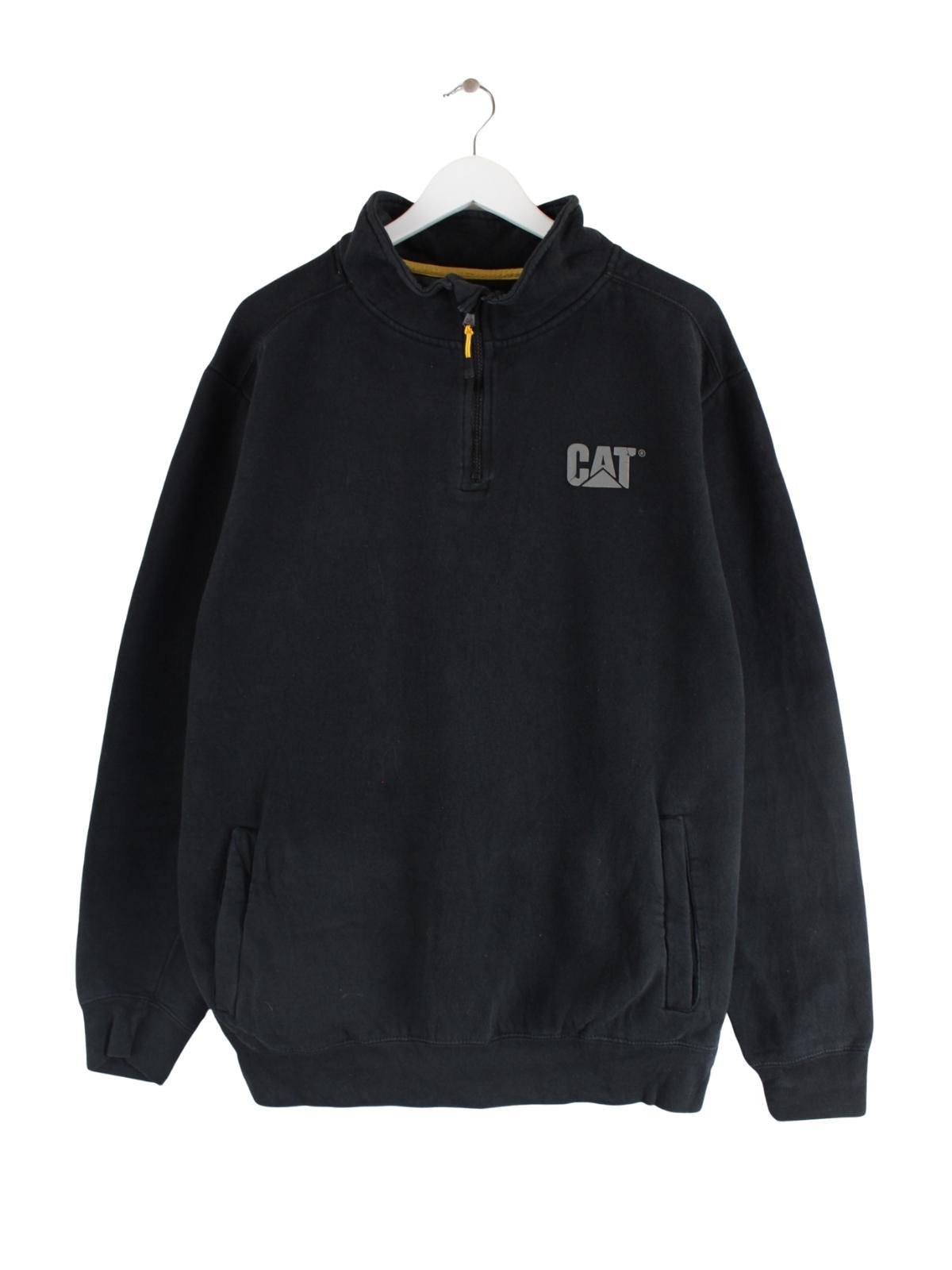 Schwarzer Sweater mit kurzem Reißverschluß von CAT in Größe L. Er ist aus einer Baumwollmischung hergestellt und in gutem Zustand auf Lager.
