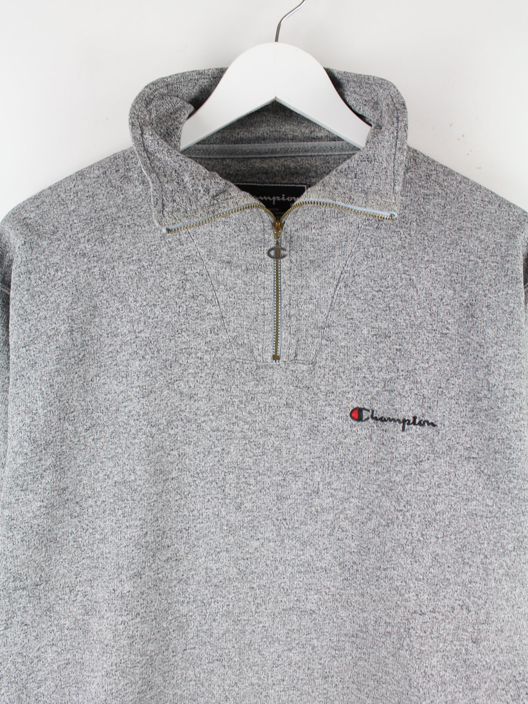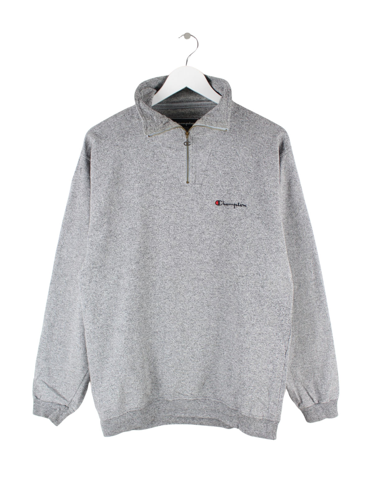 Grauer Sweater mit halbem Reißverschluß vom Brand Champion in Größe M. Er ist aus einer Baumwollmischung und in sehr gutem Zustand lieferbar.