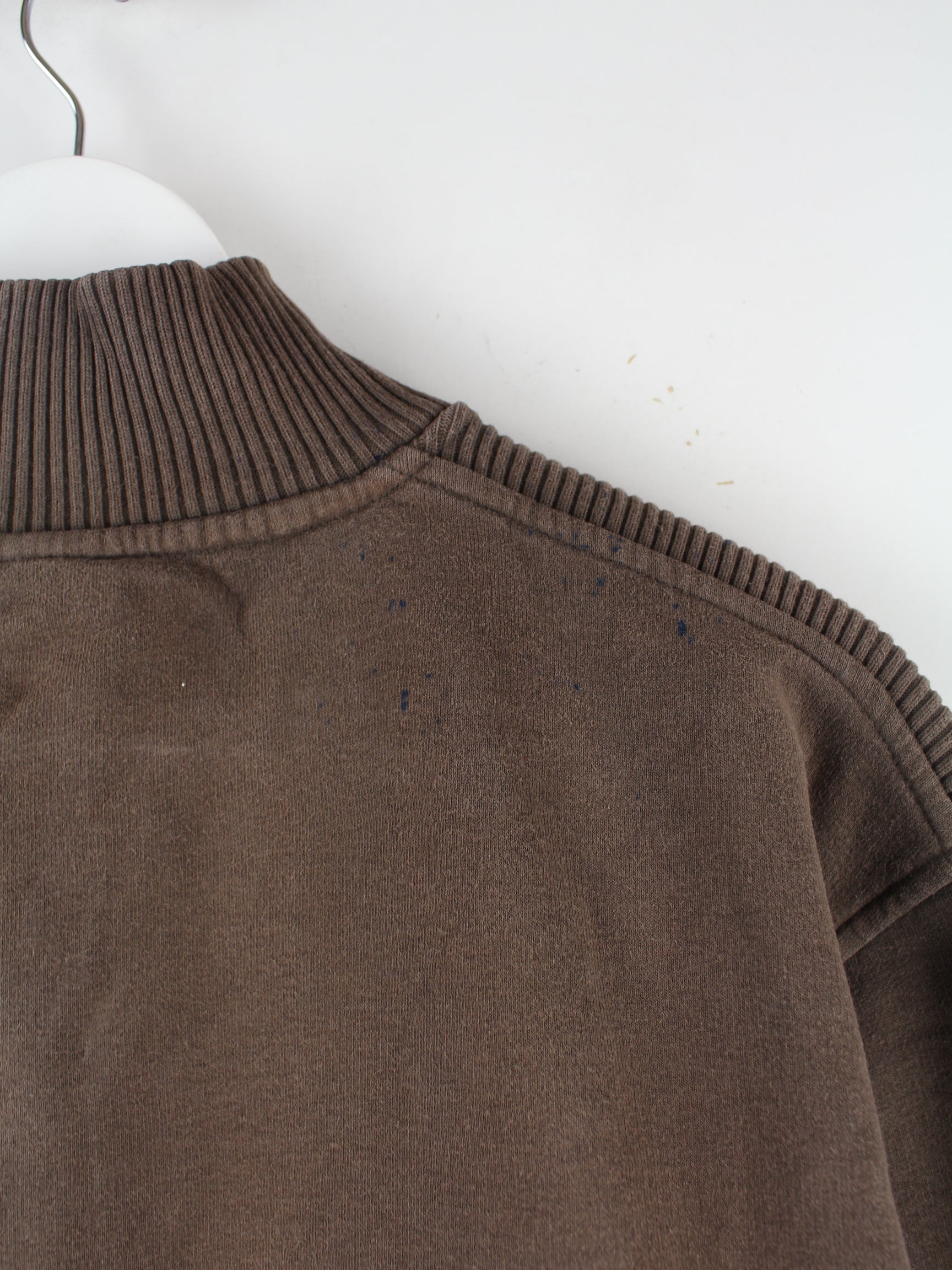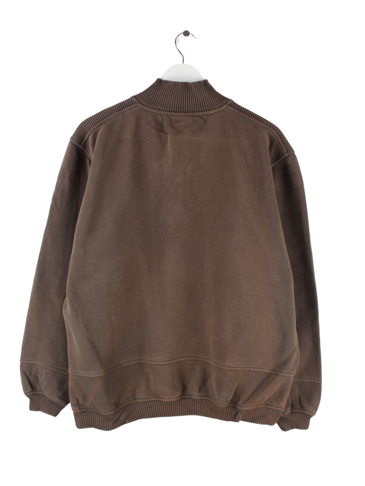 Sweater der Marke Champion mit halbem Reißverschluß in Größe XL. Er ist aus einer Baumwollmischung gefertigt und in Braun im Bestand.