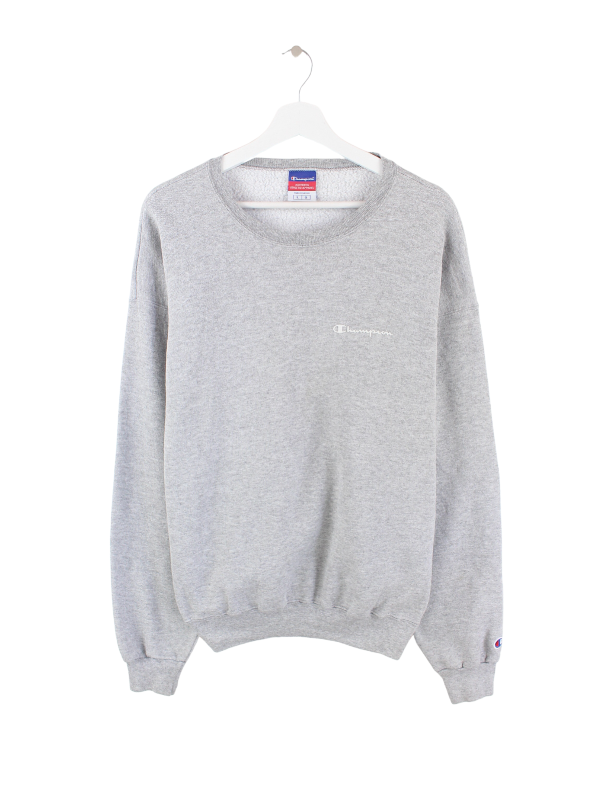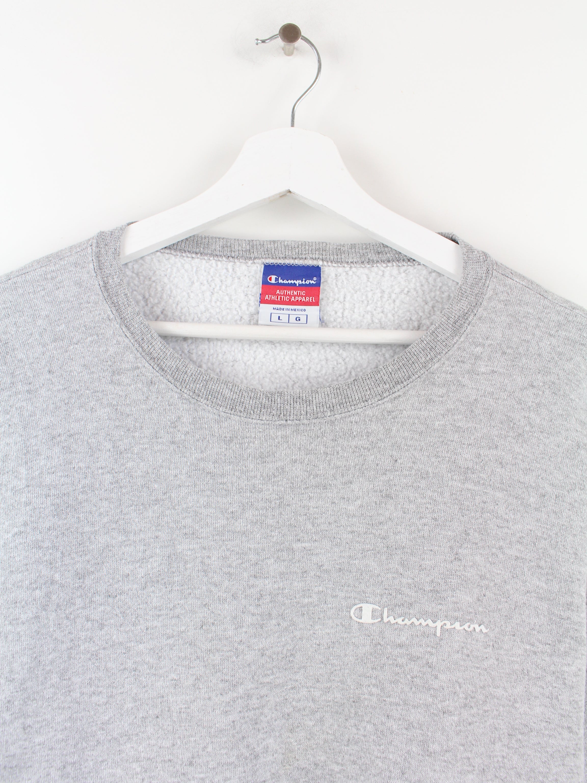 Grauer Vintage Basic Sweater der Marke Champion mit Print Logo.