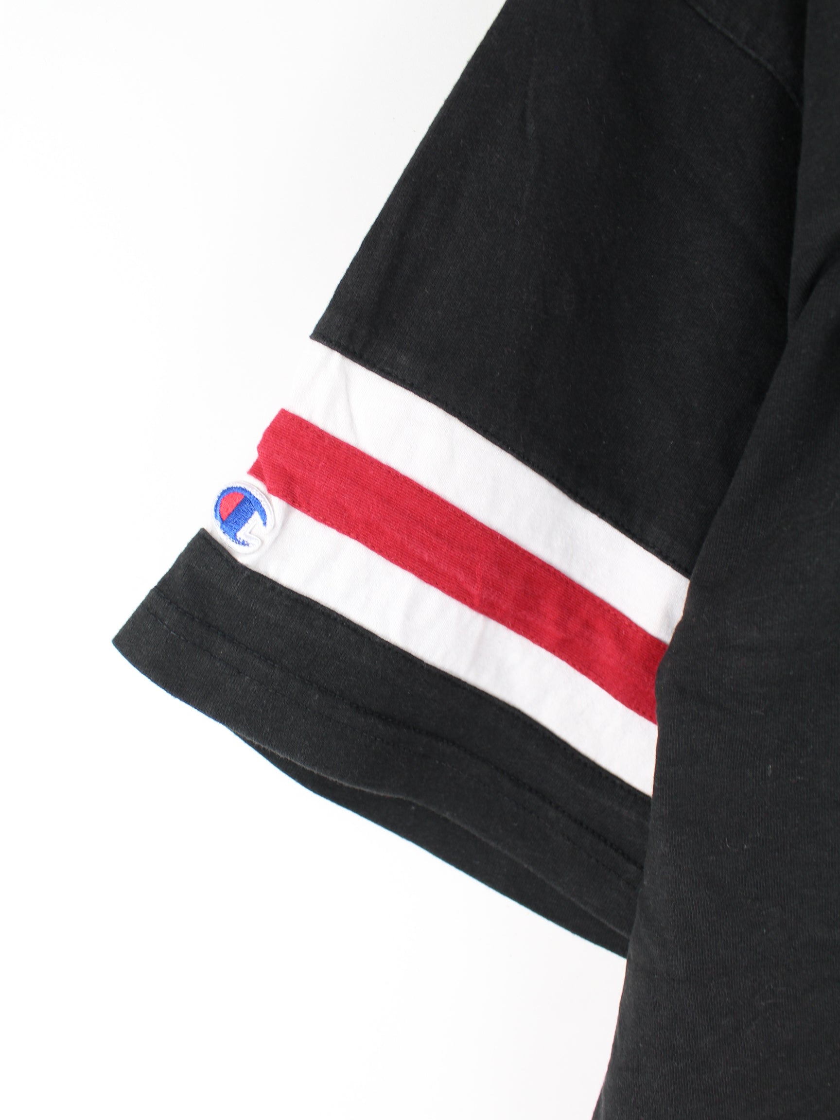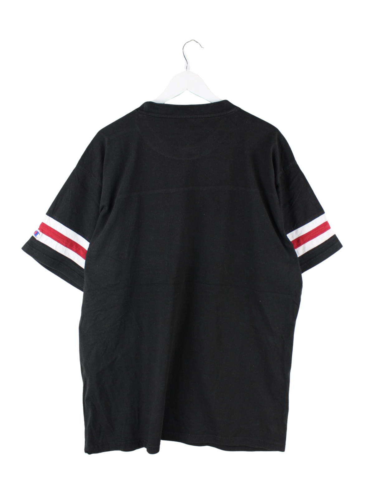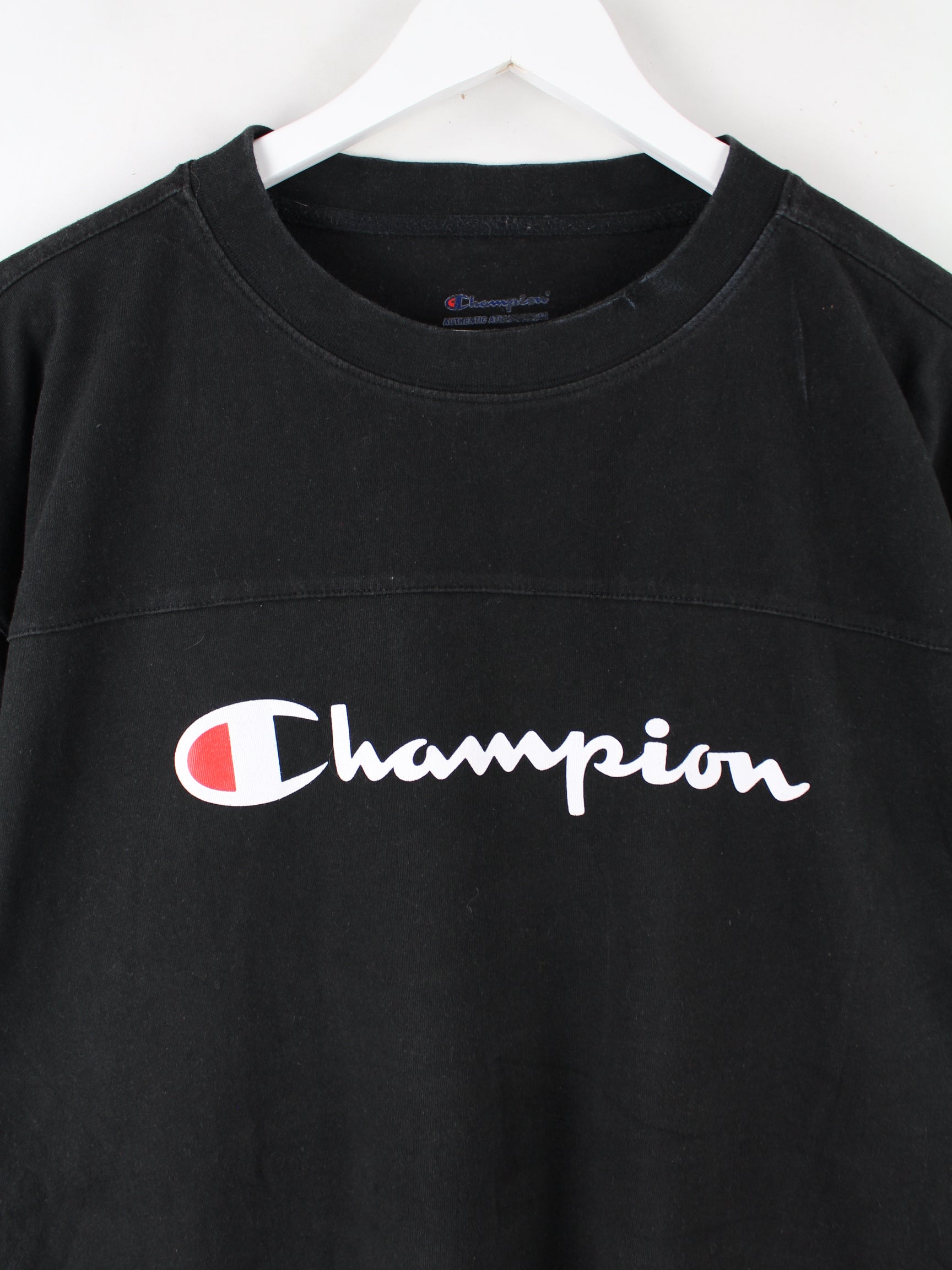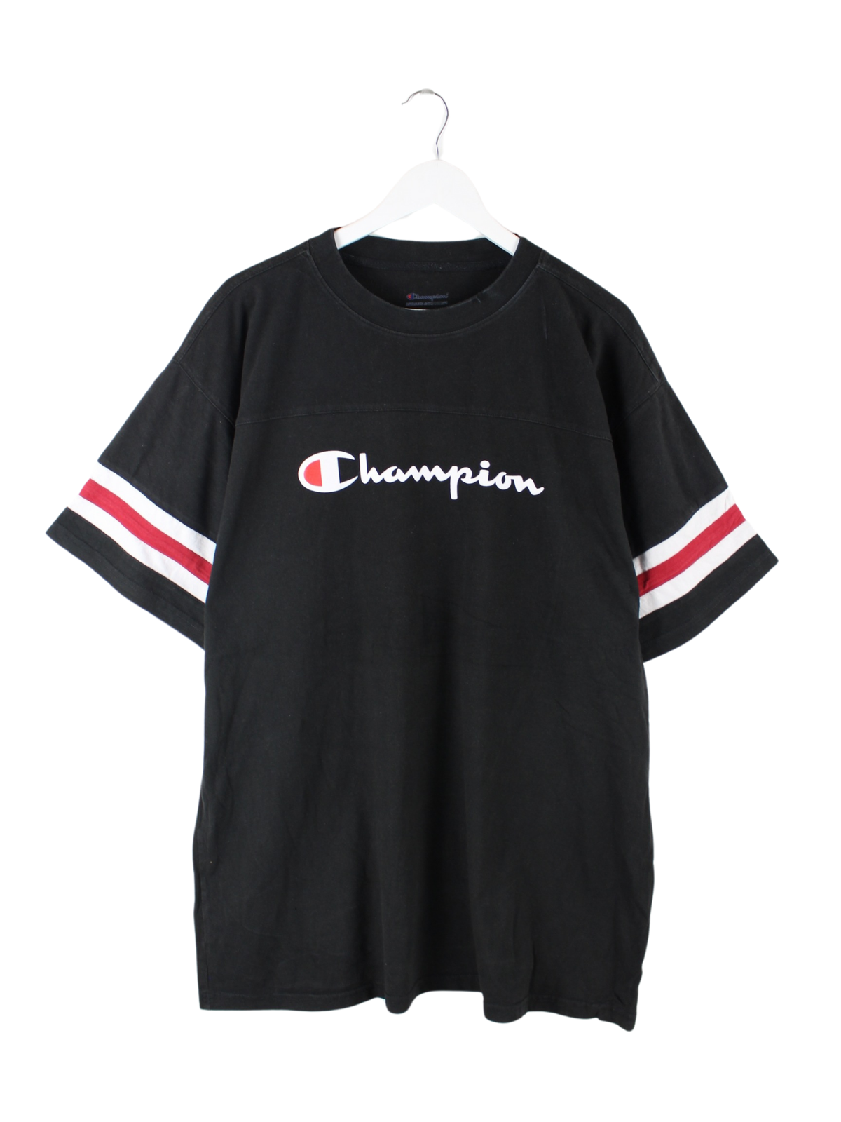 T-Shirt der Brand Champion in Größe XXL. Es ist aus Baumwolle gemacht und in Schwarz auf Lager. Mit tollem Heavy Print.