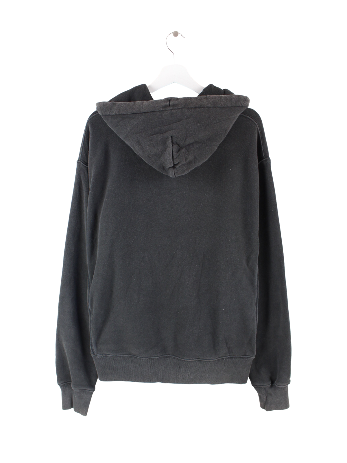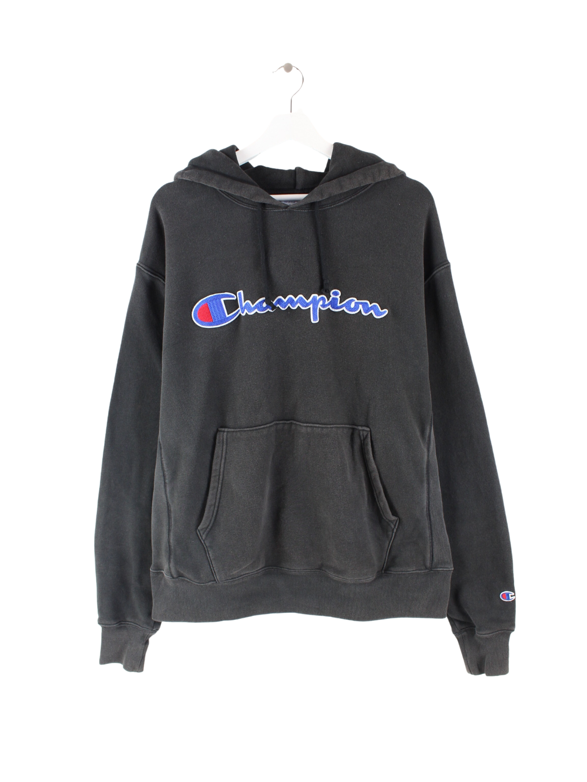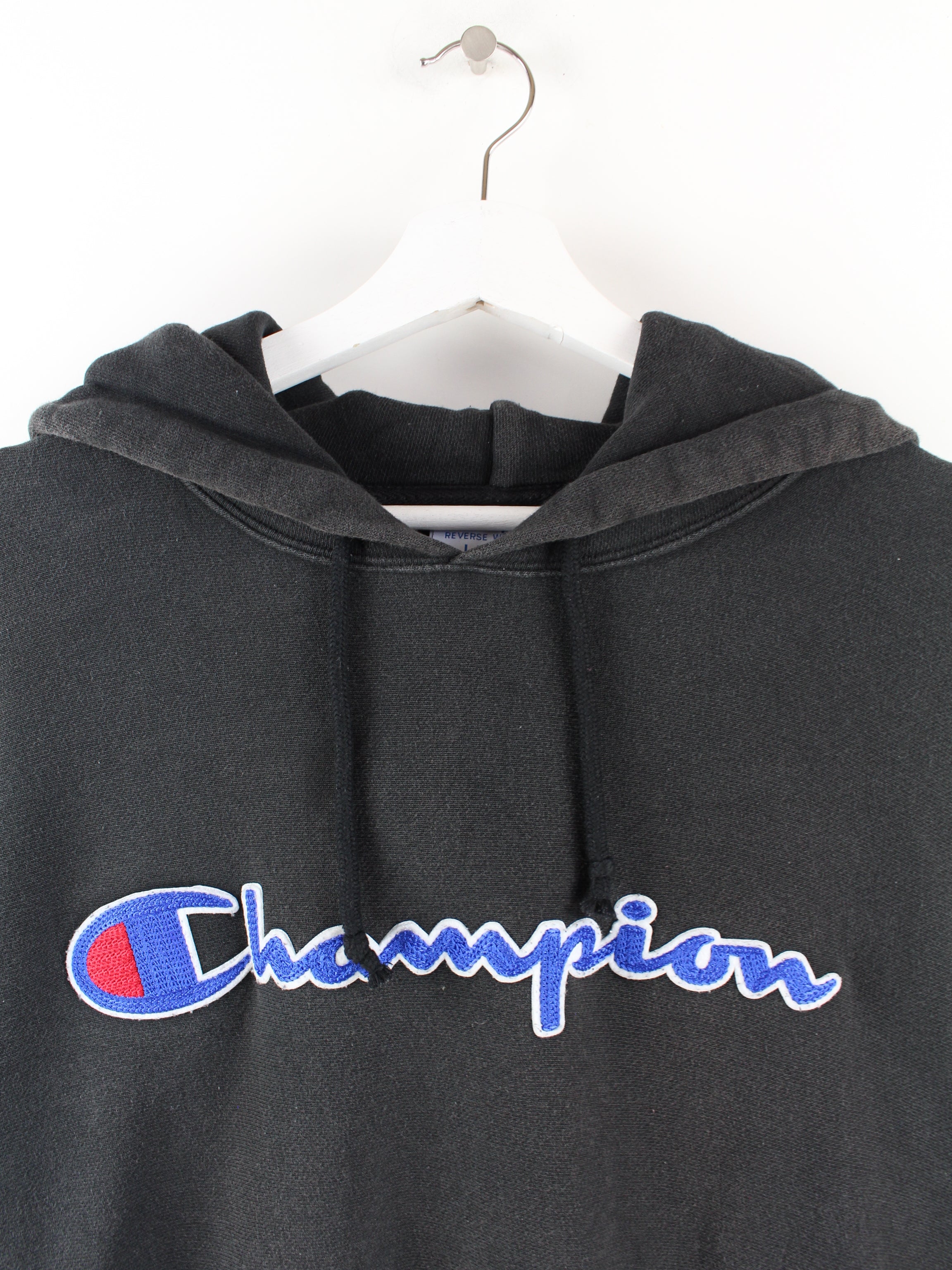 Schwarzer Champion Reverse Weave Hoodie mit großem aufgesticktem Logo.