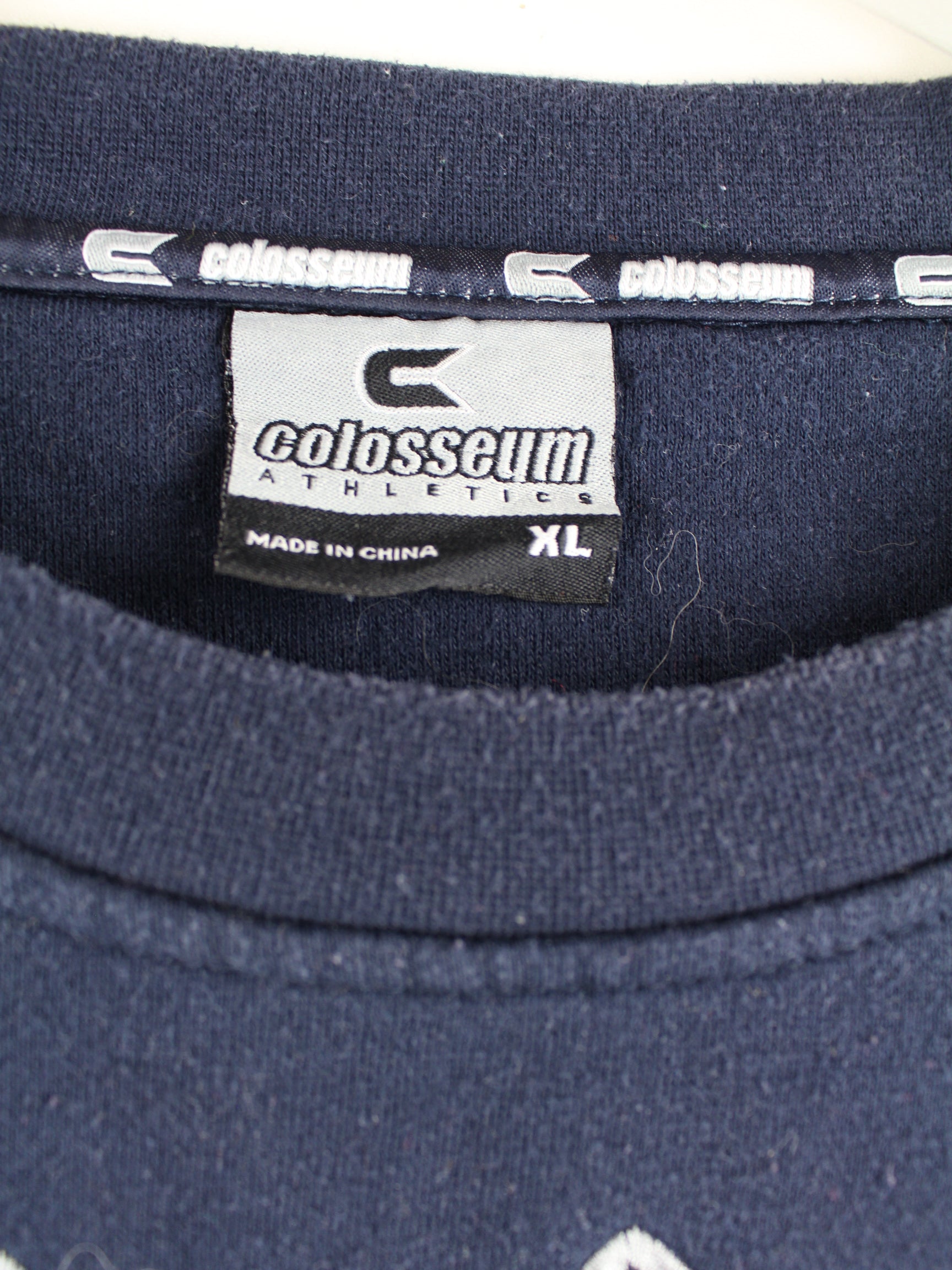 Blauer Sweater mit Stickereien aus dem Hause Colosseum Athletics in Größe XL. Er ist aus einer Baumwollmischung hergestellt und in gutem Zustand auf Lager.