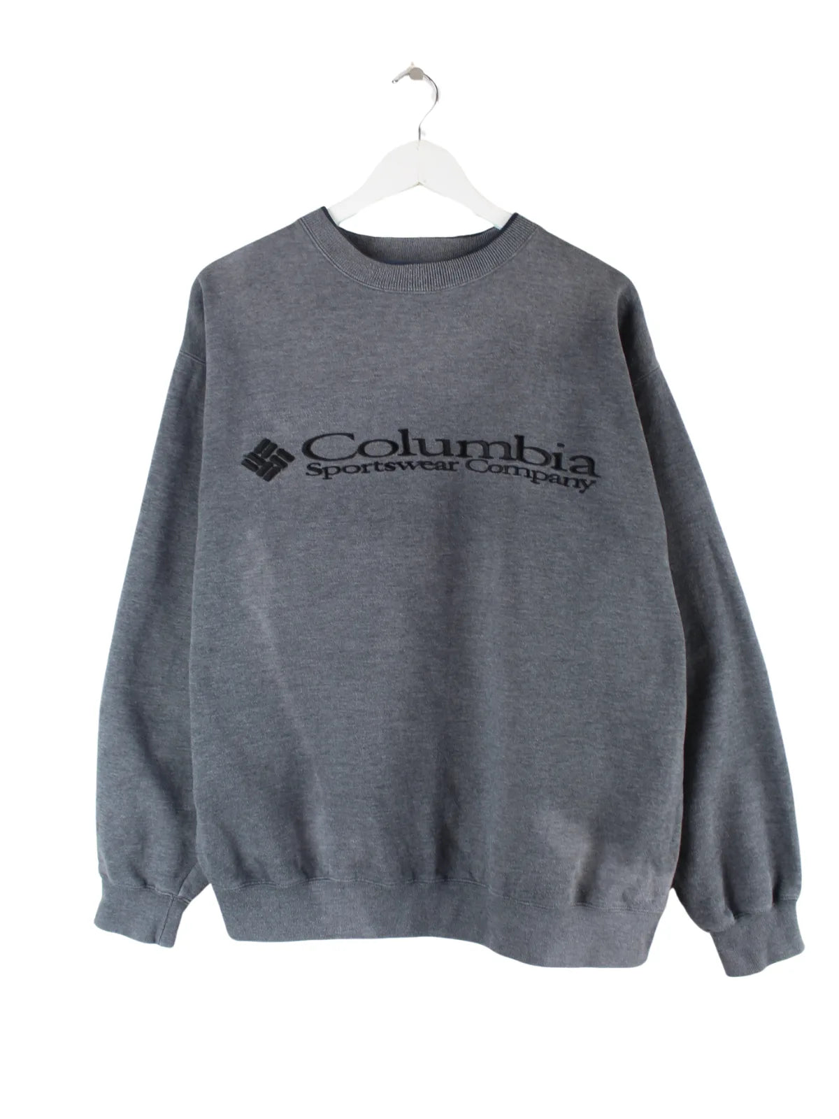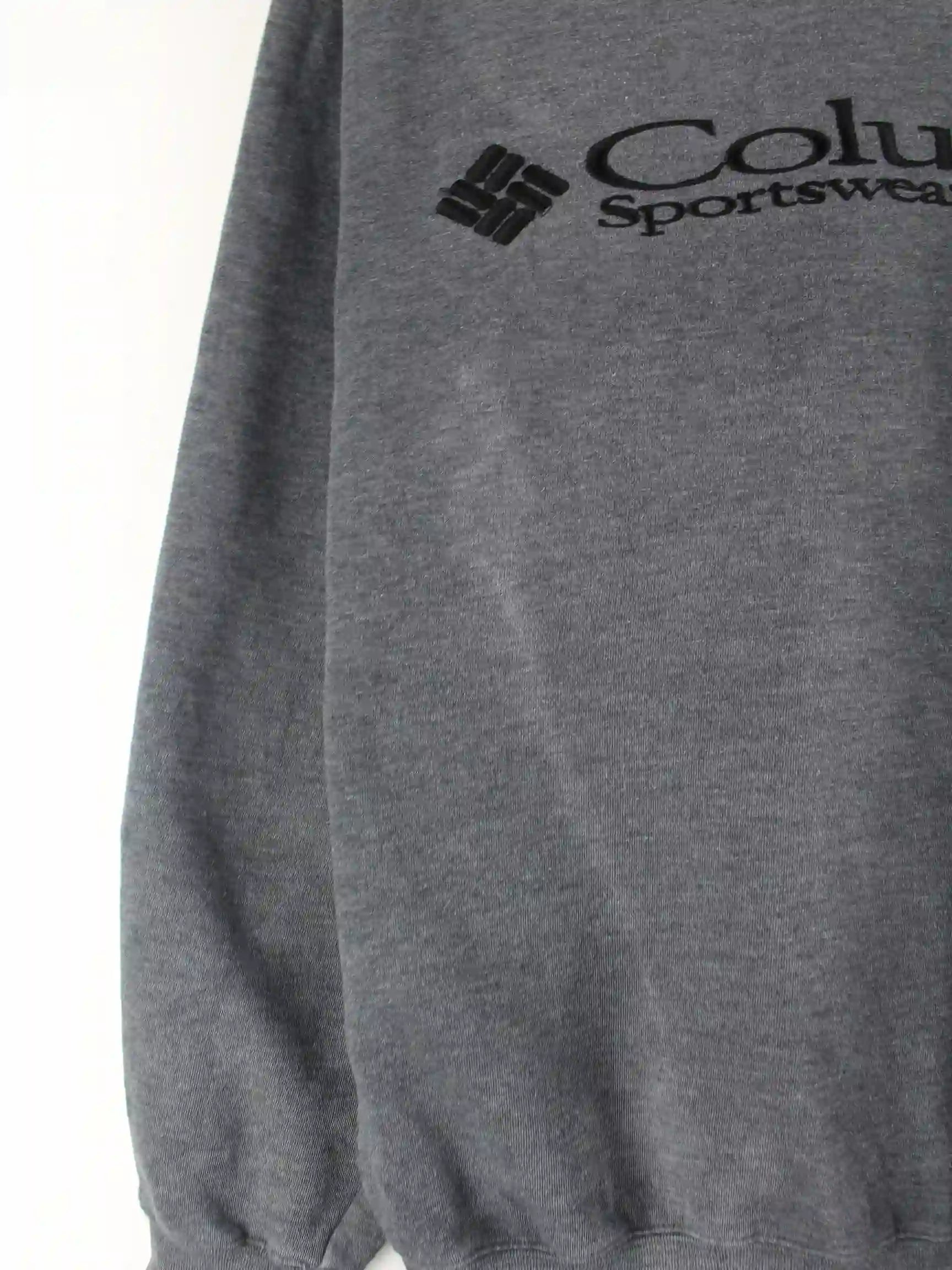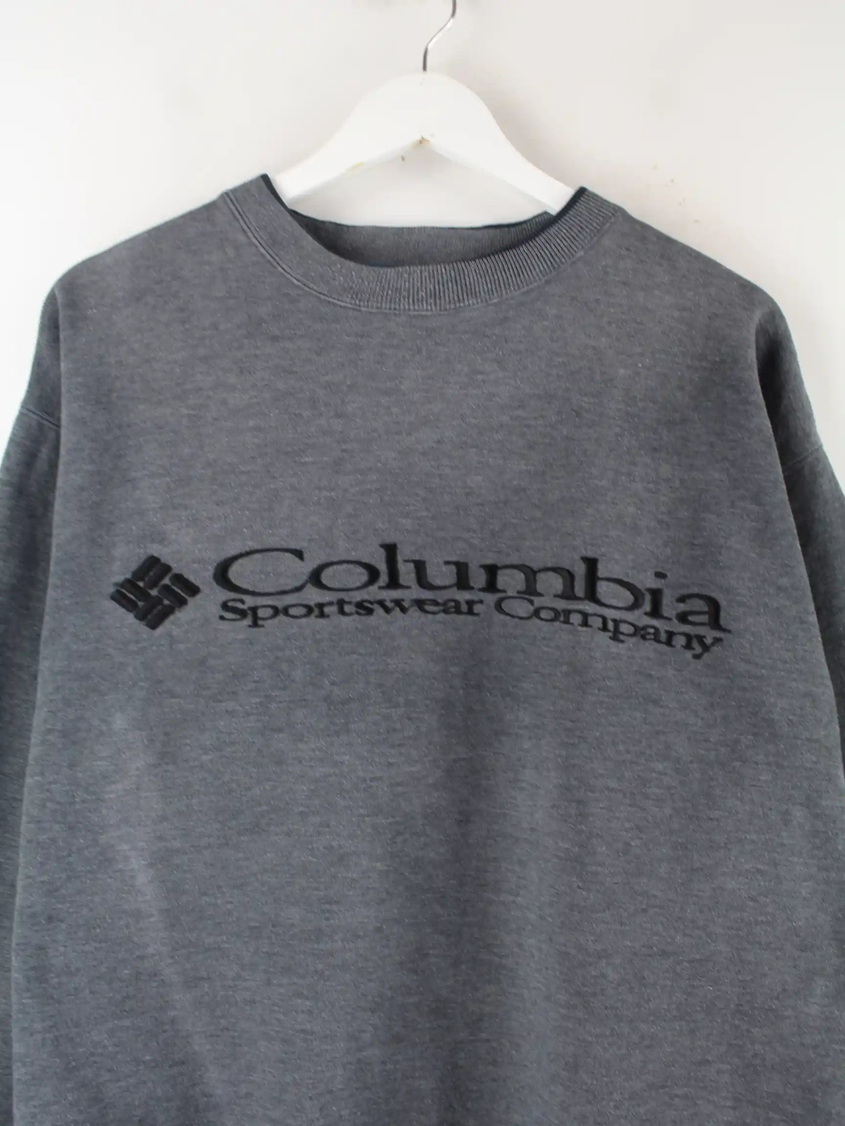 Sweater vom Label Columbia mit gestickten Motiven in Größe L. Er ist aus einer Baumwollmischung produziert und in Grau lieferbar.