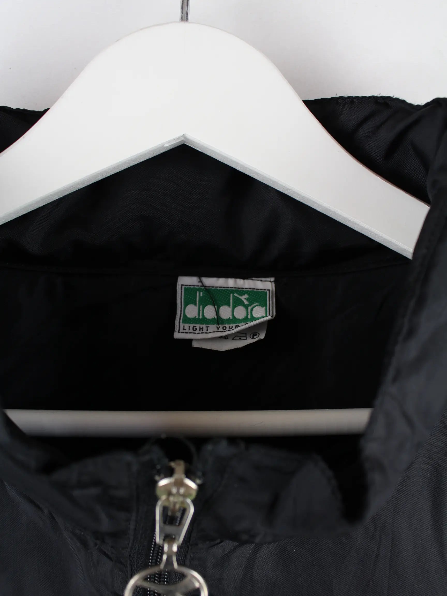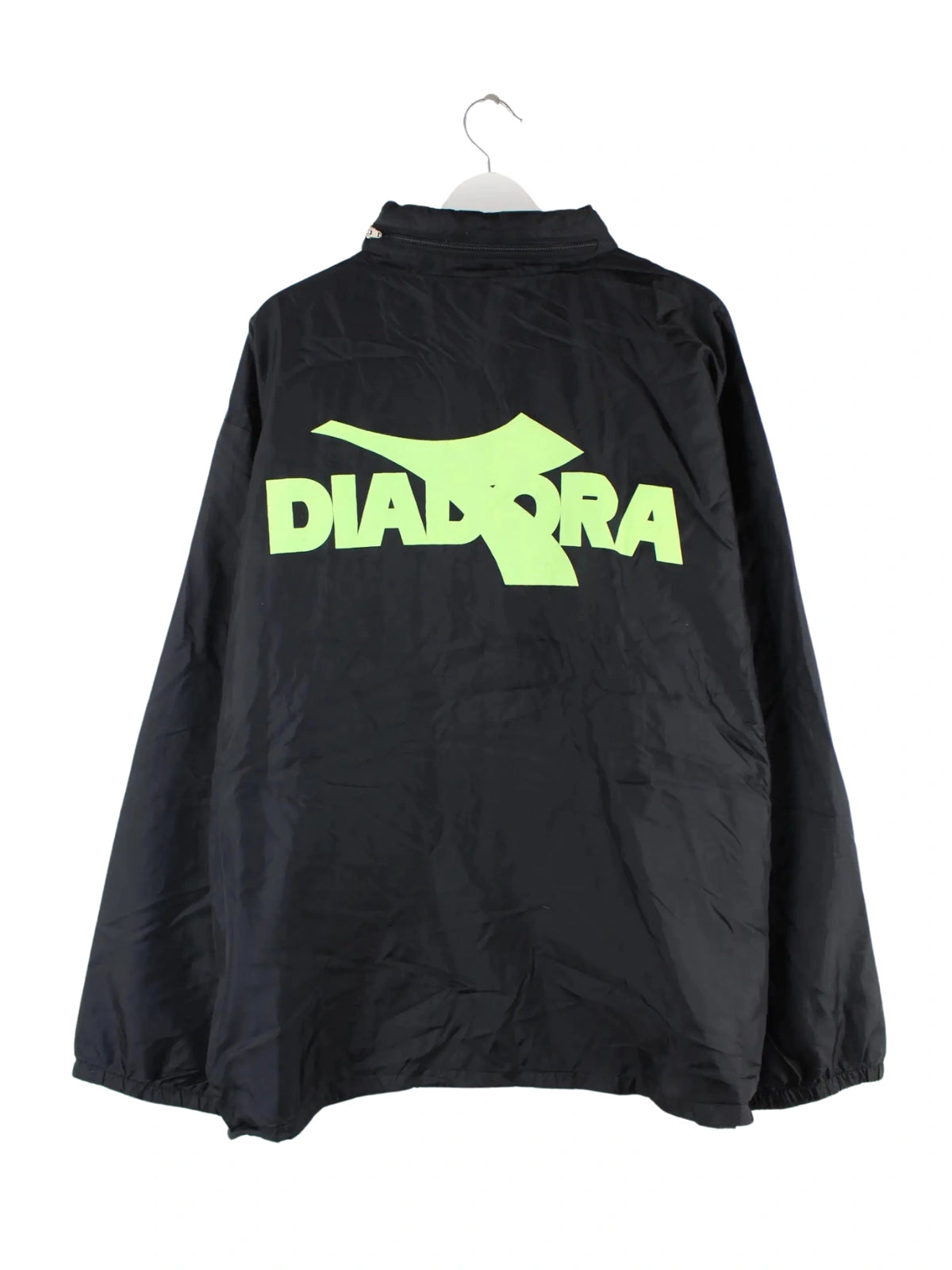 Schwarzer Windbreaker aus dem Hause Diadora aus den 90'ern in Größe XXL. Er ist aus Synthetik hergestellt und in sehr gutem Zustand im Angebot. Mit chiquem Vintage Print.