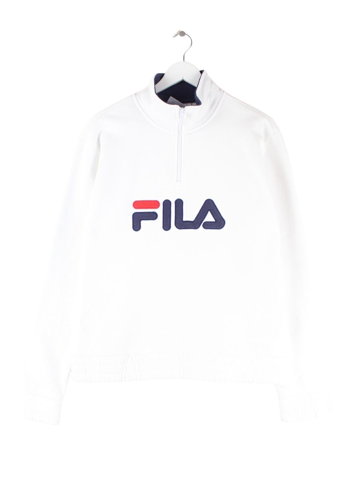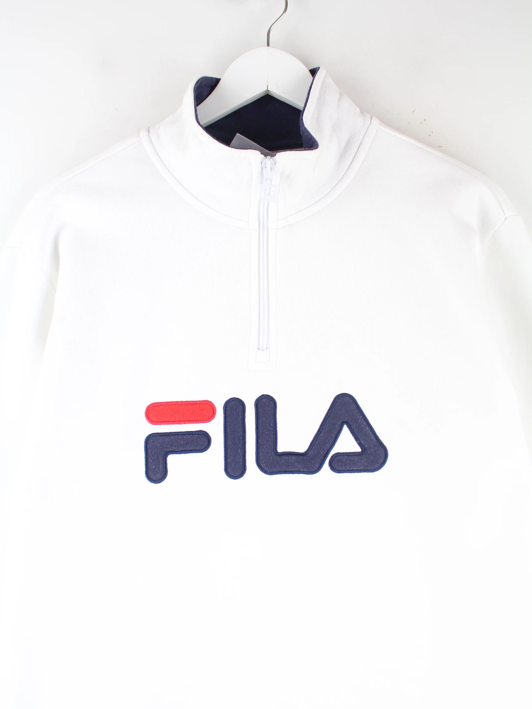 Weißer Sweater mit gesticktem Logo und half Zip des Labels Fila in Größe L. Er ist aus einer Baumwollmischung gemacht und in gutem Zustand lieferbar.