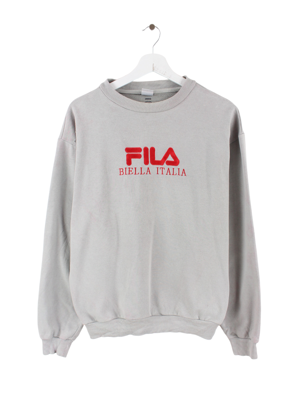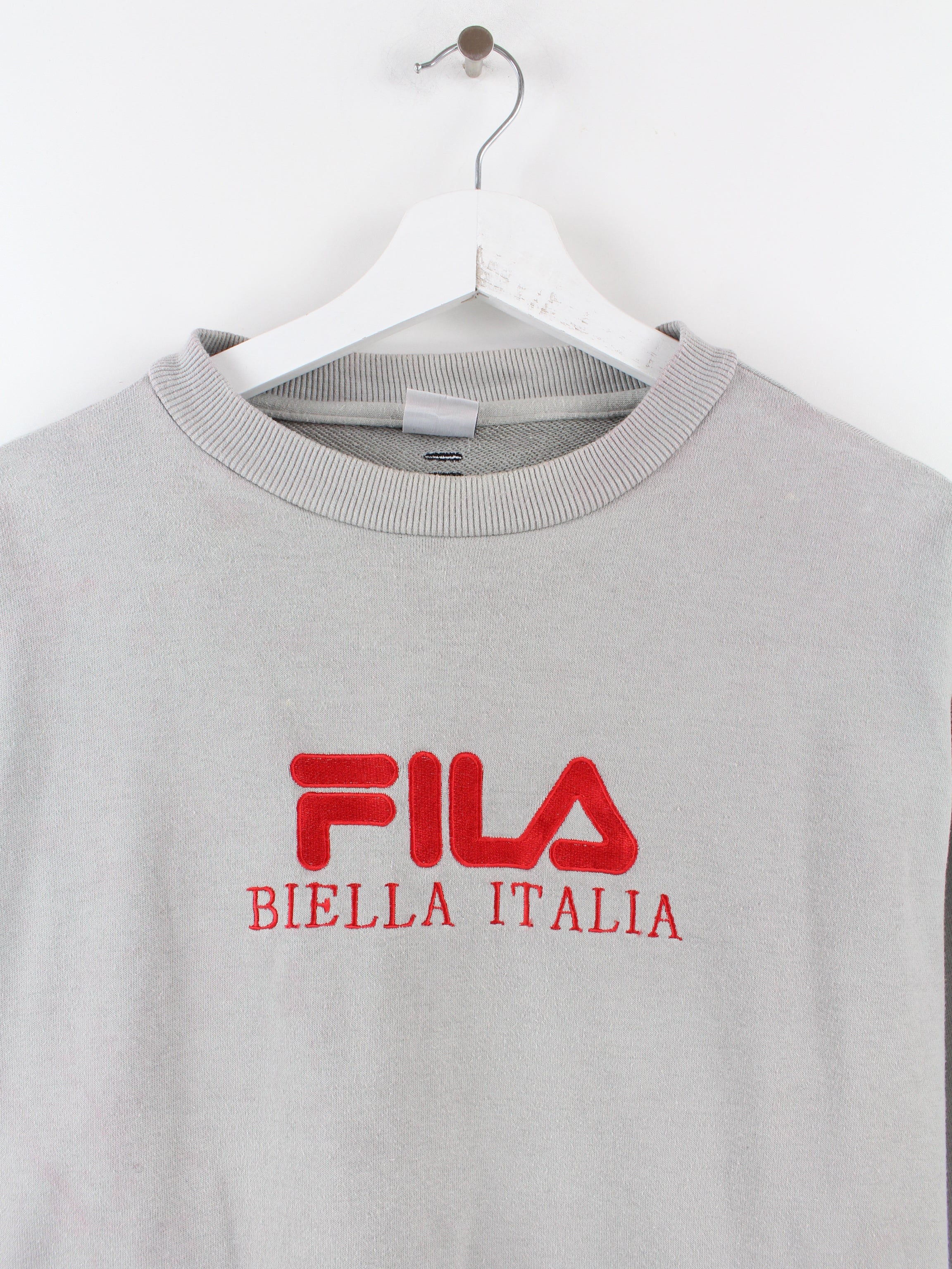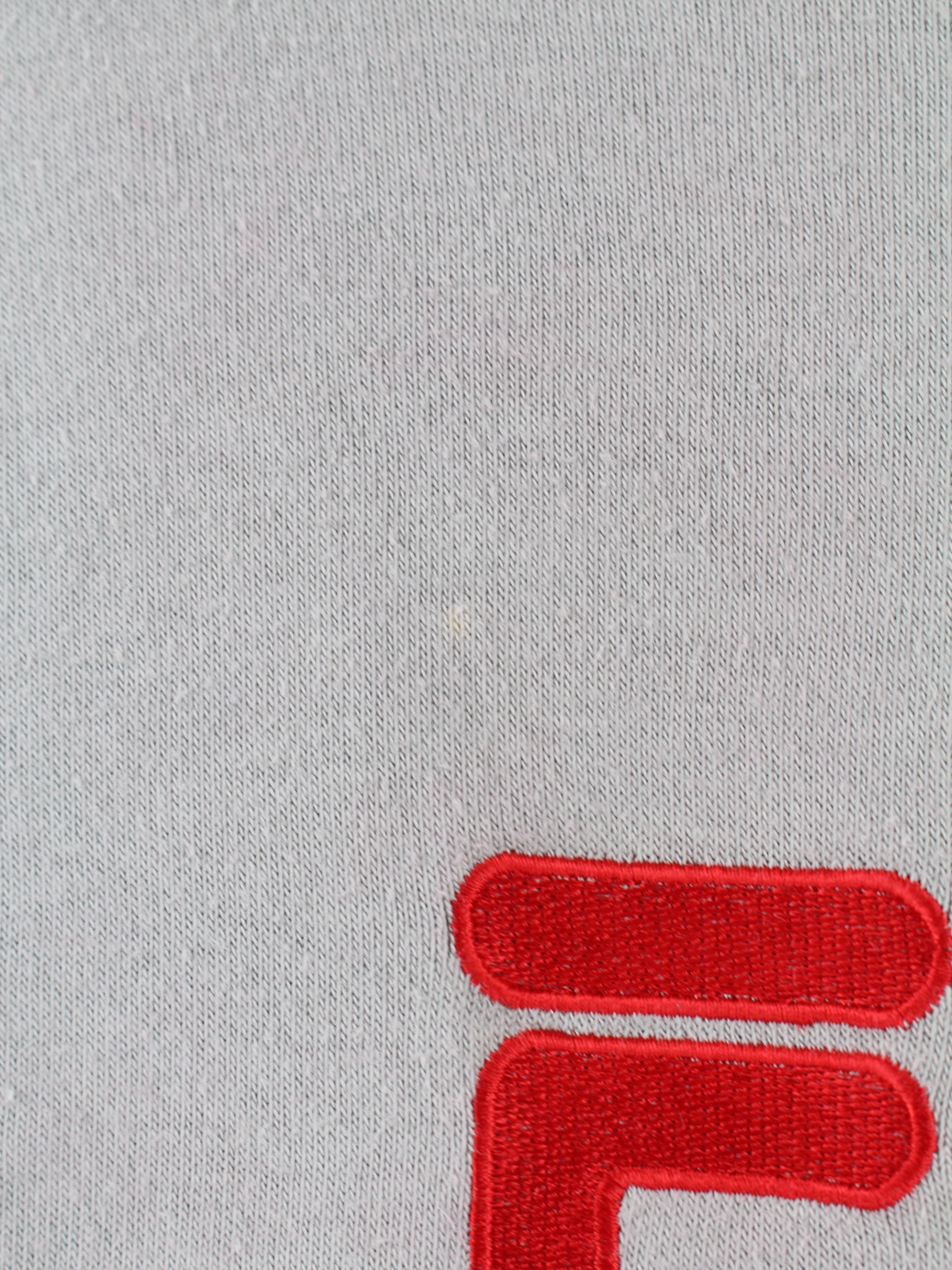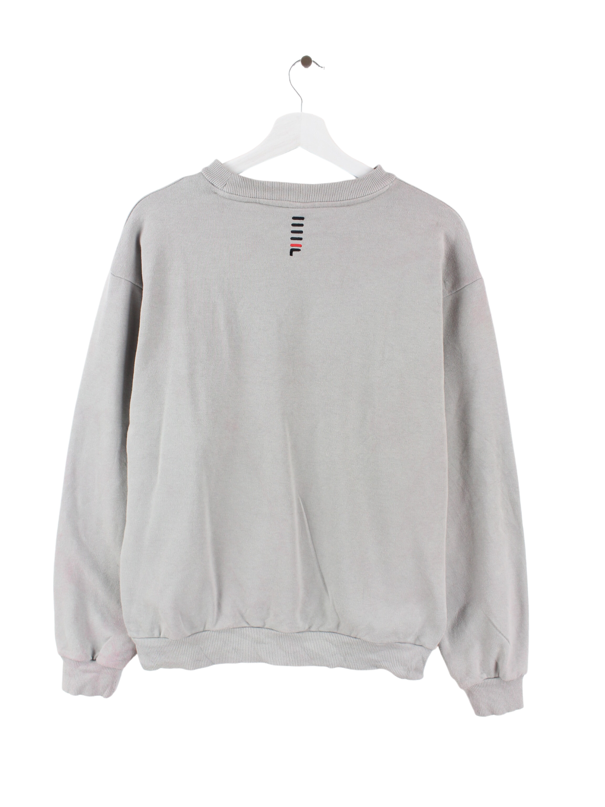 Grauer Fila Sweater mit rotem aufgesticktem Logo.