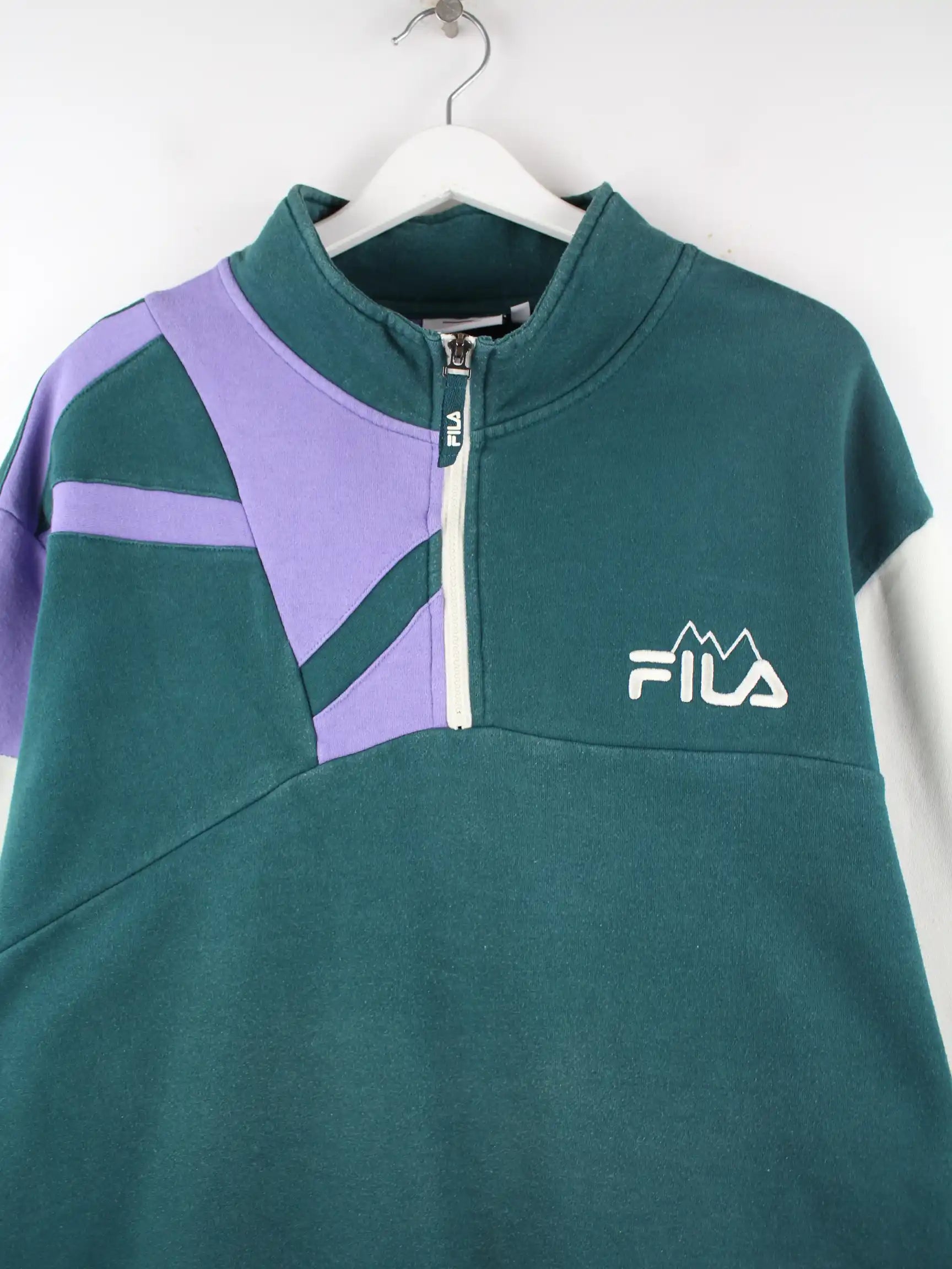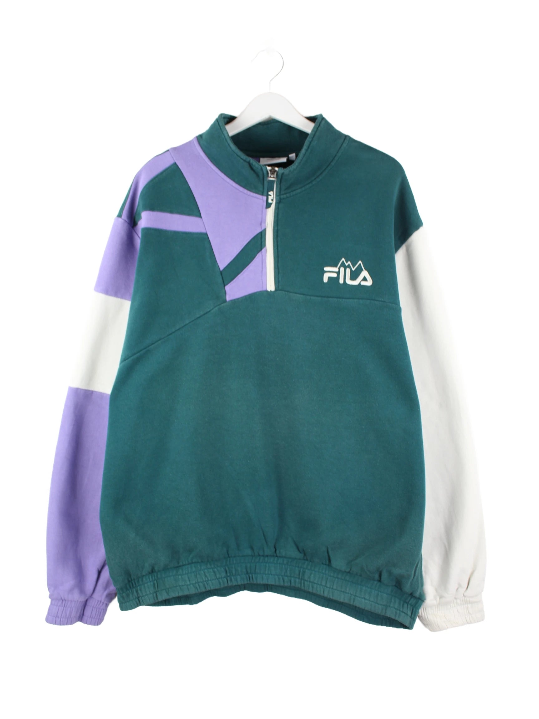 Grüner Sweater mit kurzem Reißverschluß der Marke Fila in Größe XL. Er ist aus einer Baumwollmischung produziert. Den Zustand würden wir als 'In Ordnung' bezeichnen (vergl. Bilder).