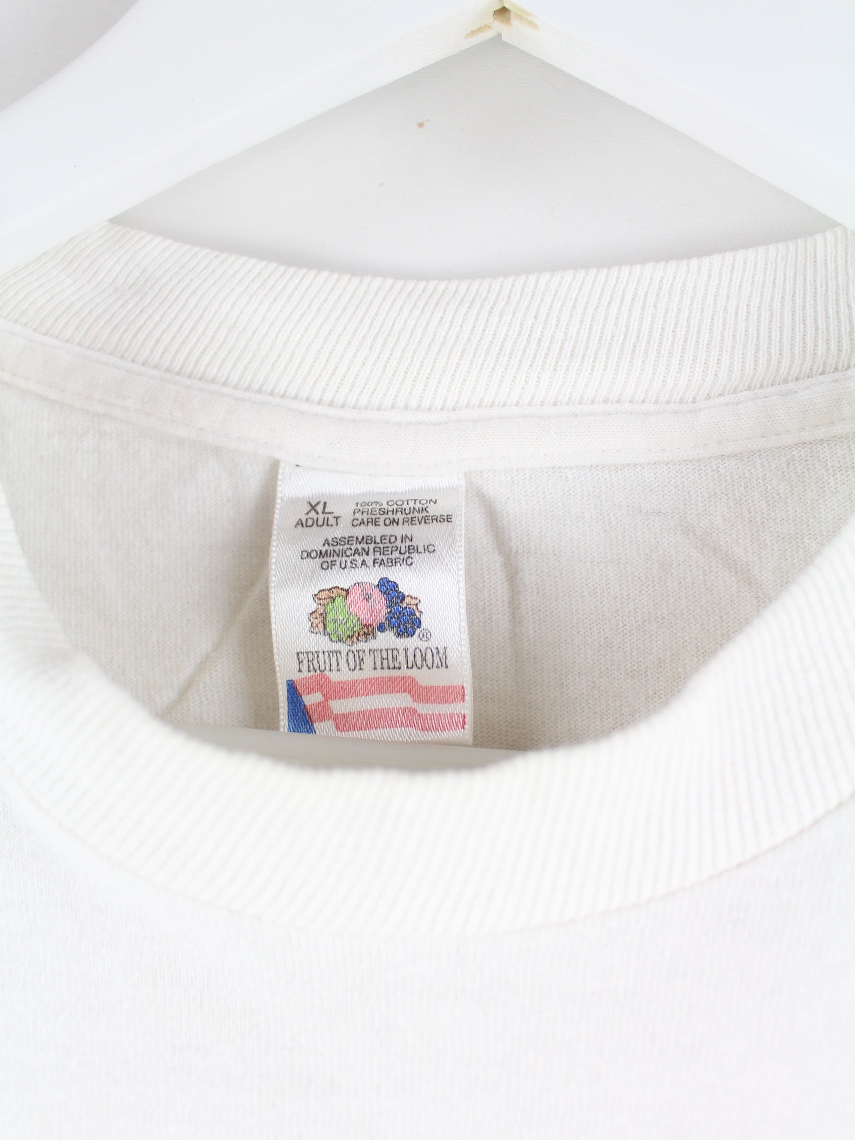 Weißes T-Shirt des Labels Fruit of the Loom aus den 80'ern in Größe XL. Es ist aus Baumwolle hergestellt und in sehr gutem Zustand zu bekommen. Mit schickem Switzerland Print.
