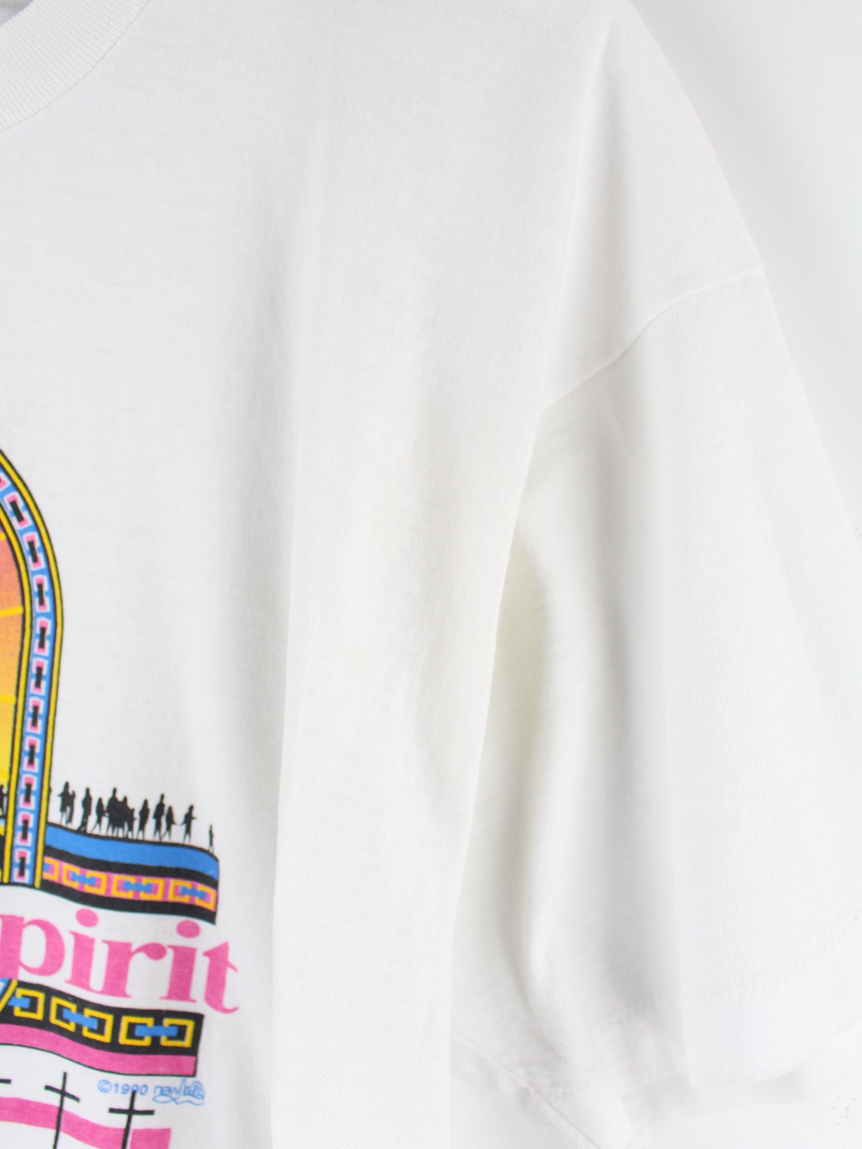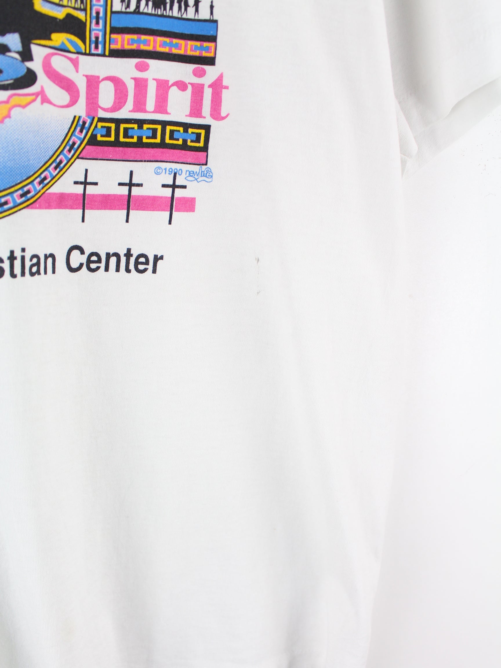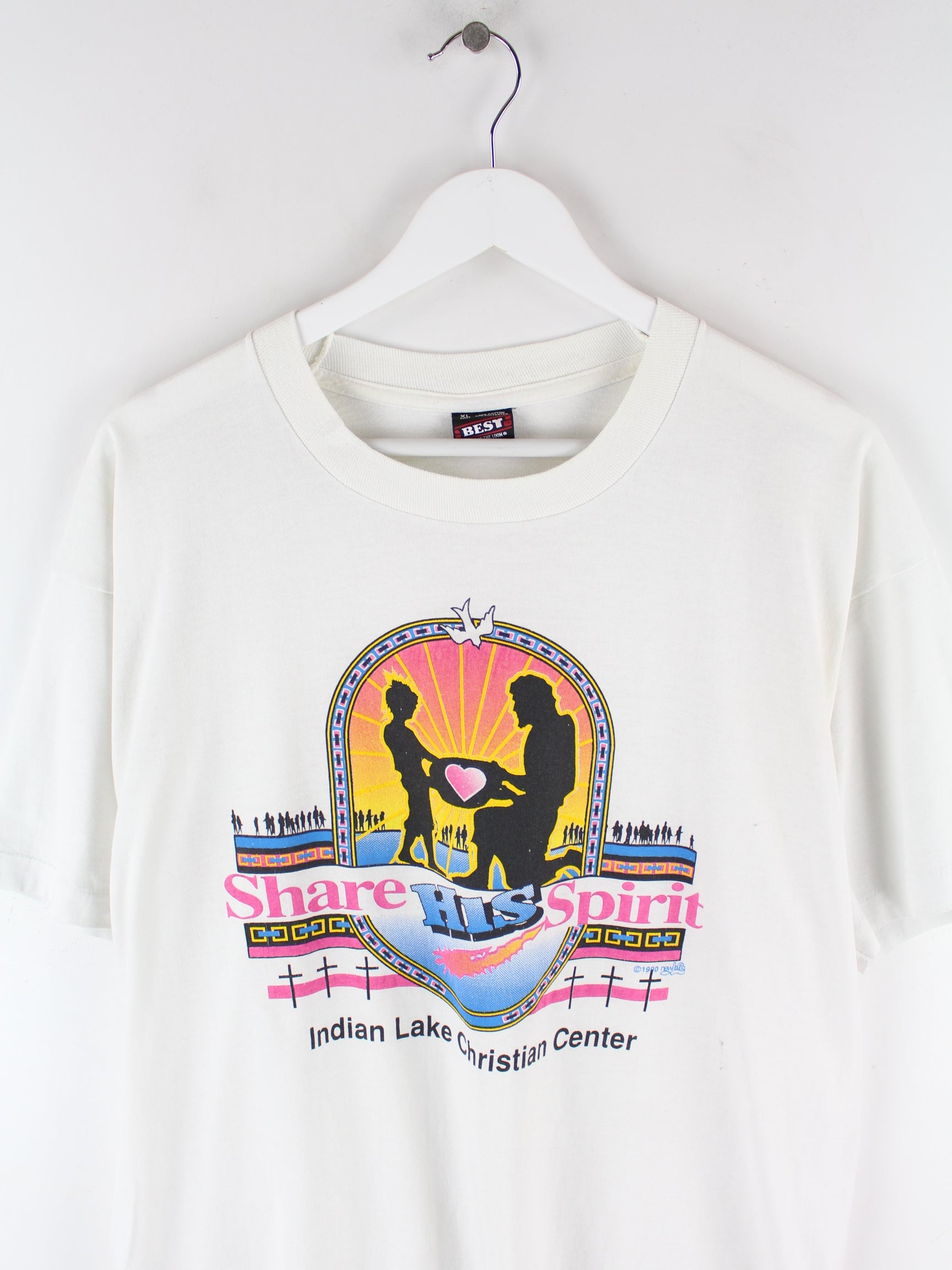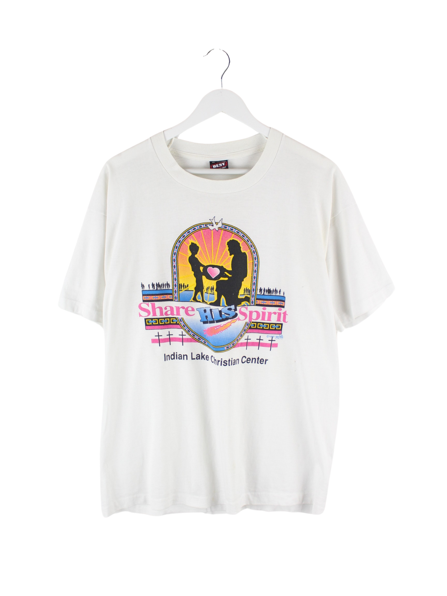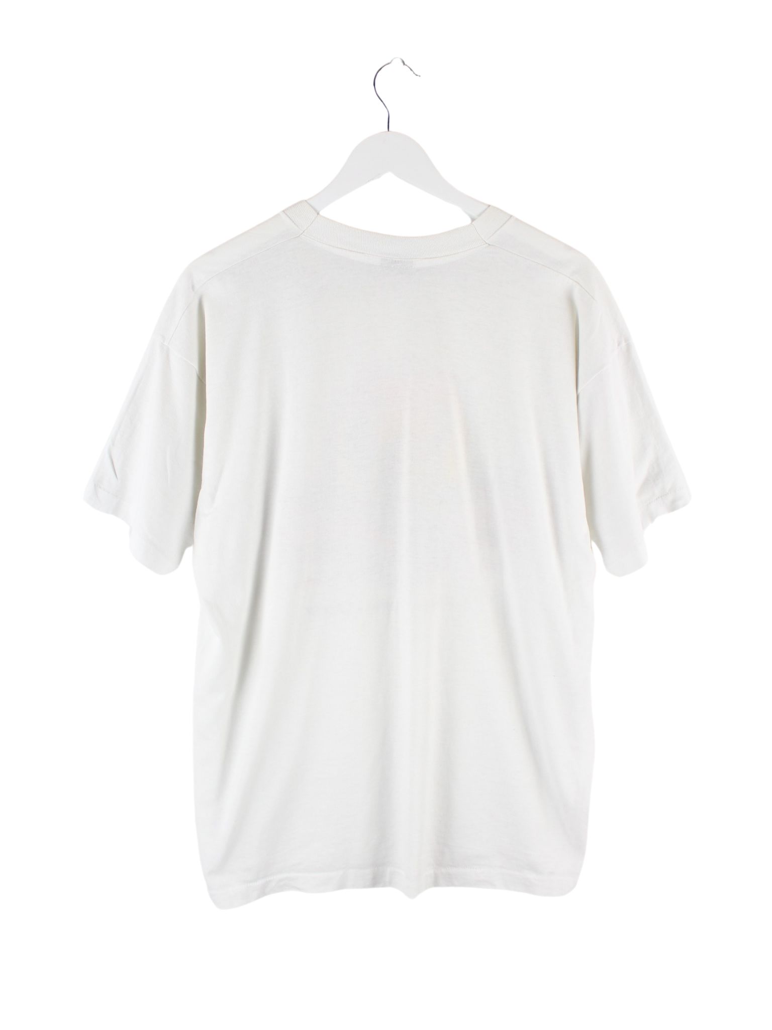 Weißes T-Shirt von Fruit of the Loom aus den 90'ern in Größe XL. Es ist aus Baumwolle hergestellt und in gutem Zustand vorrätig. Mit seltenem Sttch Print.