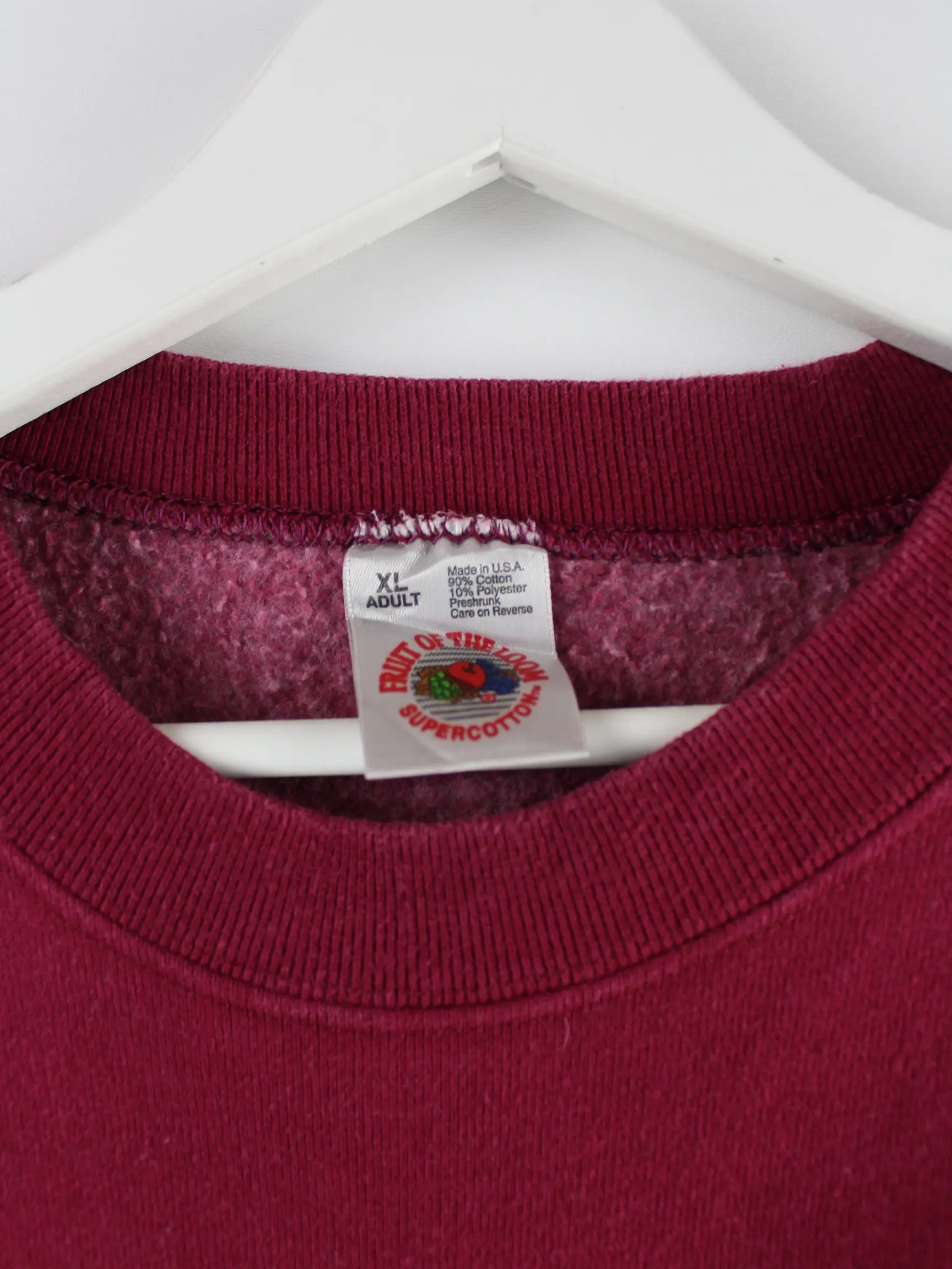 Roter Sweater vom Label Fruit of the Loom aus den 90'ern in Größe XL. Er ist aus einer Baumwollmischung angefertigt und in gutem Zustand bei uns zu bekommen. Mit schickem Football Print.