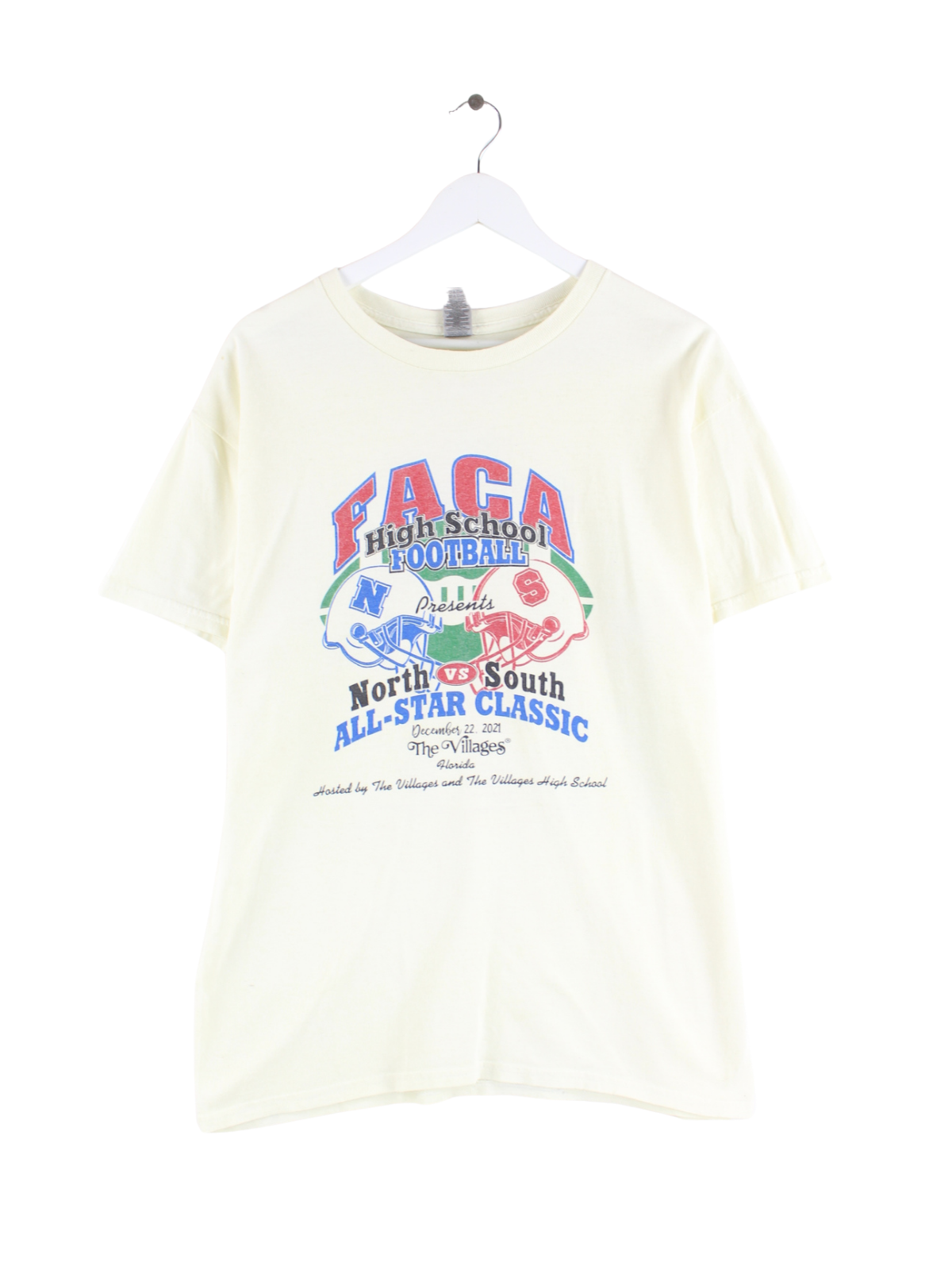 Beigefarbenes T-Shirt der Brand Gildan in Größe L. Es ist aus Baumwolle gemacht und in sehr gutem Zustand zu haben. Mit tollem Football Print.