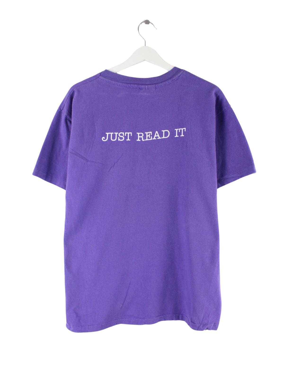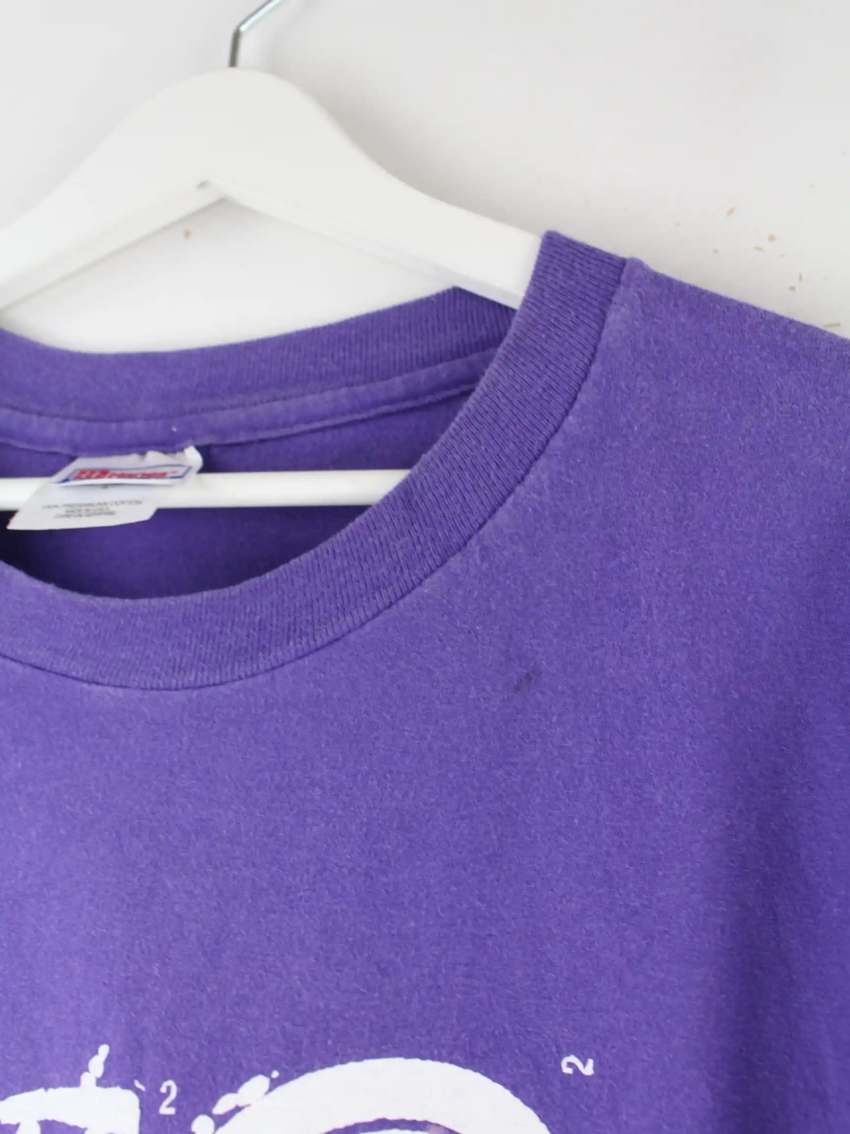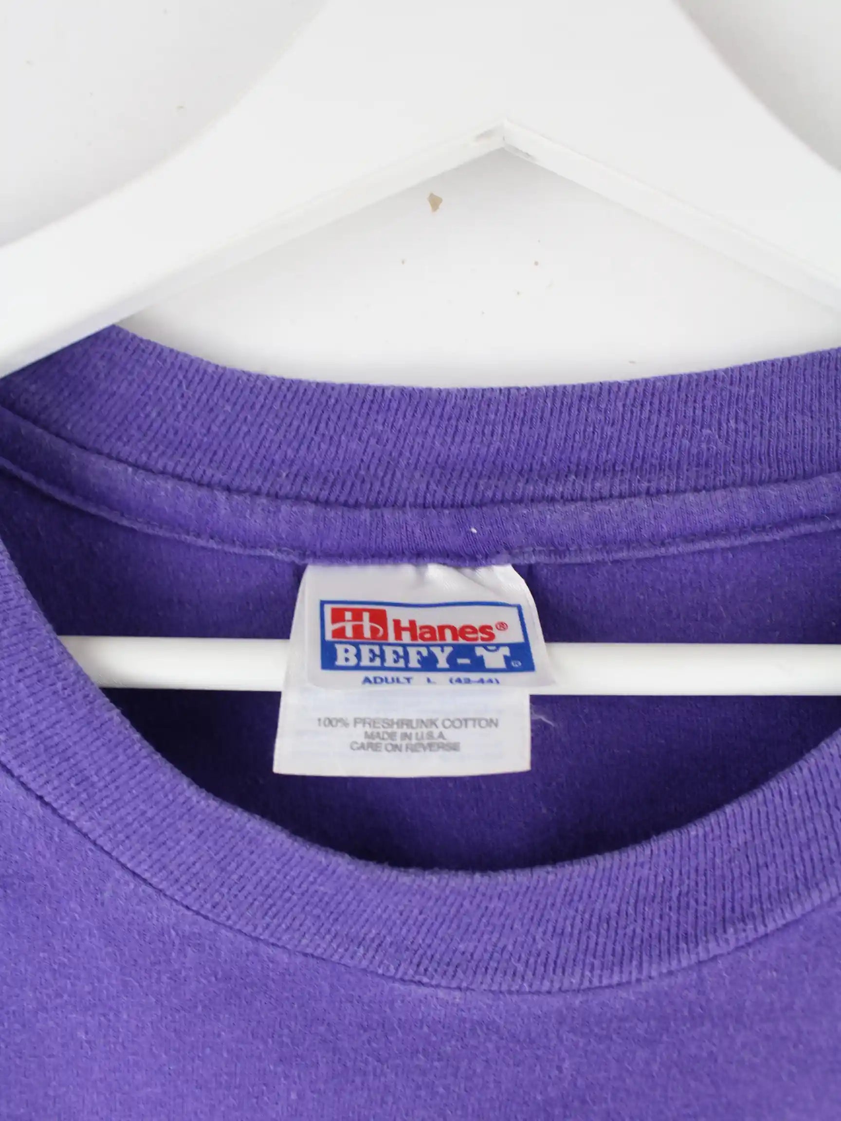 T-Shirt der Marke Hanes in Größe L. Es ist aus Baumwolle produziert und in Lila im Bestand. Mit chiquem 00s Print.