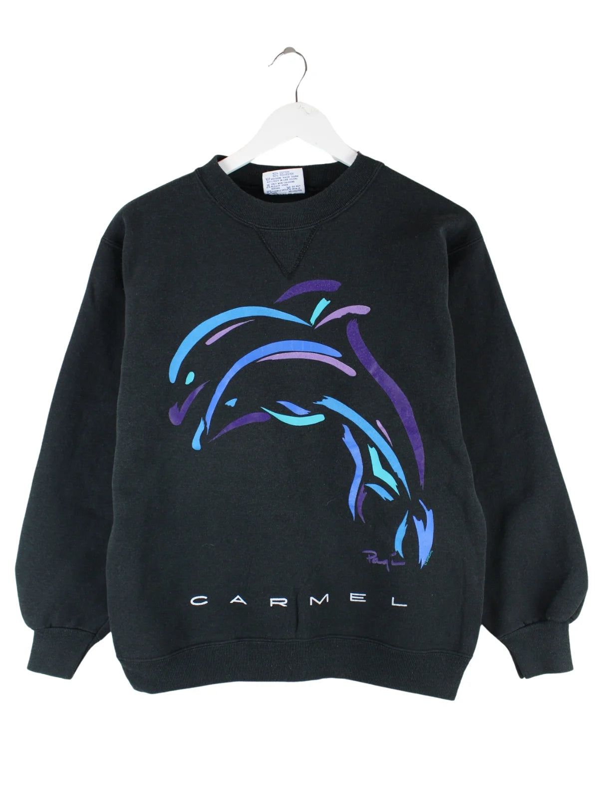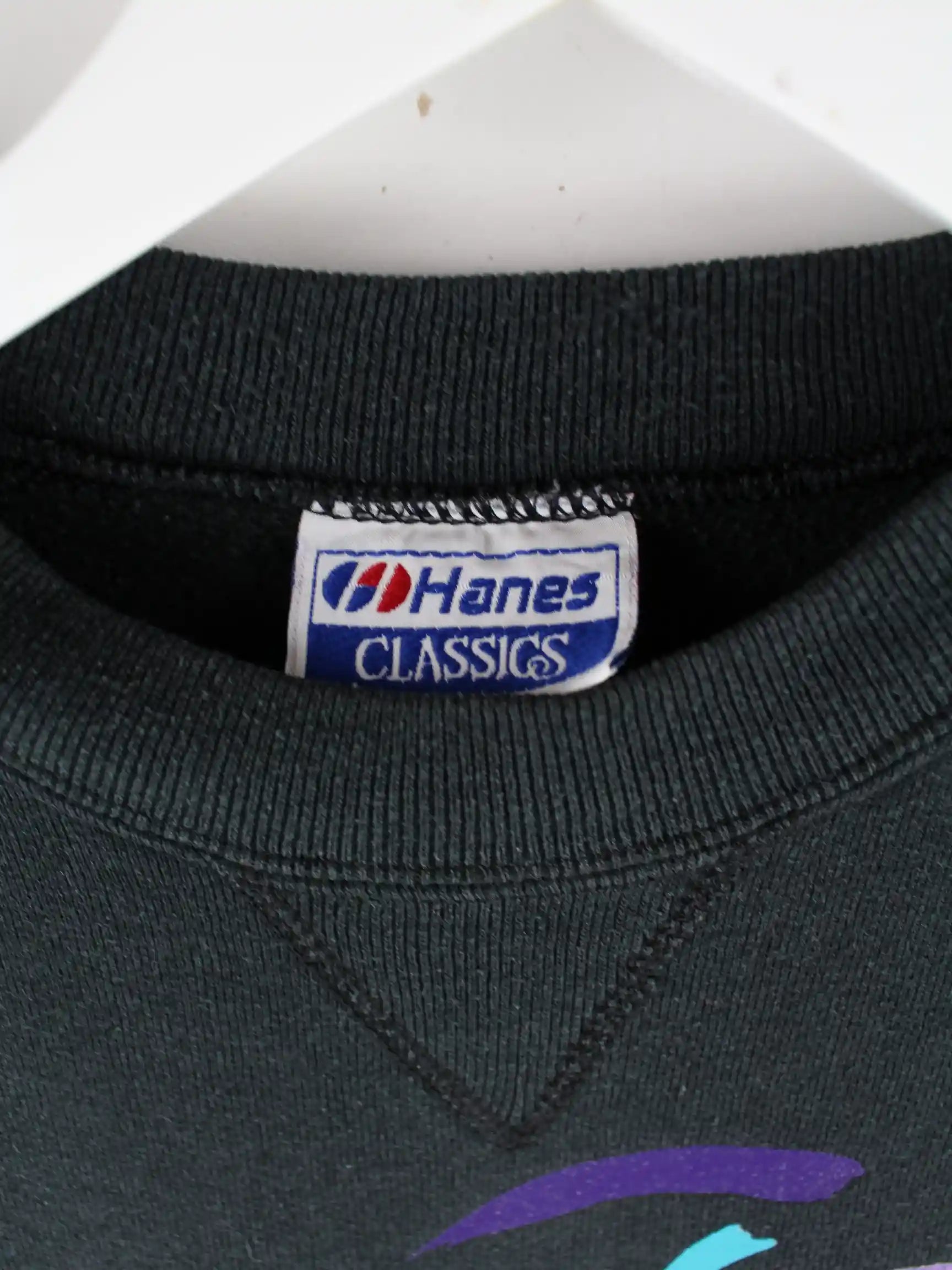 Sweater der Marke Hanes in Größe S aus den 90'ern. Er ist aus einer Baumwollmischung produziert und in Schwarz zu haben. Mit seltenem Carmel Print.