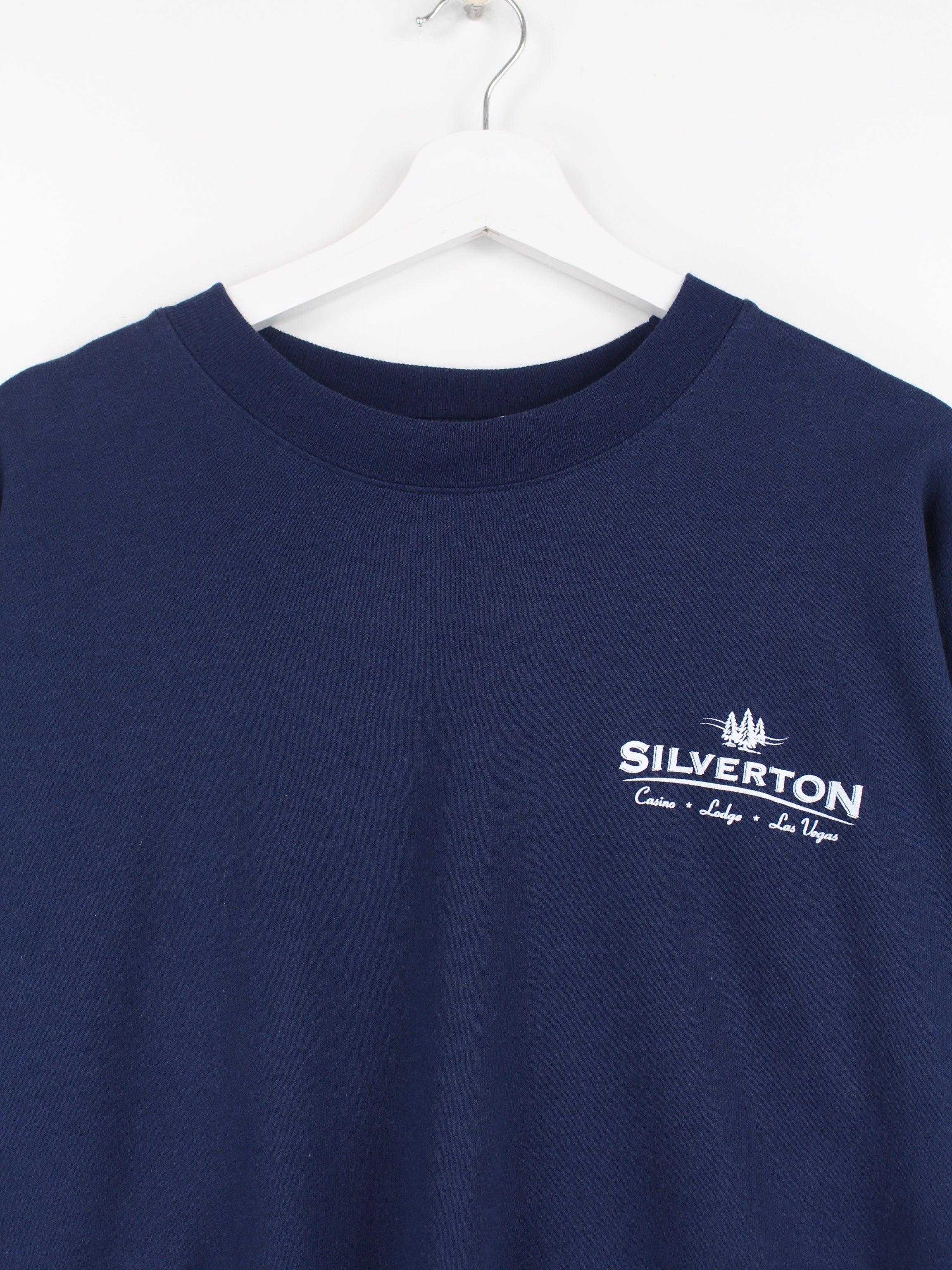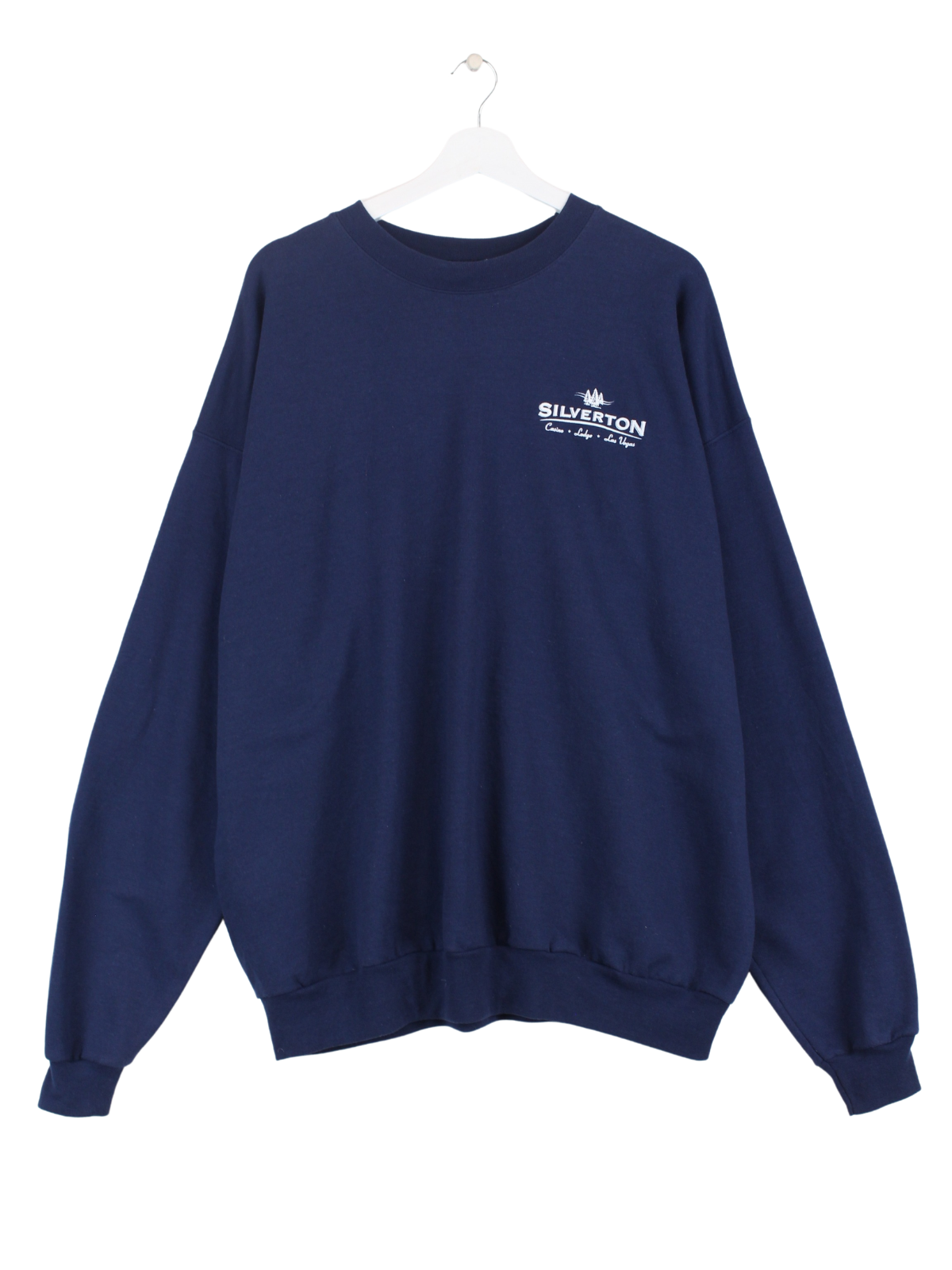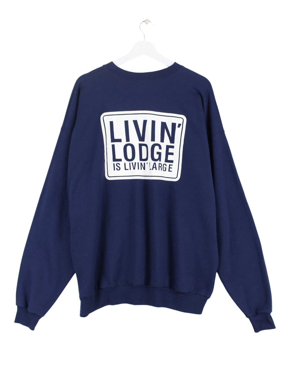 Blauer Print Sweater mit großem Logo auf dem Rücken.