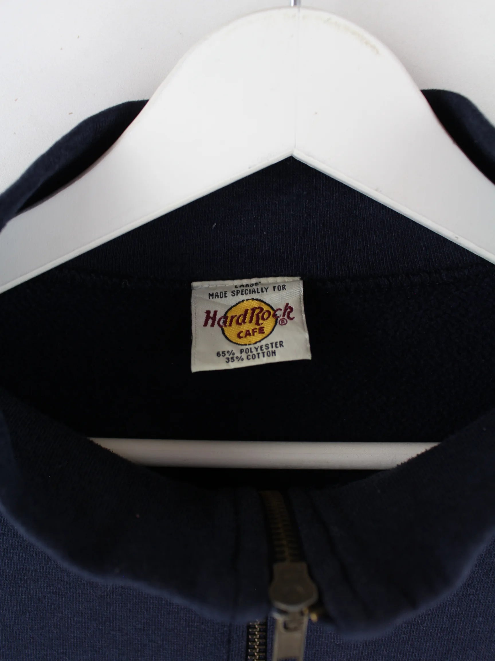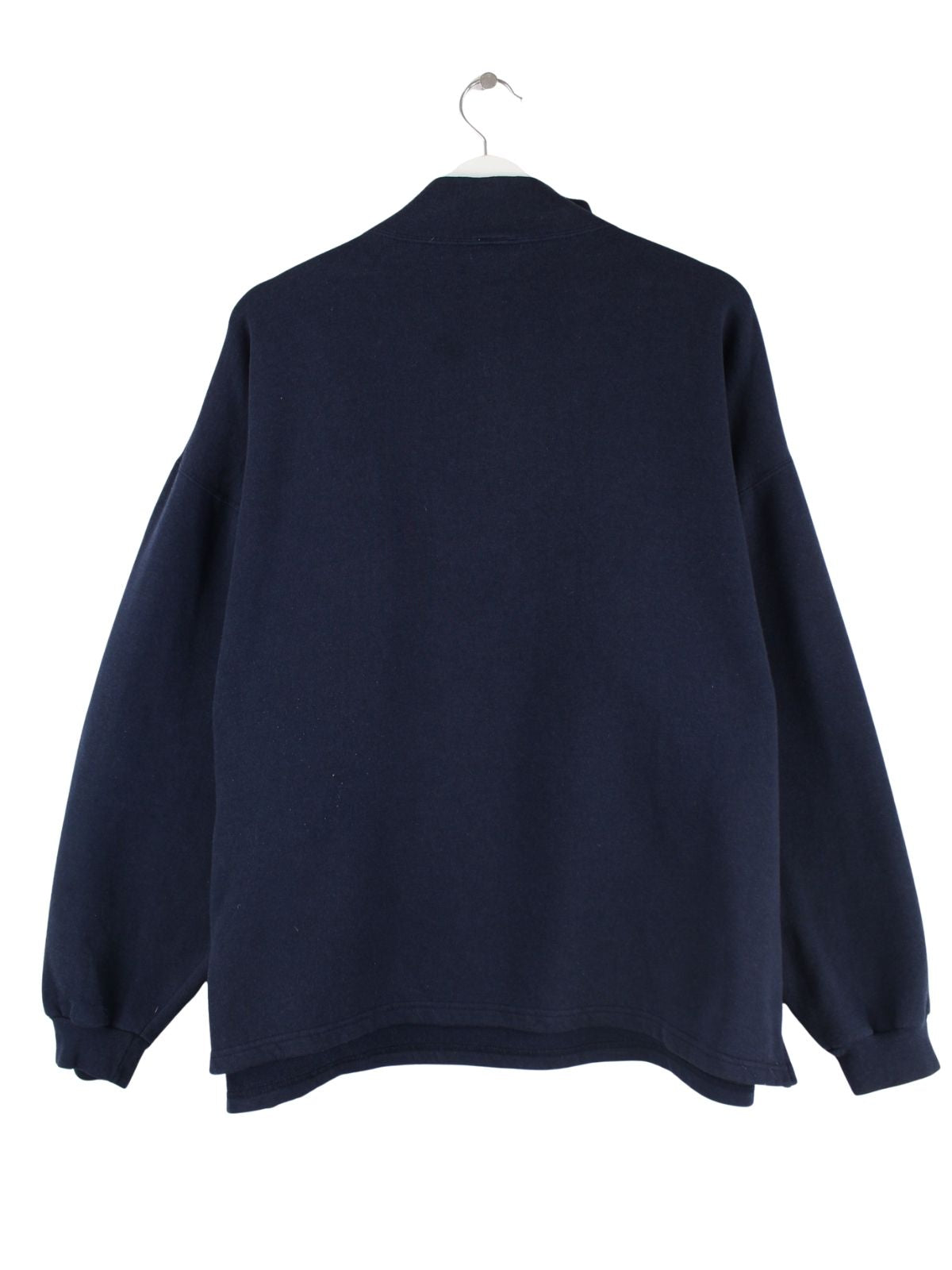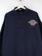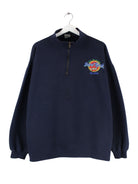 Sweater vom Label Hard Rock Cafe mit Stickereien und half Zip in Größe L aus den 90'ern. Er ist aus einer Baumwollmischung gefertigt und in Blau zu bekommen.